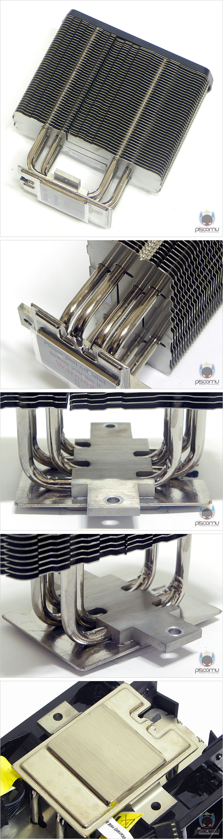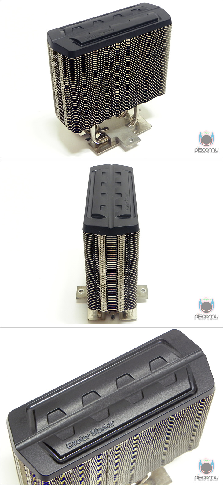 팬을 분리한 상태에서 순수 쿨러 상태만 살펴보면, 쿨러 폭이 상당히 슬림한 것을 확인할 수 있습니다. 폭은 약 50mm로 팬을 장착했을 때도, 105mm 폭정도만 가지게 됩니다. 이렇게 슬림한 구조는 메인보드의 메인보드 메모리 슬롯과의 간섭을 해결하기 위함으로 해석할 수 있습니다. 그리고, 방열핀 제일 상위에는 별도의 커버 디자인으로 처리를 했습니다. 히트파이프 구조는 전형적인 타워형 쿨러 구조인 U자형 구조를 가지고 있으며, 히트파이프는 지름 6mm로 총 4개가 사용되었습니다. 그리고, 베이스 부분의 상위 부분에는 장착에 필요한 마운트 처리를 통합으로 처리해놓았습니다. 또한, 히트파이프 아래에는 일반적으로 CPU와 맞닿는 베이스 부분으로 히트싱크만 처리되지만, 이번 V4 GTS는 앞서 시작에 말했듯이 수직 증기 챔버를 적용했기 때문에, 내부 증기 챔버를 담기 위한 넓은 면적의 히트싱크를 갖추고 있습니다. CPU와 맞닿는 베이스부분의 래핑 상태는 매끄럽게 잘 처리되어 있습니다.