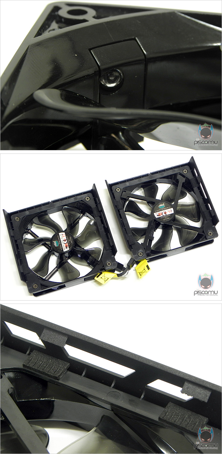 또한, 각 팬의 모서리 부분에는 각각 LED가 적용되어 있는데, 작동 시 RED(레드) LED 효과를 볼 수 있습니다. 그리고, 브라켓 안쪽을 보면, 팬이 브라켓에 장착된 방식은 일반 스크류 장착식으로 같은 크기의 다른 팬으로도 교체를 할 수 있습니다. 그리고, 쿨러와 장착되는 걸쇠 부분 위치에는 팬 작동 시 진동 소음 최소화를 위해 방진 패드를 기본 부착 해놨습니다.