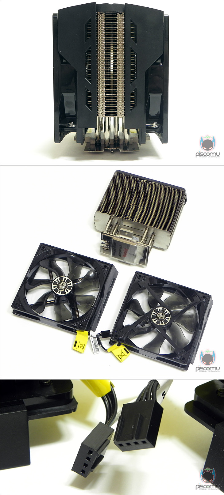 V4 GTS 쿨러를 살펴보면, 가장 먼저 눈에 띄는 점은 앞뒤로 120mm 팬이 기본 장착되어 듀얼 팬 구성을 기본적으로 하고 있습니다. 소비자 입장에선 추가적인 팬 비용 부담이 없어 좋습니다. 팬은 기존의 자사 제품들과 마찬가지로 브라켓 형식에 걸쇠 방식으로 장착되어 있습니다. 그리고, 쿨러를 측면에서 보면 팬이 장착된 높이가 위보다는 아래쪽으로 많이 내려와 있는 것을 확인할 수 있습니다. 이는 2가지로 해석할 수 있는데, 하나는 케이스 호환성을 높이기 위해 쿨러 높이를 낮추기 위함이고, 또하나는 이렇게 팬이 낮게 위치함으로써, 메인보드 전원부에 좀 더 간접적인 쿨링 영향을 높이기 위함으로 볼 수 있습니다. 또한, 쿨러의 높이 역시 147mm로 150mm가 되지 않아서, 기본 180mm 폭을 가진 미들타워에서도 간섭없이 장착이 되겠습니다. 팬을 분리해, 팬을 좀 더 살펴보면, 일단 2개의 팬 모두 연결 작동방식은 PWM 방식을 가졌으며, 팬 속도 범위는 600~1800RPM을 가졌습니다.