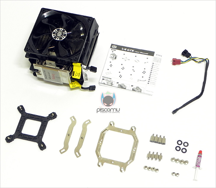 리뷰에 진행된 제품은 샘플 버전으로 제품 박스가 없기 때문에, 팩키지 부분은 생략하고, 간단하게 제품 구성을 살펴보면, 본 제품인 V4 GTS 쿨러를 비롯해, 장착 가이드, Y자 팬 연장케이블, 인텔 백플레이트 및 리텐션 플레이트, AMD 리텐션 플레이트, 볼트 및 너트, 와셔, 소량의 써멀컴파운드 제공으로 이루어져 있습니다.