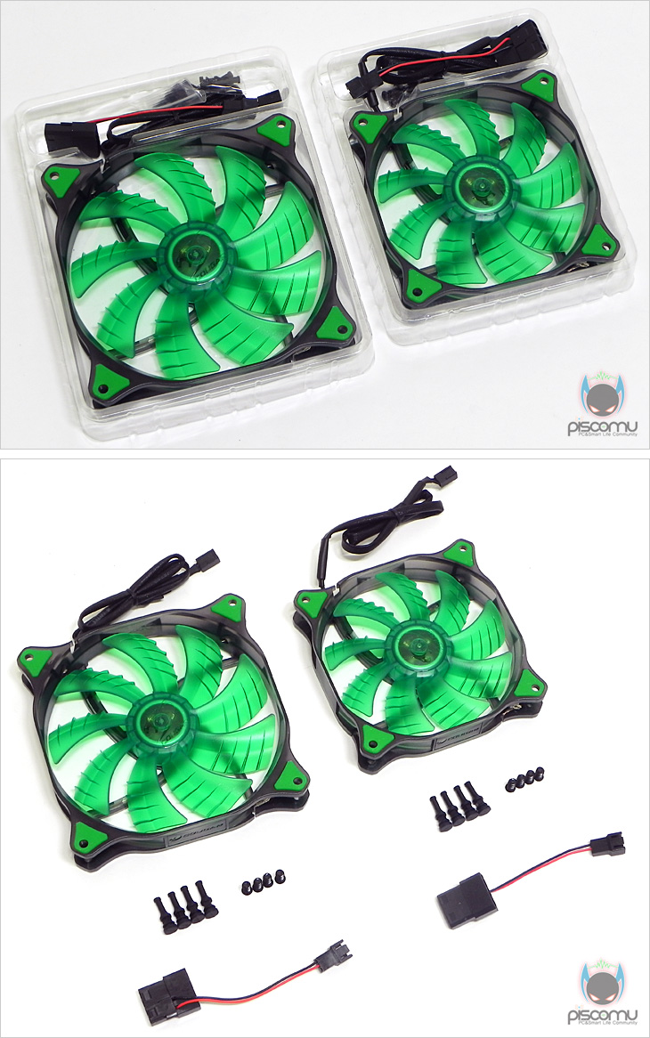 DUAL-X는 총 4가지 색상 Red, Blud, Green, White로 이 중 White는 한국에서만 출시가 되었습니다. 그리고, 한국에선 120mm만 출시되었지만, 140mm 모델도 있겠습니다. 또한, 포장방식 역시 국내에선 단순히 비닐 포장인 반면, 해외에선 박스형태로 포장이 되어 있겠습니다. 제품 박스를 통해서는 모델명을 비롯해, 내부에 포장된 팬의 색상을 확인할 수 있고, 제품의 베어링 표기와 컨셉 문구, 그리고 해당 제품의 간단한 스펙 사양을 확인할 수 있습니다. 박스 측면에는 해당 제품의 자사 자체 테스트 결과의 성능을 표기해두었는데, 표준 모델에 비해 풍량이 높다라는 것을 강조하고 있습니다. 박스 후면에는 제품의 특징 소개로 먼저, 4개국 언어로 디자인, 베어링, 방진 핀 기본 제공에 대해 언급하고 있으며, 추가 특징 소개는 이미지로 좀 더 쉽게 이해할 수 있게 해줍니다. 그리고, 맨 아래에는 해당 제품의 기본 스펙 사양을 앞부분보다는 좀 더 자세히 담고 있어, 소비자가 구입시 충분한 정보를 얻을 수 있겠습니다. 제품 포장은 크기에 맞춘 캡 형태로 깔끔하게 담겨져 있으며, 팬을 비롯한 제품 구성에는 방진 핀, 스크류, 4핀(P-ATA) 어댑터로 이루어져 있습니다.