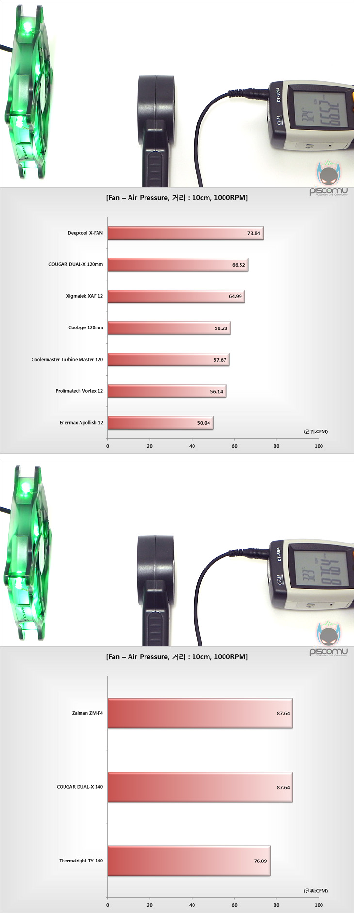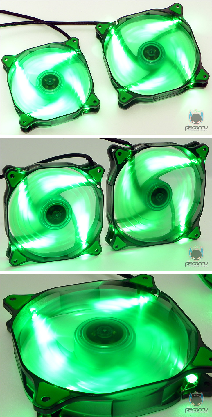 직접, DUAL-X를 사용해 보겠습니다. 진행 모델의 색상은 그린색으로 자동 시 각 모서리에 배치된 4개의 LED효과가 상당히 높은 것을 확인할 수 있는데, 이는 단순히 LED의 효과보다는 블레이드의 색상까지 LED색상과 동일하기 때문에 더 효과가 크다 할 수 있습니다. 그리고, 블레이드에 처리된 4개의 발톱 디자인으로 작동 시 4개의 원형 라인이 생기는 것도 확인할 수 있으며, 외곽 베젤이 약간 불투명해 좀 더 LED효과를 높여준다 할 수 있습니다. LED 효과는 상당히 만족스럽다 할 수 있습니다. 먼저, 팬 소음을 측정해보면, 140mm와 120mm 모두 약 45dB(A) 수준으로, 실생활 소음도 기준으로 봤을 때, 정숙한 편에 속한 것을 알 수 있습니다. 실제, 140mm 모델은 1000RPM, 120mm모델은 1200RPM으로 작동하기 때문에, 소음면에서 그리 높지 않을 것을 예상할 수 있습니다. 또한, 실제 케이스에 장착된 경우라면 좀 더 낮은 소음대를 보여질 것으로 생각됩니다. 끝으로, DUAL-X의 팬 풍량을 확인해보는데, 비교 모델들 역시 DUAL-X 모델과 동일한 속도로 설정한 후 풍량을 확인해 본 결과, 기본적으로 많이 사용되는 120mm 경우엔 66CFM으로 상위 수준의 풍량을 보여주는 것을 확인할 수 있으며, 140mm는 크기가 있어 이보다 더 높은 많은 풍량을 가진 것을 확인할 수 있습니다. 두 모델 모두 낮은 속도에 비해 풍량이 높은 편임을 알 수 있습니다.