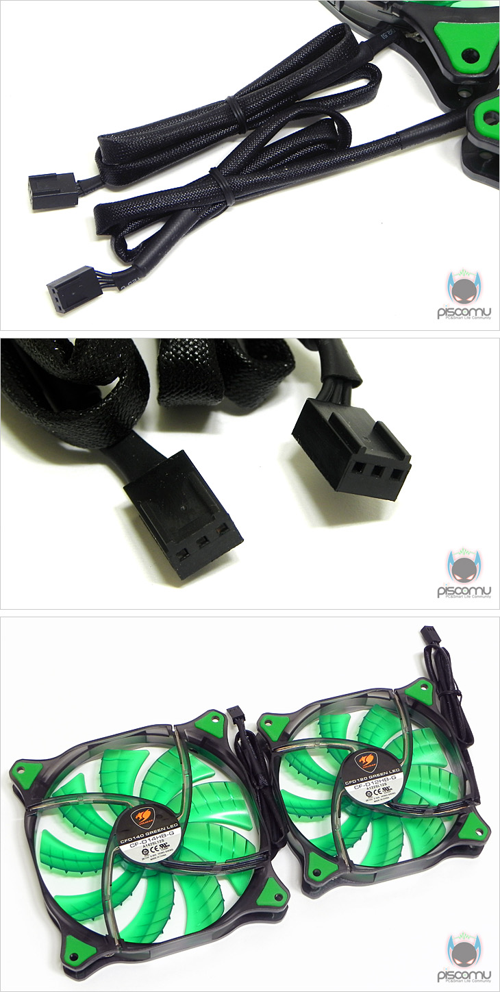 DUAL-X를 외형적으로 살펴보면, 140mm와 120mm 색상과 디자인을 동일합니다. 단지, 크기의 차이만 있겠습니다. 그리고, 팬의 블레이드(날개)는 총 9개로 이루어져 있습니다. 블레이드 중심부에는 제조사 로고가 새겨져, 일반적인 스티커 부착과는 차별화를 줬습니다. 블레이드 디자인을 살펴보면, 일반적인 민무늬 형태가 아닌 한번 굴곡이 생긴 형태와 지느러미 또는 발톱 모양 같은 디자인을 확인할 수 있는데, 이는 모두 풍량을 높이면서, 소음을 줄이기 위한 디자인이라 할 수 있습니다. 그리고, 팬 외곽 베젤 각 모서리 안쪽에는 LED가 적용된 것을 확인할 수 있어, 작동 시 튜닝효과를 기대할 수 있게 해줍니다. 그리고, 팬 작동 시, 발생하는 진동 소음을 줄이고자 장착부에는 일반 베젤 형태 그대로가 아닌 고무 패드를 적용시켜놨습니다. 이는 최근에 일부 다른 제조사에서도 적용하는 부분이기도 합니다. 그리고, 베젤 형태는 약간 불투명한 처리와 제조사 로고를 새겨 처리했는데, 이 역시 LED에 의한 튜닝효과를 좀 더 극대화하기 위함으로 해석할 수 있습니다. 팬 케이블 경우는 모두 깔끔하게 슬리빙 처리를 했으며, 길이는 총 450mm가 되겠습니다. 그리고, 기본 팬 연결 작동방식은 3핀(Pin) 방식이 되겠습니다. 끝으로, 팬 후면에는 일반 팬들과 마찬가지로 모델명을 확인할 수 있습니다.
