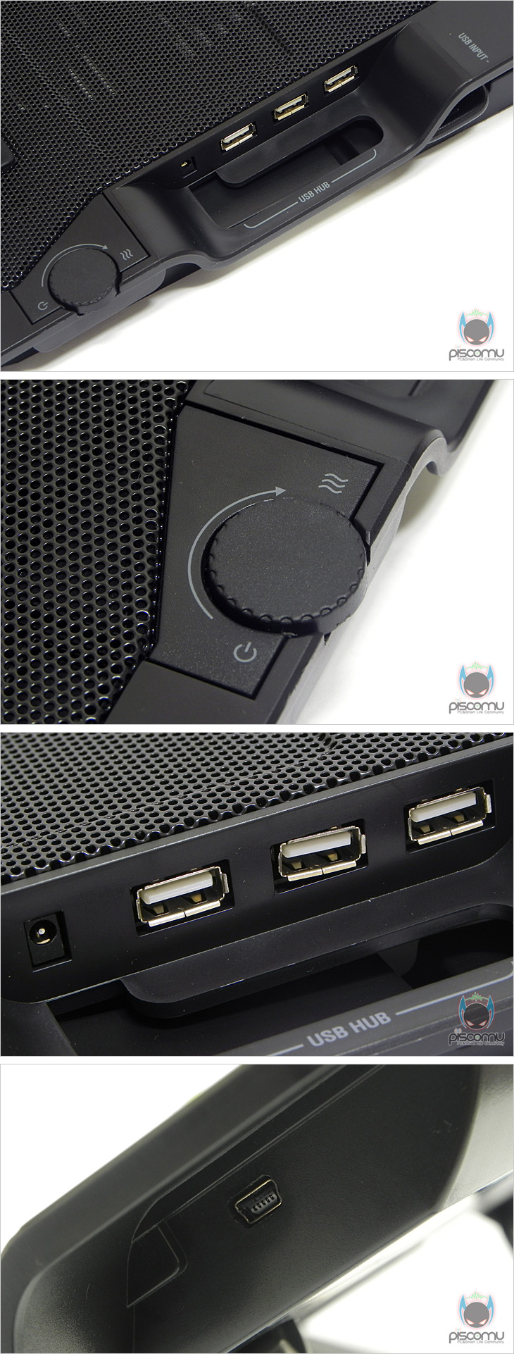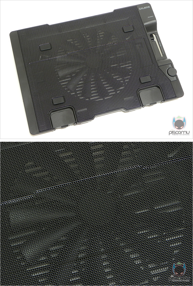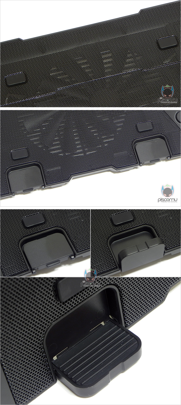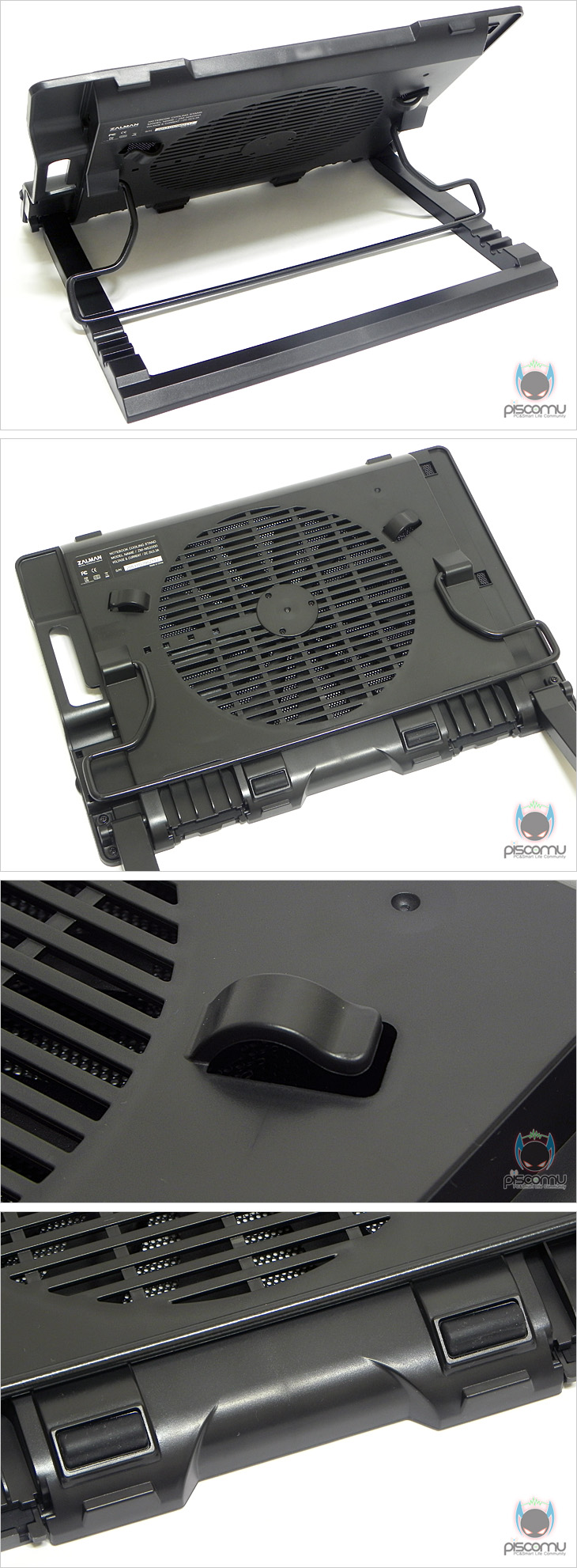 ZM-NS2000를 살펴보면, 전체적인 색상은 가장 기본적인 블랙을 가지고 있으며, 노트북이 올려지는 상판부분은 전체적으로 메쉬(타공망) 처리와 함께 내부에 200mm 대형 팬이 적용되어 노트북에 전체적으로 쿨링 효과를 주도록 했습니다. 팬 속도는 470~610PRM으로 낮은 편이라, 소음은 크지 않을 것으로 생각됩니다. 또한, 노트북을 올려놓을 시, 미끄러지지 않게 각 모서리 부근에 고무패드를 부착해놨으며, 하단부에는 노트북을 받칠 수 있는 받침대도 적용되어 있습니다. 받침대는 접이식으로 받침 안쪽에 역시 기본적으로 고무패드가 적용되어 노트북이 잘 움직이지 않도록 했습니다. 쿨러 오른쪽에는 부가기능들이 적용되어 있는데, 먼저 아래쪽에는 다이얼식의 팬 컨트롤러로 팬 속도를 조절할 수 있으며, 바로 위에는 USB 허브 지원으로 총 3개의 포트가 지원됩니다. 그리고, 왼쪽에는 추가 전원을 지원할 수 있게, DC 전원포트가 배치되어 있습니다. USB 허브 위에는 USB 전원 포트 자리로 제공되는 USB 전원 케이블을 연결 사용하면 됩니다. 이 밖에, ZM-NS2000은 총 4단계의 높낮이 조절이 가능한데, 가장 낮은 기본 높이 7.5°부터 20°, 30°, 45° 높이로 각도 조절을 할 수 있습니다. 이런 각도 조절은 최근 모니터, 노트북, 타블렛PC, 스마트폰에서 발생되는 거북목 증후군을 방지하기 위해 지원되었습니다. 그리고, 쿨러 후면을 통해 각도가 가장 높을 때, 외부 공기 유입이 가장 많을 것을 짐작할 수 있으며, 후면 상위 양쪽에는 케이블을 정리할 수 있는 홀더 장치가 처리되어 있는 것을 확인할 수 있습니다. 또한, 후면 아래쪽에도 받침 역할로 고무패드가 부착된 것을 확인할 수 있습니다. 끝으로, 쿨러 받침 역할을 하는 받침대 밑면을 살펴보면, 받침대 역시 기본적으로 미끄럼방지를 위해 긴 고무패드를 양쪽에 부착된 것을 확인할 수 있습니다.