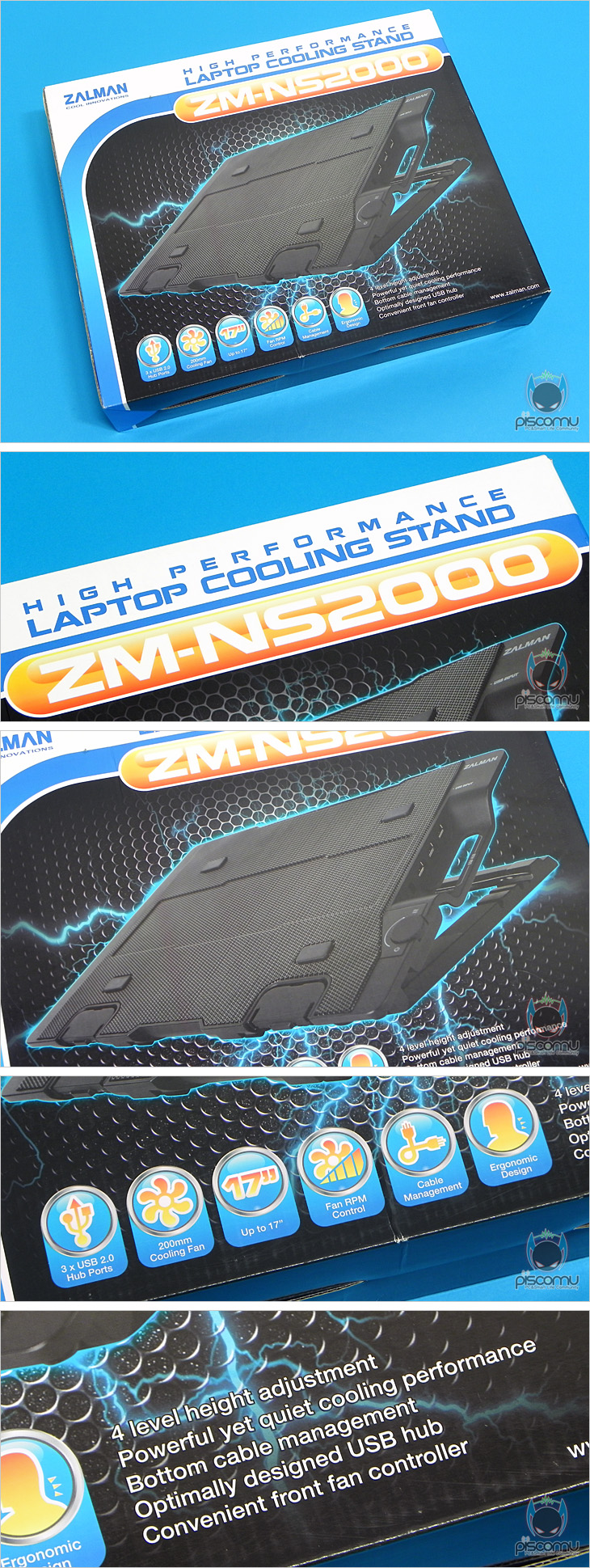 ZM-NS2000 역시 앞서 잘만의 다른 노트북 쿨러 제품들과 마찬가지로 제품 박스에 해당 제품의 이미지가 삽입되어 디자인을 미리 알 수 있습니다. 그리고, 총 6가지의 특징을 소개하고 있는데, USB 2.0 포트, 대형 쿨링팬, 최대 17인치 지원, 팬 컨트롤러, 케이블 관리, 인체공학적 디자인을 언급합니다. 또한, 다른 제품들과 마찬가지로 이동 시 편의를 위해 손잡이가 적용되어 있습니다. 박스 후면에는 좀 더 자세히 제품 소개를 하고 있는데, 각 나라별 언어 소개와 제품 이미지를 통한 소개, 그리고, 해당 제품의 기본 스펙 정보를 확인할 수 있습니다. 제품 포장은 기본 포장식이라 할 수 있는 스티로폼을 이용한 포장으로 외부 충격에 의한 파손 방지를 해주겠으며, 쿨러를 비롯한 제품 부속품에는 설명서, USB 전원 케이블이 제공됩니다.