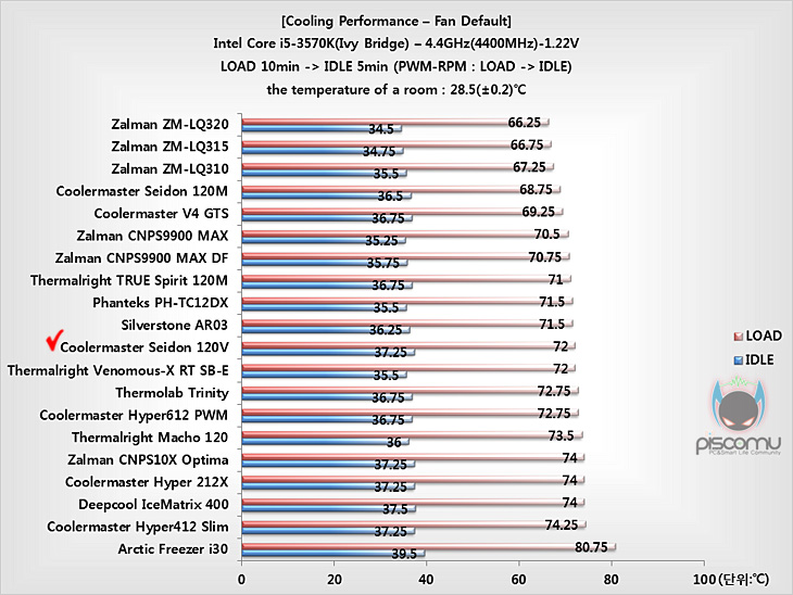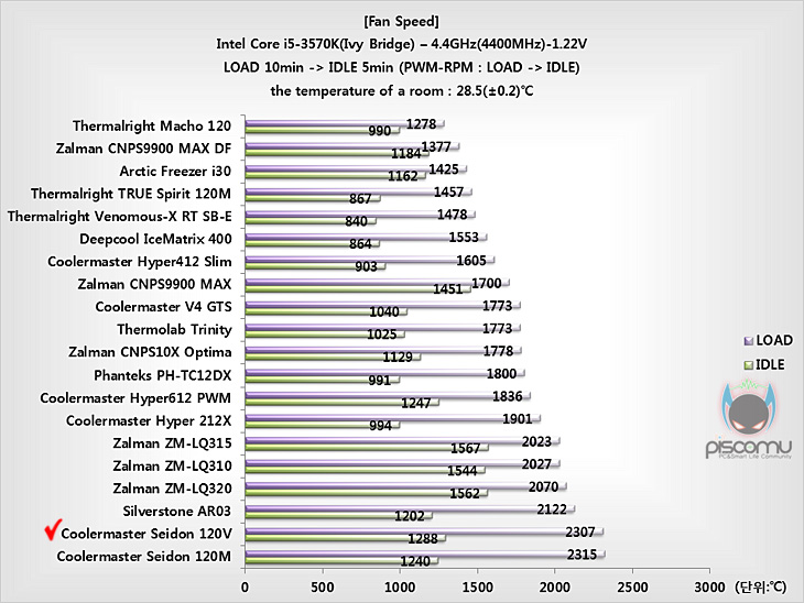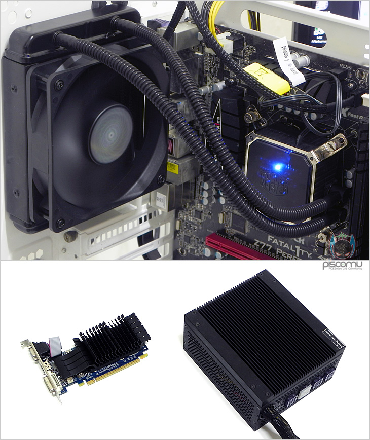 이제, Seidon 120V의 성능을 확인해보는데, 시스템 기반은 인텔 아이비브릿지(i5-3570K)로 일체형 수냉 쿨러는 고성능 쿨러에 속하기 때문에, 프로세서는 바로 오버클럭(4.4GHz) 상황에서 진행됩니다. 실내온도를 최대한 유지한 상태에서, 프로세서의 LOAD, IDLE 온도 변화와 작동 시, 팬의 속도, 그리고 쿨러의 전체 소음을 측정 확인하는 순으로 진행됩니다. 일반 소비자들이 사용하는 기준 환경을 위해 팬 연결은 메인보드 PWM 커넥터에 그대로 연결했습니다. 소음 측정을 위해 VGA와 파워서플라이는 팬이 없는 팬리스(Fanless)로 구성했습니다. 그리고, 작동을 하게되면 워터블록에 블루LED 효과를 볼 수 있습니다.