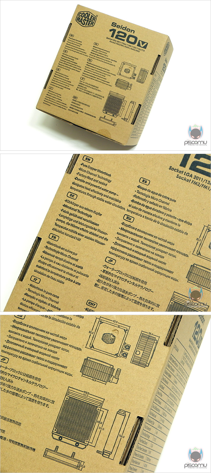 Seidon 120V은 제품 박스에서부터 기존 모델과 가격부분에서 저렴하다라는 것을 느낄 수 있습니다. 기본 모델들에선 블랙 색상 박스에 디자인 요소가 많이 가미 되었지만, 이번 모델은 단순히 기본 박스 색상에 인쇄 형태만 적용되어 있습니다. 하지만, 제품 이미지와 모델명, 소켓 지원, 제품의 특징은 담겨줘 있습니다. 또한, 박스 측면에는 해당 제품의 기본 스펙 정보를 확인할 수 있는데, 라디에이터 크기와 워터블록 크기부터, 기본 제동되는 팬의 크기와 소음, 속도 등 자세히 표기가 되어있어, 소비자가 구입하기 전, 충분히 정보를 얻을 수 있습니다. 또한, 박스 후면에는 각 나라별 언어의 제품 특징 소개와 함께 제품크기를 부분별로 나뉘어 이미지로 보여주고 있어, 좀 더 쉽게 이해할 수 있습니다.