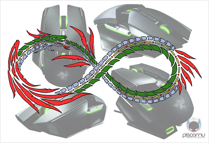 자신의 꼬리를 먹는/문 뱀/용을 의미하는 우로보로스(Ouroboros)는 고대 신화 등 여러 사상에 등장했으며, 시작과 끝을 의미하기도 하고, 물질의 근원으로도 해석되고 있지만, 가장 많이 해석되는 의미는 무한(無限)입니다. 레이저의 우로보로스(Ouroboros)는 역시 그만큼 마우스의 무한한 능력을 보여준다라는 의미로 모델명이 부여된 것이라 할 수 있습니다.