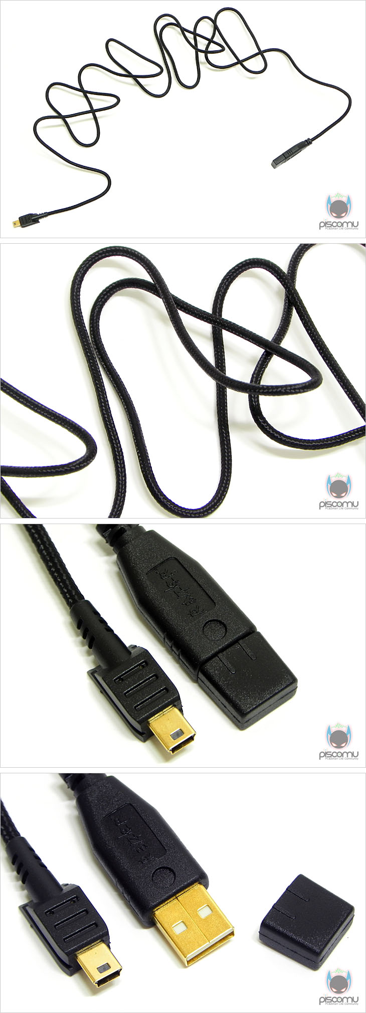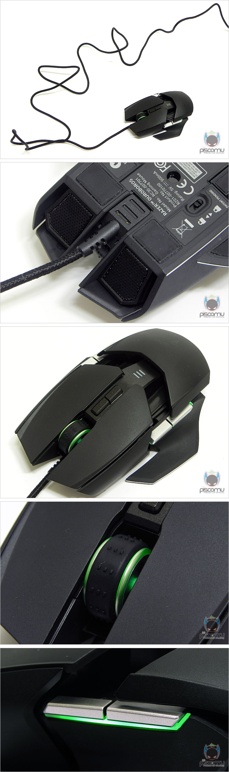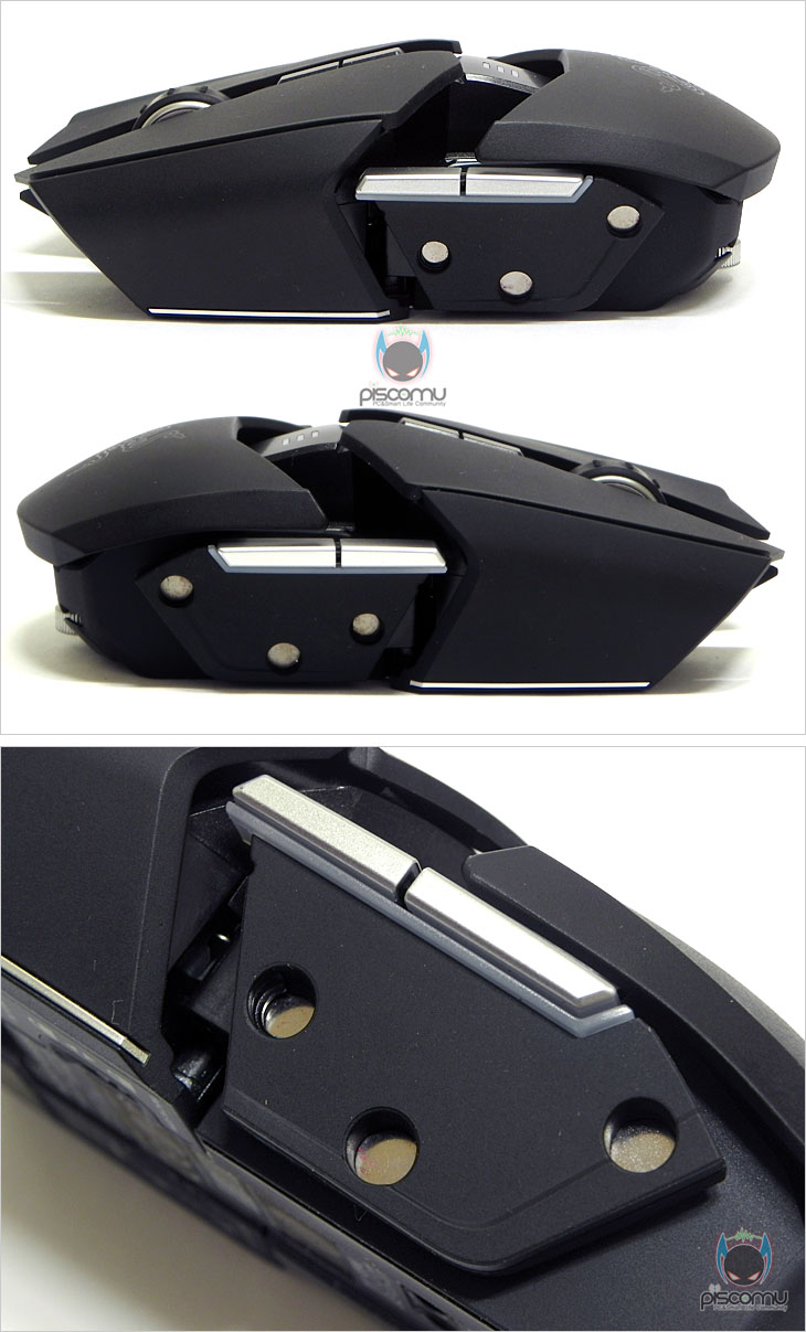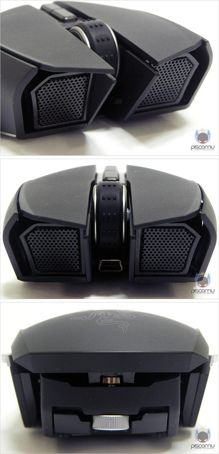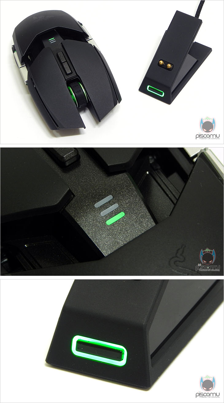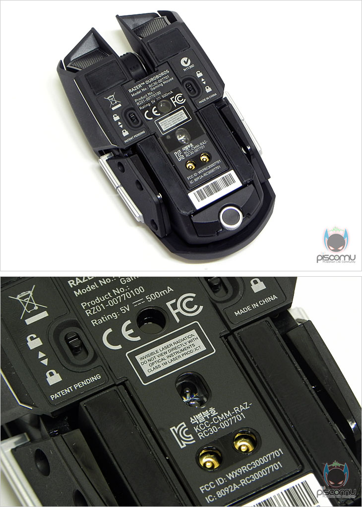 마우스 전면에는 메쉬(타공망) 처리가 되어 있으며, 가운데 휠-버튼 아래에는 제공되는 USB 케이블과 연결되는 USB 포트를 확인할 수 있습니다. 후면에는 마우스 손바닥 그립 부분이 팜-레스트 높낮이 조절을 할 수 있는 스크류를 확인할 수 있습니다. 우로보로스(Ouroboros)의 또 하나의 특징은 그립 유형에 따라 팜레스트 높낮이와 길이 조절을 할 수 있다라는 점인데, 일단, 높낮이 경우 후면 밑부분에 배치된 스크류를 좌우로 최대 약 14번 반바퀴 정도 돌리면서 팜-레스트 높낮이를 조절할 수 있습니다. 손바닥 그립 비중이 높은 팜-그립일 경우엔 높게, 손가락 비중이 높은 핑거-그립에선 낮게 설정을 하면 됩니다. 또한, 높낮이 조절과 동시에 그립 유형에 따라 팜-레스트의 앞뒤 길이 조절도 가능한데, 높낮이 조절 스크류 주변부를 눌러주면, 팜-레스트 길이를 최대 5단계로 길이 조절할 수 있습니다. 기본 길이에서 최대 16mm까지 늘어납니다. 즉, 높낮이와 길이 조절을 자신의 그립 유형에 따라 최적으로 맞춰 설정할 수 있겠습니다. 그리고, 팜-레스트를 분리했을 때, 무선 사용을 위한 충전지 삽입구를 확인할 수 있는데, 제공되는 AA건전지를 사용하면 무선으로 사용할 수 있습니다. 제공되는 AA건전지는 충전지로 용량은 2500mAh로 일반 충전지 용량에 비해 많은 편이며, 한 번 충전으로 최대 12시간 사용이 가능하겠습니다. 물론, 동일한 배터리타입의 일반 충전지도 사용이 가능합니다. 마우스 밑면에는 앞부분과 가운데 양쪽 자리에 부드러운 움직임을 위해 기본 테프론 피트를 부착해놨으며, 앞부분 피트 바로 아래에는 좌우 측면 버튼 인식을 잠금 해제 할 수 있는 스위치가 배치되어 있습니다. 그리고, 가운데는 레이저 센서로 2개의 센서가 적용된 듀얼 센서를 갖추고 있습니다. 이미 여러 리뷰에서 알려진 대로, 센서는 Avago사의 ADNS-9800 센서를 레이저 마우스 전용으로 변형한 4G 센서로 최대 8200DPI를 지원합니다. 그리고, 센서 아래에는 충전 도크와 연결되는 접지 부분이 배치되어 있습니다. 끝으로, 무선 사용시 리시버 역할과 충전지 충전시 거치대 역할을 하는 충전도크를 살펴보면, 약 30° 경사를 가진 거치대 형태로 충전 시 마우스 밑면의 접지부분과 접촉되는 거치대 접지를 확인할 수 있으며, 바로 전면에는 리시버 상태를 확인할 수 있는 LED 램프가 배치되어 있습니다. 그리고, 후면에는 USB 전원케이블과 연결되는 USB 포트를 확인할 수 있습니다. 그리고, 미끄럼방지를 위해 밑면에는 고무패드가 부착되어 있겠습니다. 유선 사용시와 충전도크 연결시 사용되는 USB전원케이블의 길이는 2m로 충분한 길이를 가지고 있으며, 케이블 전체는 깔끔하게 슬리빙 처리가 되어 있습니다. 또한, 양쪽 USB 포트부분에는 신호손실을 최소화하기 위해 금도금 처리가 되어 있으며, PC 장치와 연결되는 기본형 USB 포트에는 덮개가 제공됩니다.