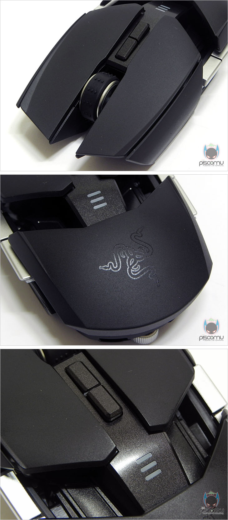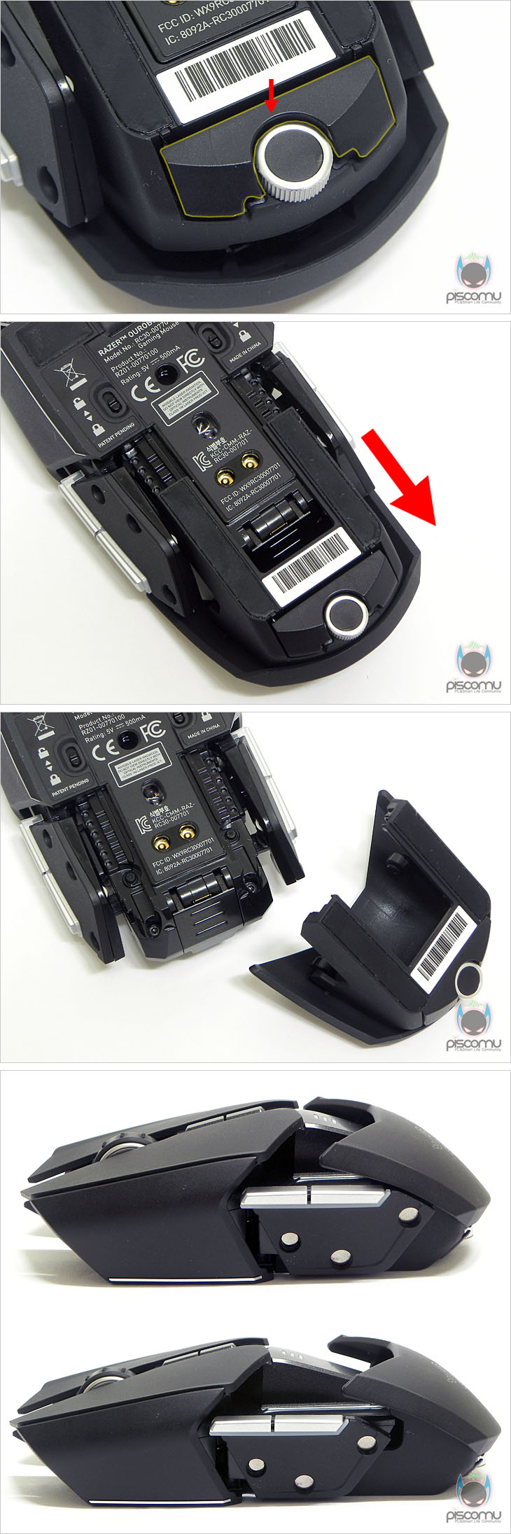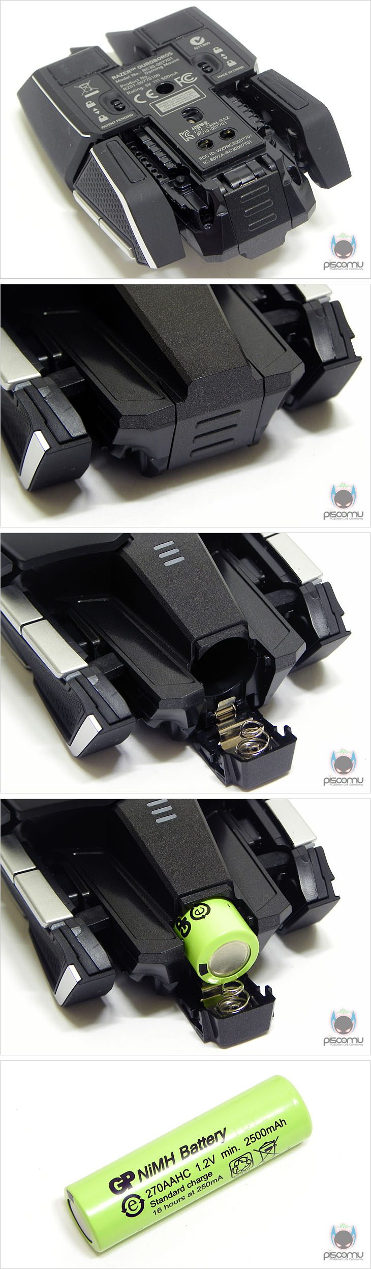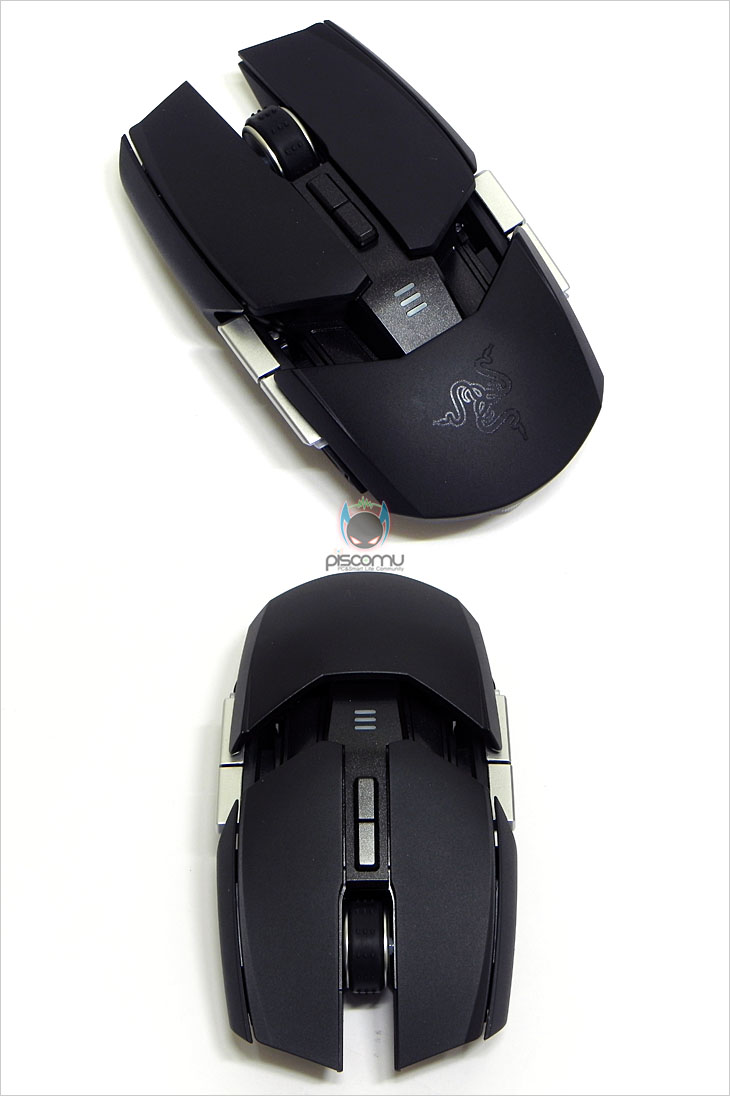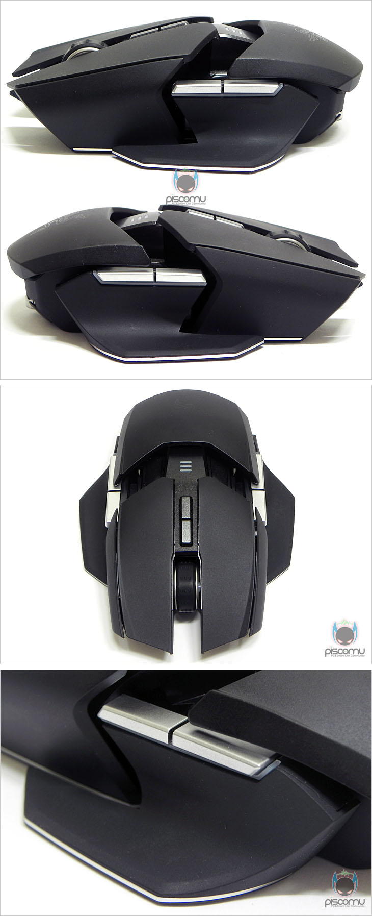 마우스 전면에는 메쉬(타공망) 처리가 되어 있으며, 가운데 휠-버튼 아래에는 제공되는 USB 케이블과 연결되는 USB 포트를 확인할 수 있습니다. 후면에는 마우스 손바닥 그립 부분이 팜-레스트 높낮이 조절을 할 수 있는 스크류를 확인할 수 있습니다. 우로보로스(Ouroboros)의 또 하나의 특징은 그립 유형에 따라 팜레스트 높낮이와 길이 조절을 할 수 있다라는 점인데, 일단, 높낮이 경우 후면 밑부분에 배치된 스크류를 좌우로 최대 약 14번 반바퀴 정도 돌리면서 팜-레스트 높낮이를 조절할 수 있습니다. 손바닥 그립 비중이 높은 팜-그립일 경우엔 높게, 손가락 비중이 높은 핑거-그립에선 낮게 설정을 하면 됩니다. 또한, 높낮이 조절과 동시에 그립 유형에 따라 팜-레스트의 앞뒤 길이 조절도 가능한데, 높낮이 조절 스크류 주변부를 눌러주면, 팜-레스트 길이를 최대 5단계로 길이 조절할 수 있습니다. 기본 길이에서 최대 16mm까지 늘어납니다. 즉, 높낮이와 길이 조절을 자신의 그립 유형에 따라 최적으로 맞춰 설정할 수 있겠습니다. 그리고, 팜-레스트를 분리했을 때, 무선 사용을 위한 충전지 삽입구를 확인할 수 있는데, 제공되는 AA건전지를 사용하면 무선으로 사용할 수 있습니다. 제공되는 AA건전지는 충전지로 용량은 2500mAh로 일반 충전지 용량에 비해 많은 편이며, 한 번 충전으로 최대 12시간 사용이 가능하겠습니다. 물론, 동일한 배터리타입의 일반 충전지도 사용이 가능합니다. 마우스 밑면에는 앞부분과 가운데 양쪽 자리에 부드러운 움직임을 위해 기본 테프론 피트를 부착해놨으며, 앞부분 피트 바로 아래에는 좌우 측면 버튼 인식을 잠금 해제 할 수 있는 스위치가 배치되어 있습니다. 그리고, 가운데는 레이저 센서로 2개의 센서가 적용된 듀얼 센서를 갖추고 있습니다. 이미 여러 리뷰에서 알려진 대로, 센서는 Avago사의 ADNS-9800 센서를 레이저 마우스 전용으로 변형한 4G 센서로 최대 8200DPI를 지원합니다. 그리고, 센서 아래에는 충전 도크와 연결되는 접지 부분이 배치되어 있습니다. 끝으로, 무선 사용시 리시버 역할과 충전지 충전시 거치대 역할을 하는 충전도크를 살펴보면, 약 30° 경사를 가진 거치대 형태로 충전 시 마우스 밑면의 접지부분과 접촉되는 거치대 접지를 확인할 수 있으며, 바로 전면에는 리시버 상태를 확인할 수 있는 LED 램프가 배치되어 있습니다. 그리고, 후면에는 USB 전원케이블과 연결되는 USB 포트를 확인할 수 있습니다. 그리고, 미끄럼방지를 위해 밑면에는 고무패드가 부착되어 있겠습니다. 유선 사용시와 충전도크 연결시 사용되는 USB전원케이블의 길이는 2m로 충분한 길이를 가지고 있으며, 케이블 전체는 깔끔하게 슬리빙 처리가 되어 있습니다. 또한, 양쪽 USB 포트부분에는 신호손실을 최소화하기 위해 금도금 처리가 되어 있으며, PC 장치와 연결되는 기본형 USB 포트에는 덮개가 제공됩니다.
