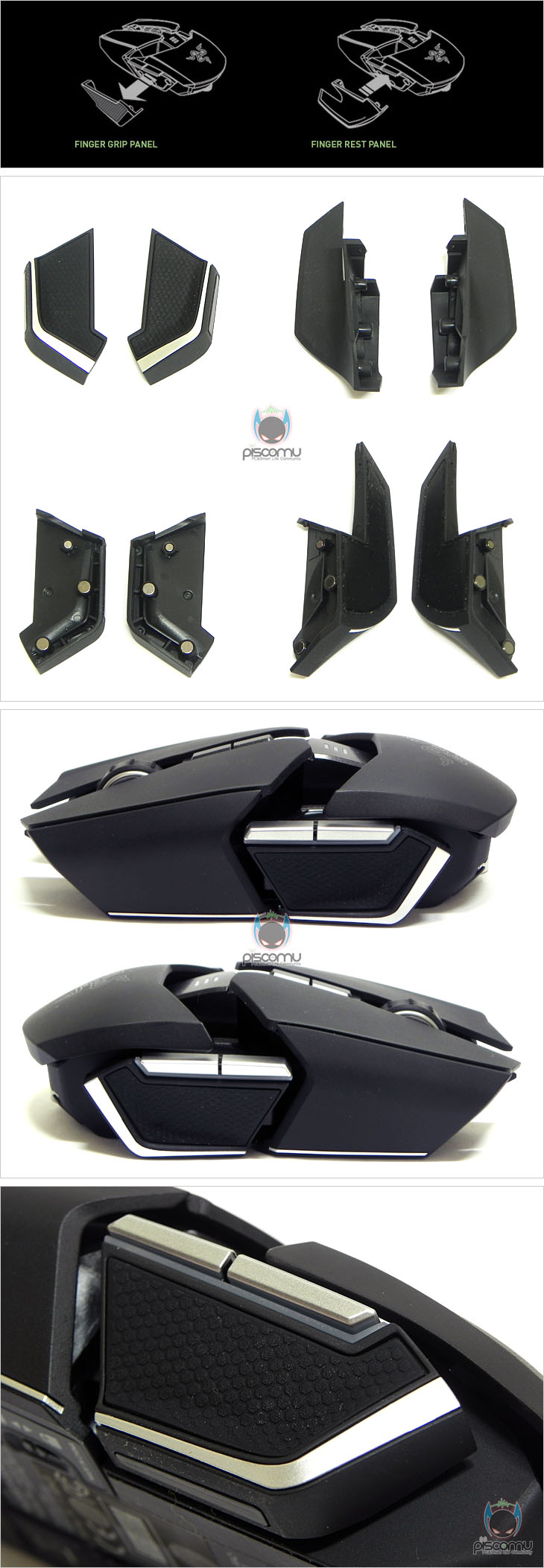 우로보로스(Ouroboros)를 살펴보면, 전체적으로 블랙 색상을 기반에 부분적으로 실버 색상을 포인트로 주고 있습니다. 마우스 형태는 좌우 대칭형으로 왼손/오른손 모두 사용이 가능합니다. 좀 더 자세히 살펴보면, 일반적인 마우스 경우 상위 커버가 하나된 일체형이지만, 우로보로스(Ouroboros) 경우, 앞뒤 구간이 구분되는 형태를 가졌습니다. 앞부분에는 기본 좌우 버튼을 비롯해, 가운데 휠-버튼이 배치되어 있는데, 휠-버튼은 정확한 스크롤을 위해 접지력이 높은 고무 재질을 사용했으며, 일정 간격으로 돌기 처리를 적용했습니다. 그리고, 뒷부분 손바닥 그립부분에팜-레스트는 제조사 로고가 새겨져 있습니다. 중앙 부분에는 휠-버튼 뒤에 배치된 DPI변경 버튼(무선 사용시 전원 On/Off 기능), 그리고 무선 사용시 배터리 용량을 확인할 수 있는 LED 램프가 적용 배치된 것을 확인할 수 있습니다. 우로보로스(Ouroboros) 측면을 살펴보면, 좌우 동일한 형태로 각 측면에 2개의 버튼이 각각 배치되어 있으며, 우로보로스(Ouroboros)의 특징 중 하나인 그립 시 측면 손가락의 그립 유형을 변형할 수 있는 사이드 패널 장착을 위한 자석 홈을 확인할 수 있습니다. 그립 시, 측면 손가락의 그립 형태를 바꿀 수 있는 사이드 패널은 2가지로, 각 패널 안쪽에는 마우스 측면 자석 홈과 연결되도록 동일한 위치에 자석이 배치되어 있으며, 사용 시 밑바닥과 접촉이 되기 때문에 테프론 피트도 기본 부착되어 있습니다. 먼저, FINGER GRIP 패널은 그립 시, 마우스 측면의 손가락이 마우스를 잡는 형태를 위한 패널로 빠른 움직임과 이동 범위가 큰 경우에 마우스를 손에서 놓치지 않을 수 있게 해줍니다. 또한, 이런 지원을 위해 패널부분에는 접지력을 위해 고무 재질에 벌집 모양 패턴 무늬를 적용했습니다. 또 하나의 패널은 FINGER REST PANEL로 앞서 패널과 반대로 측면 손가락은 받쳐주는 역할로 섬세하고 부드러운 움직임을 요구하는 환경에서 사용할 수 있습니다. 따라서, FINGER REST PANEL에선 앞서 패널과 달리 고무 재질이 적용되어 있지 않습니다.