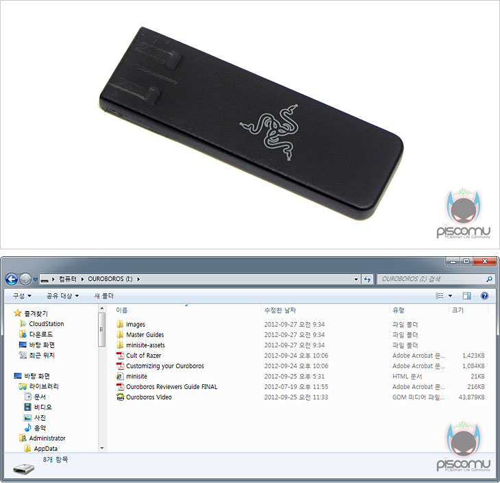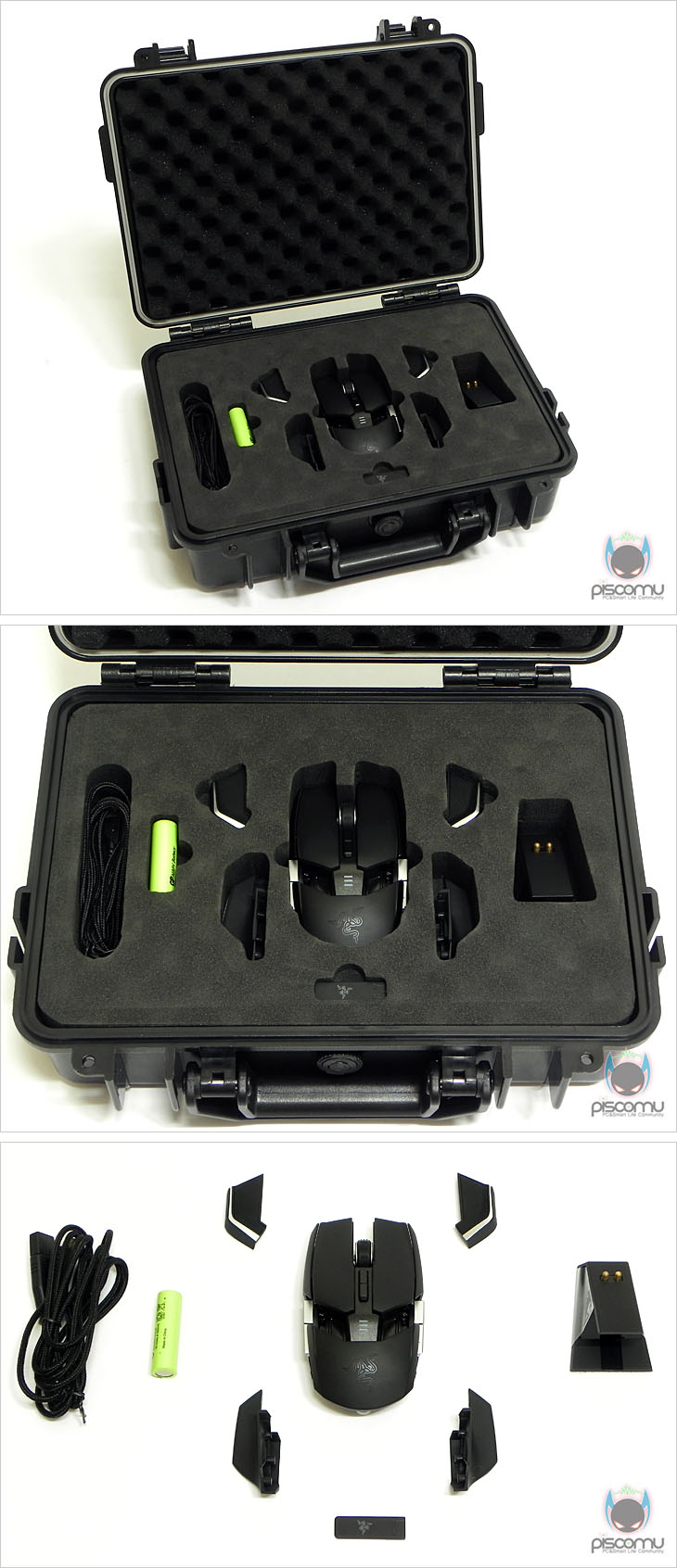 오늘 만나는 우로보로스(Ouroboros)는 제품은 동일하지만, 제품을 담은 팩키지 형태는 판매용과 다릅니다. 시중에 판매되는 제품은 아크릴 케이스 팩키지 형태를 가지지만, 리뷰에 사용된 케이스는 하드케이스 타입니다. 즉, 레이저에서 리뷰 샘플용과 판매용을 구분해서 제공을 했습니다. 이부분은 단순히 참고만 하길 바랍니다. 케이스를 열면, 내부에 스티로폼으로 안전하게 포장된 제품 구성들을 확인할 수 있습니다. 기본적으로 스티로폼에 끼워져 있어, 1차적으로 고정이 잘 되어 있으며, 한쪽에는 엠보싱 형태로 한 번 더 흔들림이 생기지 않게 해서, 외부 케이스나 내부 포장식이나 실제 판매용보다는 좀 더 안정적이라 할 수 있겠습니다. 제품 구성은 기본 마우스를 비롯해, 양쪽에 장착해 그립감을 변형할 수 있는 사이드 패널과 무선 사용시를 위한 USB메모리, 충전지, 충전도크(무선 사용시 리시버 기능), USB전원케이블로 이루어져 있습니다. 눈에 띄는 점이라면, 판매용에는 없는 USB메모리를 제공해주는데, 메모리 안에는 우로보로스(Ouroboros) 리뷰에 필요한 데이터 자료를 제공해줍니다. 메모리 용량은 8GB이며, 일반 저장메모리로도 사용이 가능합니다.