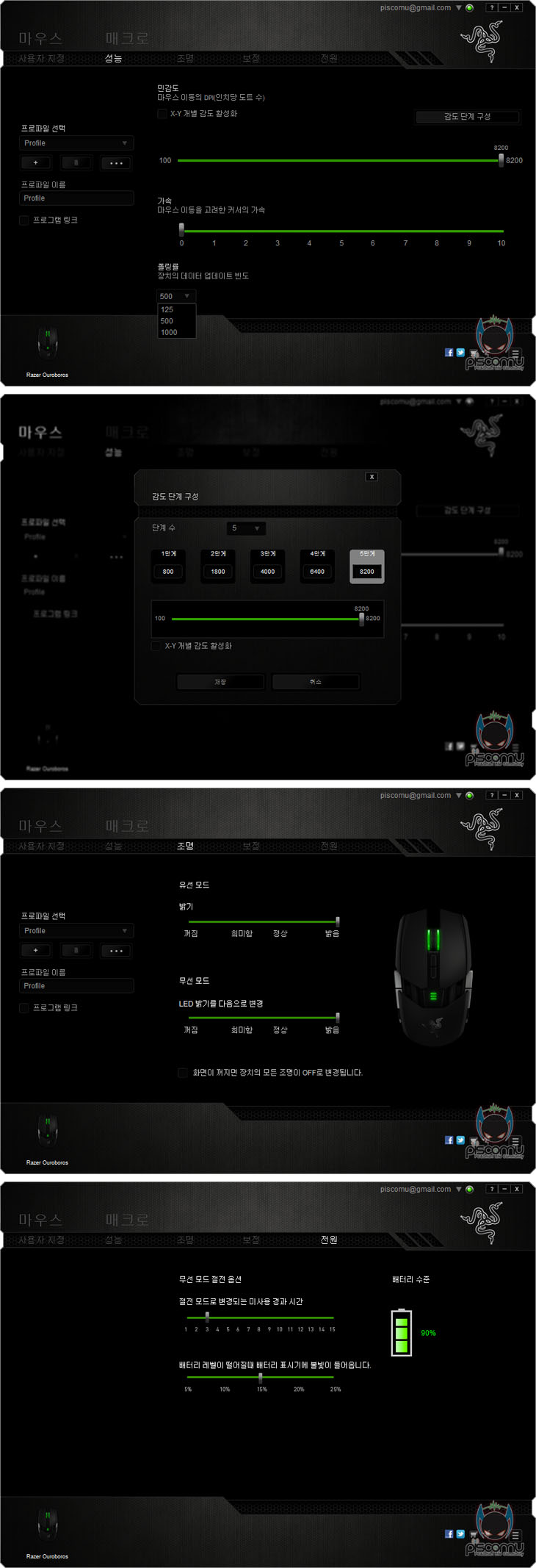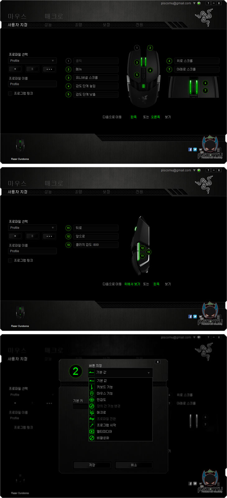 이제, 우로보로스(Ouroboros)를 사용해 보겠습니다. 시작에서 말했듯, 우로보로스(Ouroboros)는 유/무선 모두 사용이 가능합니다. 먼저, 유선 경우엔, USB 전원케이블을 앞서 확인한 전면 휠-버튼 바로 아래 위치된 포트와 연결해서 사용하면 됩니다. 별도의 드라이버 설치과정 없이 바로 사용이 가능하며, 인식과 함께 휠-버튼과 측면 버튼에 LED 램프가 점등되는 것을 확인할 수 있습니다. 무선 사용 시에는 USB 전원케이블을 충전도크에 연결해 리시버 역할을 할 수 있도록 하며, 마우스에는 충전지를 넣은 후, 휠-버튼 뒤에 배치된 DPI버튼 2개를 함께 3~5초간 누르면 On/Off가 됩니다. 무선 사용시에는 유선 시 LED램프외에 마우스에는 충전지 용량을 표기해주는 LED램프가 하나 더 점등되며, 충전도크 전면에도 리시버 연결 상태를 확인할 수 있는 LED램프가 점등됩니다. 그리고, 마우스를 사용하지 않을 때는 충전도크에 올려 충전을 시키면 되는데, 배터리 잔량 표기의 LED가 펄스식으로 점등되면서 충전 진행을 보여주겠습니다. 무선 기능을 Off한 상태에서 충전해도 LED램프들은 점등되기 때문에, 사용하지 않을 때도 나름 시감효과를 즐길 수 있습니다. 그리고, 그립 같은 경우엔 제공되는 사이드 패널과 팜-레스트 높낮이와 앞뒤 길이조절을 통해 그립 팜, 클로, 핑거 그립 유형으로 할 수 있는데, 무엇보다 사용자의 손 크기에 따라 조절을 맞출 수 있다라는 점이 그립 유형에 상관없이 자신이 가장 편한 그립 형태를 가질 수 있겠습니다. 우로보로스(Ouroboros) 역시 레이저 통합 소프트웨어인 시냅스 2.0을 지원하는데, 마우스를 PC에 연결하고 시냅스 2.0을 실행하면, 우로보로스(Ouroboros) 기본 설정값을 자동으로 인식해 불러옵니다. 프로파일을 기본으로 사용자 지정에선 버튼 기능을 변경할 수 있는데, 왼쪽 버튼을 제외한 나머지 버튼들의 기능을 기본값외에 7가지 메뉴 중 선택해 적용시킬 수 있습니다. 이 외 성능 메뉴에서는 DPI값과 전송제어 속도(Polling Rate)를 조절할 수 있는데, 100단위씩으로 최대 8200DPI까지 설정할 수 있고, DPI 버튼으로는 총 5단계까지 설정으로 기본값을 지정해 바로 변경할 수 있습니다. 그리고, 전송제어 속도는 125/500/1000Hz 3단계로 조절할 수 있습니다. 이 밖에, 조명에선 유선과 무선 모드 사용시 각 LED의 밝기를 조절할 수 있으며, 전원에선 무선 사용시 배터리 용량과 사용 설정을 사용자가 변경 적용할 수 있습니다. 끝으로, 마우스 위주의 게임에서 직접 사용해 본 결과, 기본 좌우 버튼은 클릭 압력은 가벼운 편이라 반복 클릭의 게임에서도 손가락에 큰 무리나 피로가 가지 않겠으며, 휠-버튼의 스크롤 역시 고무와 돌기 적용으로 자연스러운 회전을 통해 정확한 스크롤을 할 수 있습니다. 또한, DPI값은 사용자가 변경 적용할 수 있기 때문에, 게임 장르와 자신의 취향에 따라 반응 인식 속도로를 체크해 적용해 사용하면 최적의 환경에서 게임의 만족도를 크게 느낄 수 있겠습니다. 사용감은 상당히 만족스럽습니다.