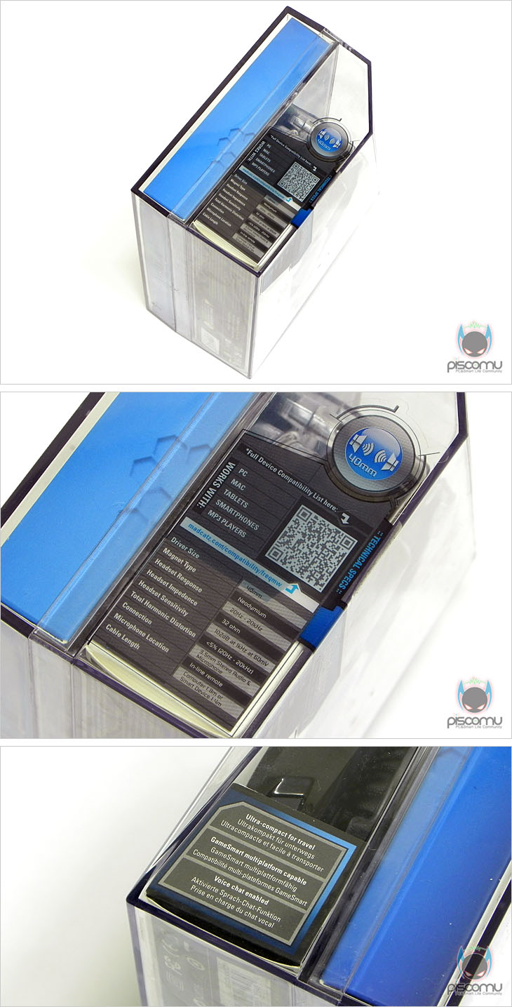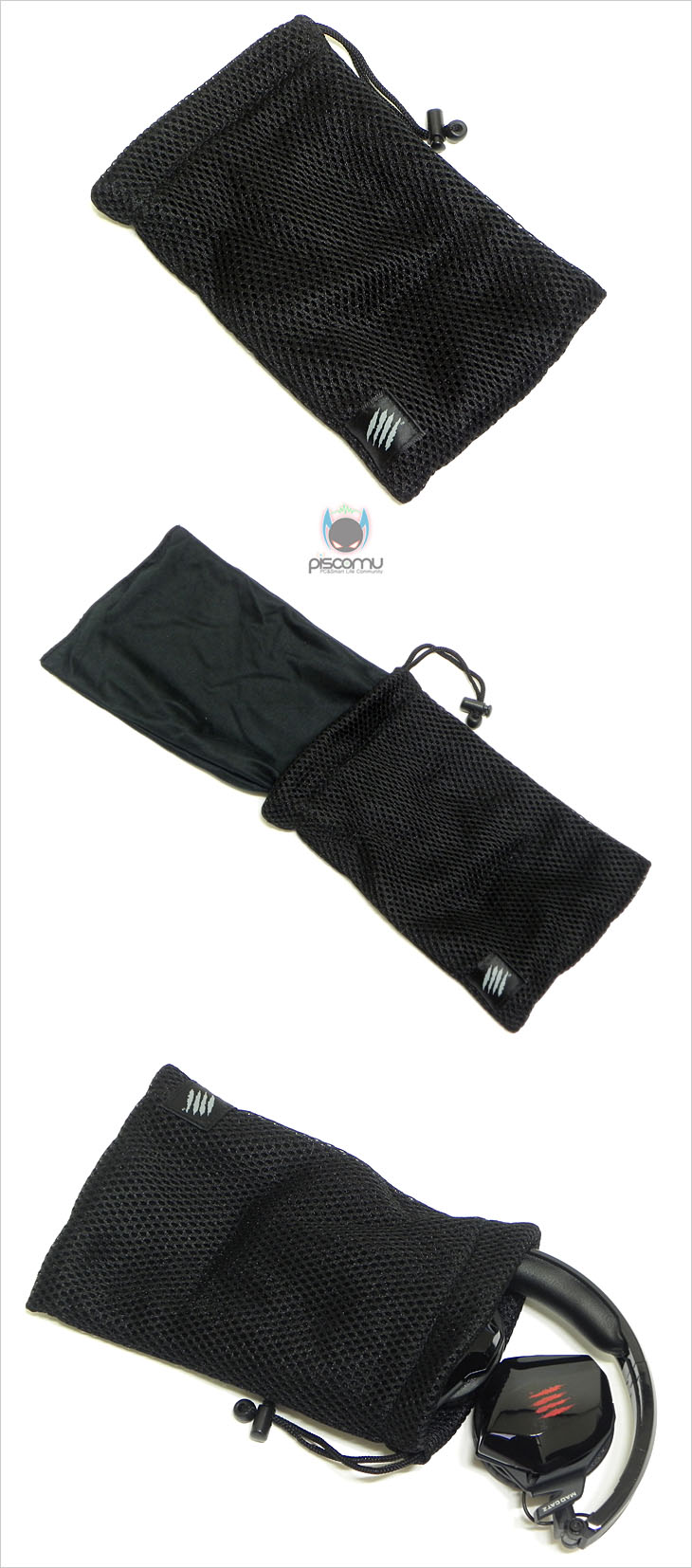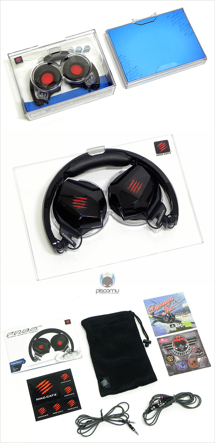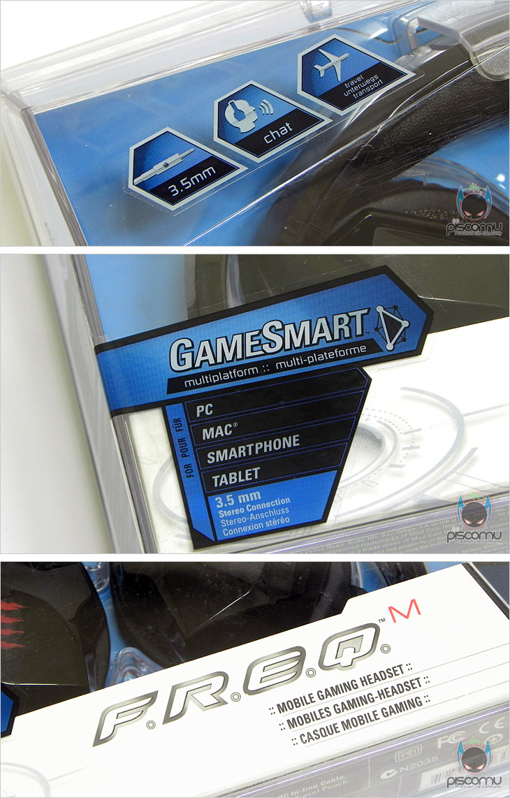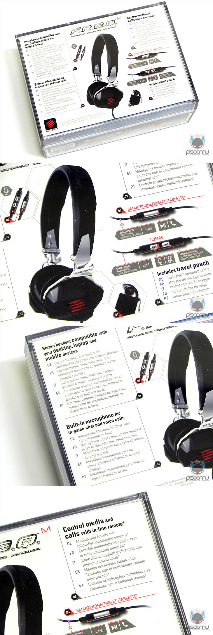 일반적으로 이어폰/헤드셋 같은 액세서리 제품들은 팩키지 형식을 종이박스로 하는 경우가 많은데, F.R.E.Q-M는 이와 달리 차별화로 아크릴 재질의 투명 케이스를 적용해 포장이 되어있습니다. 좀 더 제품이 고급스러운 느낌이 있고, 내부에 포장된 제품을 외부에서 전체적으로 쉽게 확인할 수 있습니다. 케이스 전면에는 제품 모델명을 비롯해, 제품 호환성과 연결 방식, 채팅 지원을 확인할 수 있습니다. F.R.E.Q-M가 모바일 게이밍 헤드셋 컨셉이지만, 앞서 말했듯이, 요즘 출시되는 이어폰/헤드셋은 휴대기기뿐만 아니라 PC도 함께 지원을 하는 추세라 F.R.E.Q-M도 PC를 기본적으로 지원합니다. 케이스 측면에는 해당 제품의 기본 스펙 정보를 확인할 수 있는데, 드라이버 유닛 크기를 비롯해, 저항, 주파수 대역, 감도, 커넥터 방식, 마이크로폰 지원, 케이블 길이 정보를 확인할 수 있습니다. 반대편 측면에는 전면에서 확인한 특징을 좀 더 상세히 설명하고 있습니다. 그리고, 후면에는 해당 제품의 특징을 부위별로 상세히 언급하고 있는데, 호환 지원을 비롯해, 마이크폰 탑재의 인-라인 컨트롤러, 전용 보관 파우치 제공, PC용과 스마트폰/타블렛PC용 케이블 소개를 각 나라별 언어로 소개하고 있습니다. 아쉽게 한국어는 포함되어 있지 않습니다. 제품 포장은 케이스가 2개로 나뉘어지면서 전면에는 헤드셋이, 후면에는 부속품이 담긴 박스로 구분됩니다. 헤드셋은 내부 아크릴판에 잘 고정되어 운송 중에 흔들림이 없도록 했으며, 부속품에는 설명서, 팜플렛, 전용 파우치, 로고 스티커, 스마트폰/타블렛PC용 케이블, PC용 케이블로 이루어져 있습니다. F.R.E.Q-M 전용 파우치는 겉은 그물방이며, 내부에 속피가 적용된 푹신한 쿠션감을 가지고 있어, F.R.E.Q-M를 안전하게 보관하면서 휴대할 수 있겠습니다.