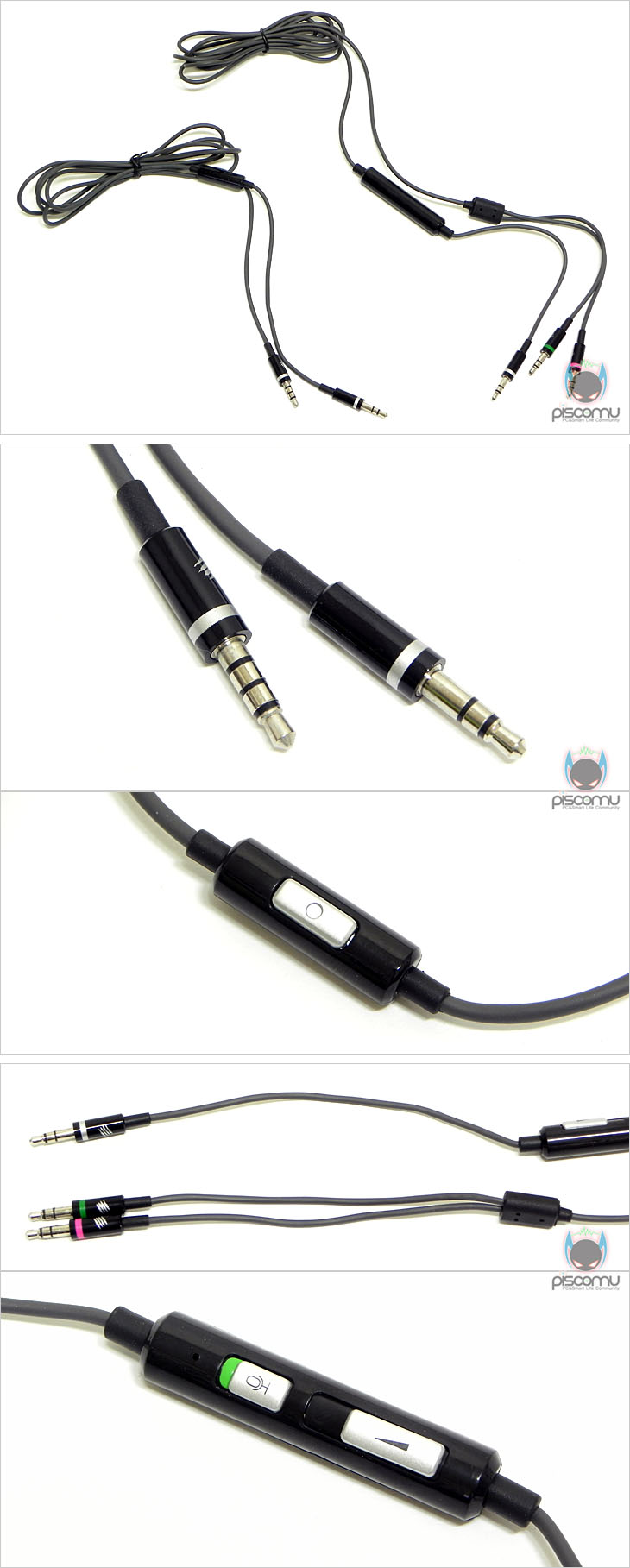 이어(EAR) 안쪽 착용부분에는 편안한 착용감을 위해 쿠션 적용과 마감처리로 역시 인조가죽재질을 적용했습니다. 내부에는 40mm의 드라이버 유닛이 적용되었는데, 이전까지의 F.R.E.Q 시리즈 모델들은 PC용 게이밍으로 50mm 드라이버 유닛이 적용되었지만, 이번 모델은 모바일용 컨셉이기 때문에 유닛 크기가 줄어든 것으로 해석할 수 있습니다. 하지만, 기존 모델들과 마찬가지로 네오디뮴 자석을 적용했기 때문에, 고음에서의 사운드 출력은 안정적이겠습니다. 끝으로, 헤드셋과 기기를 연결해주는 오디오 케이블은 2가지로 스마트폰/타블렛PC용과 PC용으로 제공됩니다. 스마트폰/타블렛PC용 케이블 길이는 1.4m, PC용 케이블 길이는 1.8m를 가졌습니다. 또한, 스마트폰/타블렛PC용 케이블 경우엔 양쪽 연결 잭 형태가 4극, 3극으로 각각 적용되어 기기의 호환성을 높이도록 했으며, 마이크로폰 컨트롤러를 지원해줍니다. 이에 반해, PC용 케이블은 양쪽 잭 형태가 3극으로 동일하지만, PC와 연결되기 때문에, 마이크와 오디오 잭이 따로 분리되어 있습니다. 또한, 컨트롤러에는 마이크로폰 기능과 볼륨 조절 기능이 지원됩니다.