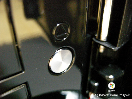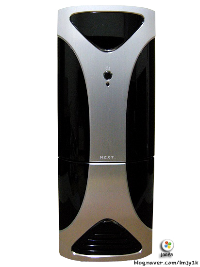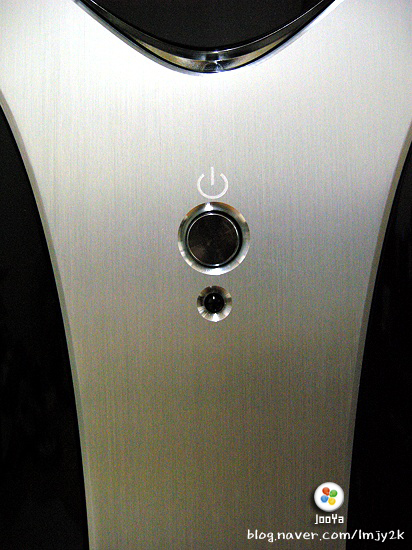 먼저, 제품의 전면부터 살펴보면 X자형의 디자인을 갖추고 있으며 은색부분은 알루미늄 재질로 되어있다. 그 외에 검정색 부분은 모두 하이그로시 광택 처리를 해놓은 상태이다. 물론 제품 전체적으로도 광택처리를 해놓았다. 그리고 제로케이스는 전면이 도어 방식으로 되어있어 전면 드라이브베이를 모두 가리고 있다. 일단 도어 상단부분 중앙쯤에는 파워버튼과 HDD LED가 위치하고 있으며 도어 하단부분에는 로고가 새겨져 있다. 그리고 케이스의 하단부분에는 외부의 바람을 흡입할 수 있도록 통풍구 처리가 되어있다.