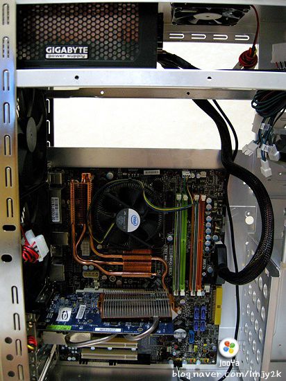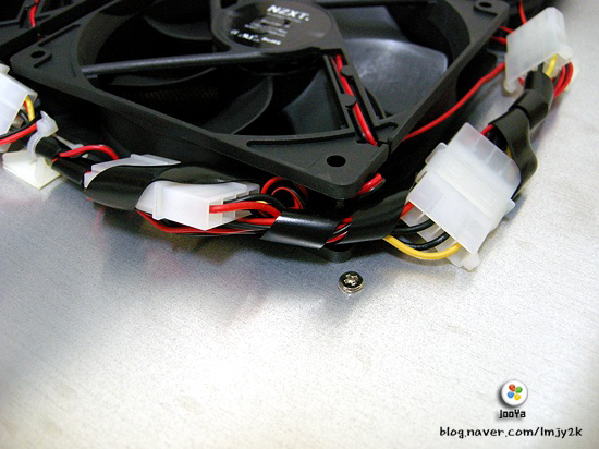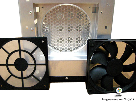 케이스 후면 역시 120mm 쿨링팬이 2개나 장착되어있고 팬그릴도 함께 장착되어있다.그리고 케이스의 상위에도 80mm쿨링팬이 장착되어있다.