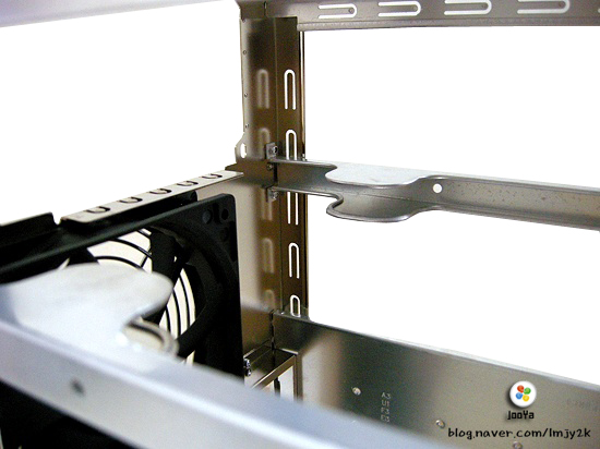 이제 케이스의 옆판을 분리해서 내부를 살펴보도록 하겠다. 먼저 내부의 후면을 보면 앞에서 확인한 120mm 쿨링팬 2개가 장착되어있는 것을 확인할 수 있고 하단 슬롯부분은 고정클립방식으로 클립손잡이를 시계방향으로 돌리면 슬롯에 부품을 장착할 수 있도록 열리게 된다. 내부를 좀 더 살펴보면 파워 장착부분은 양쪽에 지지대가 있어 장착시 편리하게 해주고 있다. 그리고 내부 하단에는 먼지필터망이 장착되어있다. 분리가 가능하기 때문에 80mm 쿨링팬을 장착할 수도 있다. 그리고 메인보드장착부분을 살펴보면 메인보드 나사홈에 각각의 번호가 적혀있는데 이것은 보드에 종류에 따라 사용되는 나사홈을 쉽게 알아볼 수 있도록 해주는 것이다.