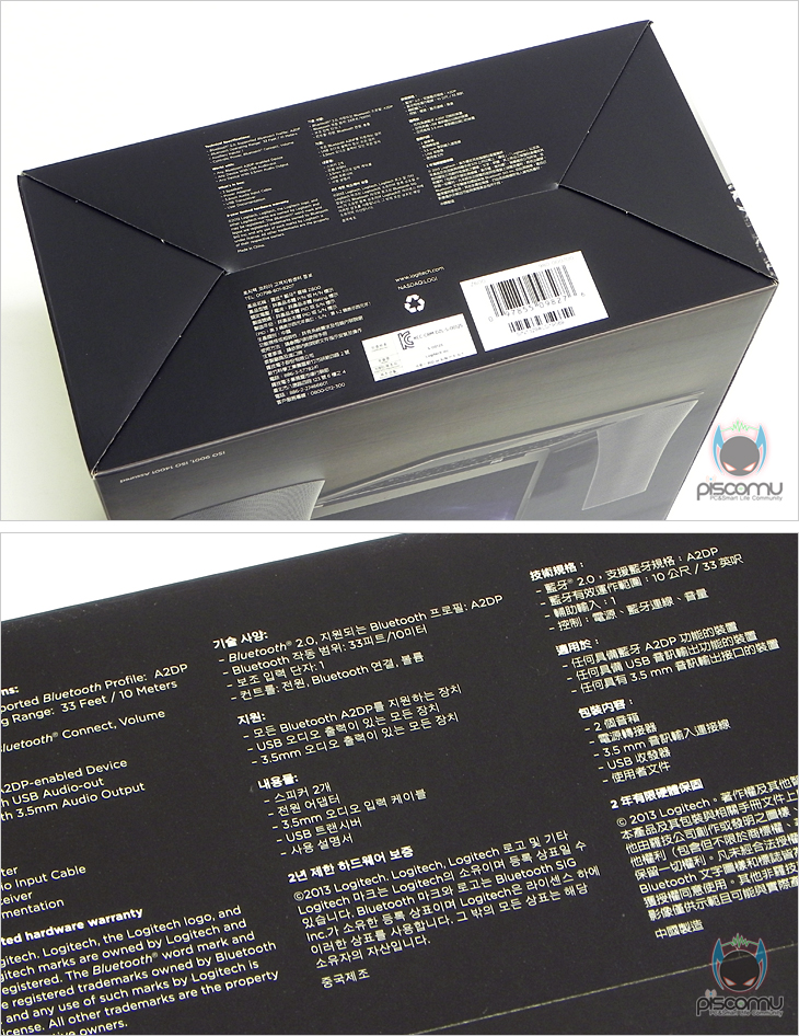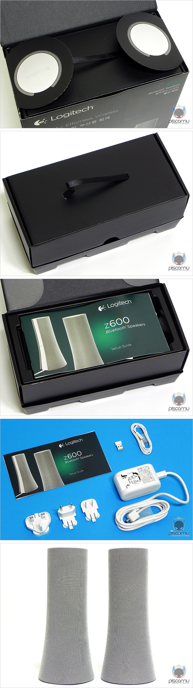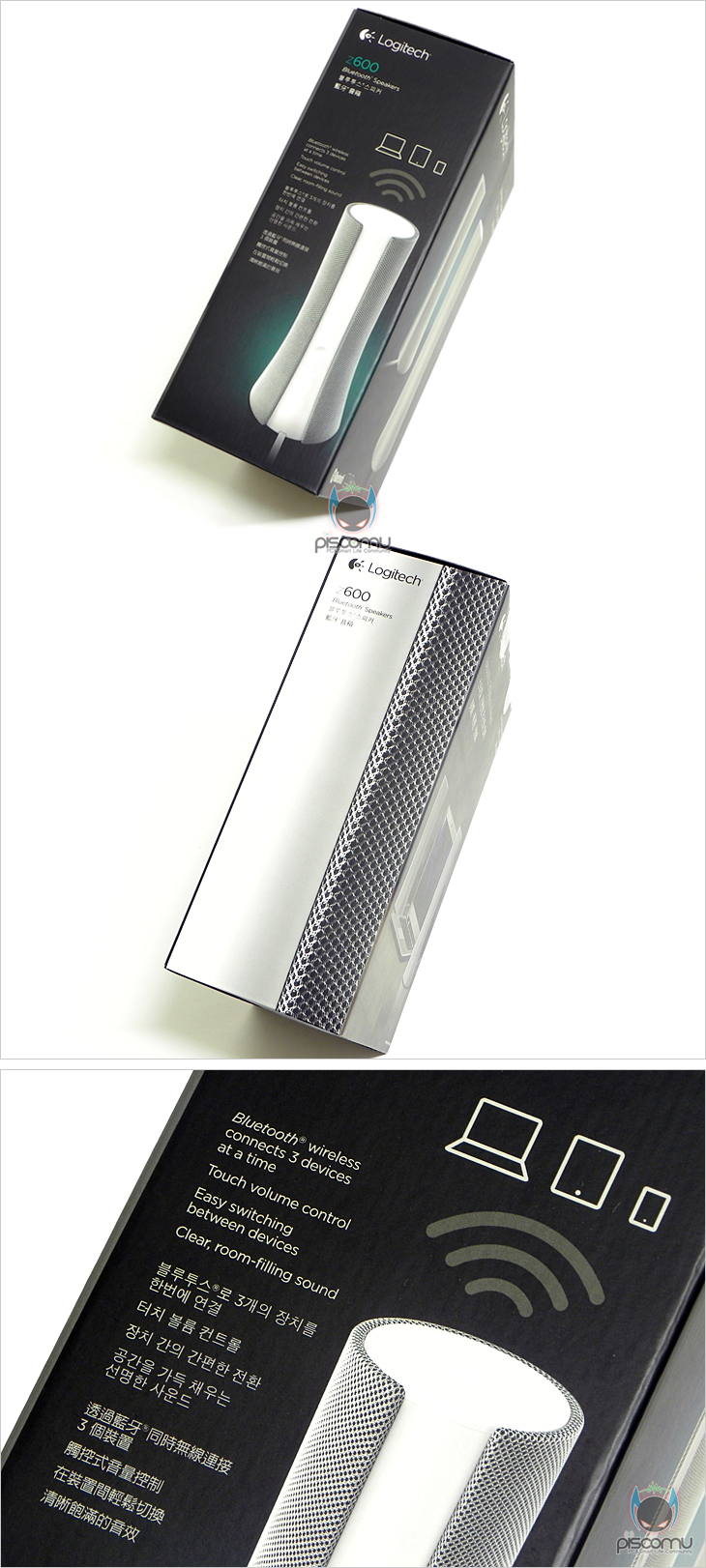 제품 박스를 살펴보면, 전후면에는 모두 해당 제품의 스피커 실제 디자인 이미지를 삽입해 놓고 있습니다. 따라서, 구입 전, 개봉을 하지 않아도, 제품의 디자인은 간접적으로 확인을 할 수 있습니다. 이 밖에, 전후면에는 각각 모델명을 비롯해, 이번 제품의 컨셉 문구(스타일, 간편함, 무선)을 확인할 수 있으며, 블루투스 스피커로써 연결할 수 있는 재생기기에 대한 표기도 확인할 수 있습니다. 그리고, 판매제품에 대한 신뢰를 주기 위해 동봉 스피커가 적용된 점도 확인할 수 있습니다. 박스 측면 역시 제품의 일부 디자인과 함께 주요 특징을 소개하고 있는데, 블루투스 연결 지원, 터치 볼륨 컨트롤, 장치 간의 전환, 그리고 사운드품질에 대한 소개를 하고 있습니다. 그리고, 박스 밑면에는 한국어를 포함해 3개 국 언어로 제품의 기본 사양부터 지원 여부, 구성품 목록, 2년의 보증 기간에 대한 내용을 확인할 수 있습니다. 제품 포장은 일단, 개봉을 하면 윗부분에 부속품이 담긴 속박스를 먼저 발견할 수 있는데, 속박스에는 설명서를 비롯해, 블루투스 장치를 지원하지 않는 제품에서도 사용할 수 있도록 블루투스 수신기가 지원되며, 오디오 케이블, 그리고, 각 나라별에 맞춰 사용할 수 있도록 3개의 전원 플러그와 전원 어댑터로 이루어져 제공해주겠습니다. 그리고, 본 제품인 Z600 스피커도 확인할 수 있습니다.