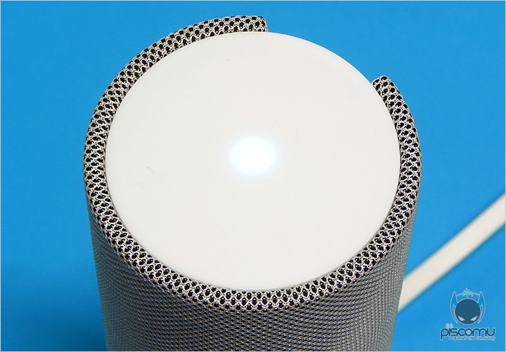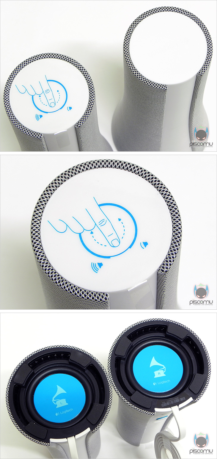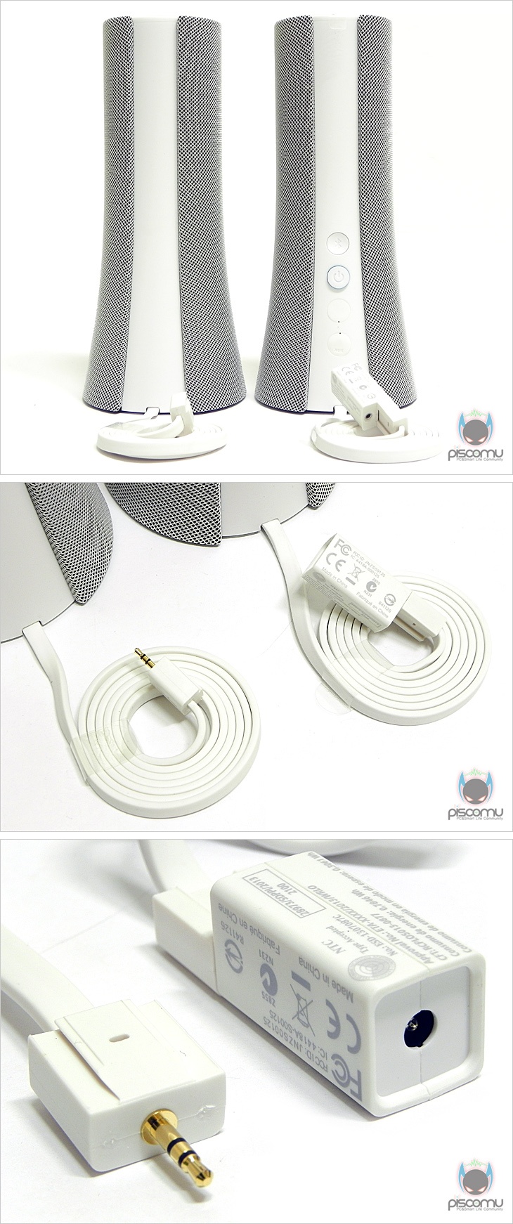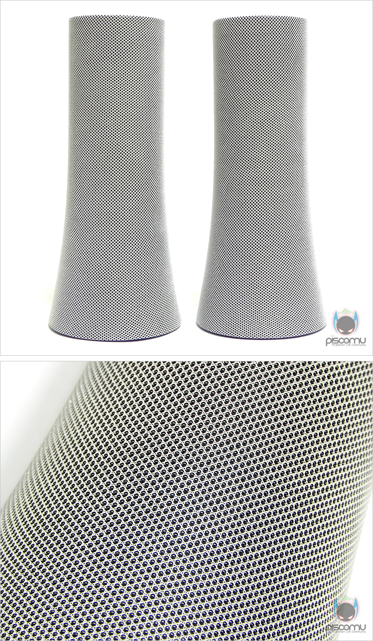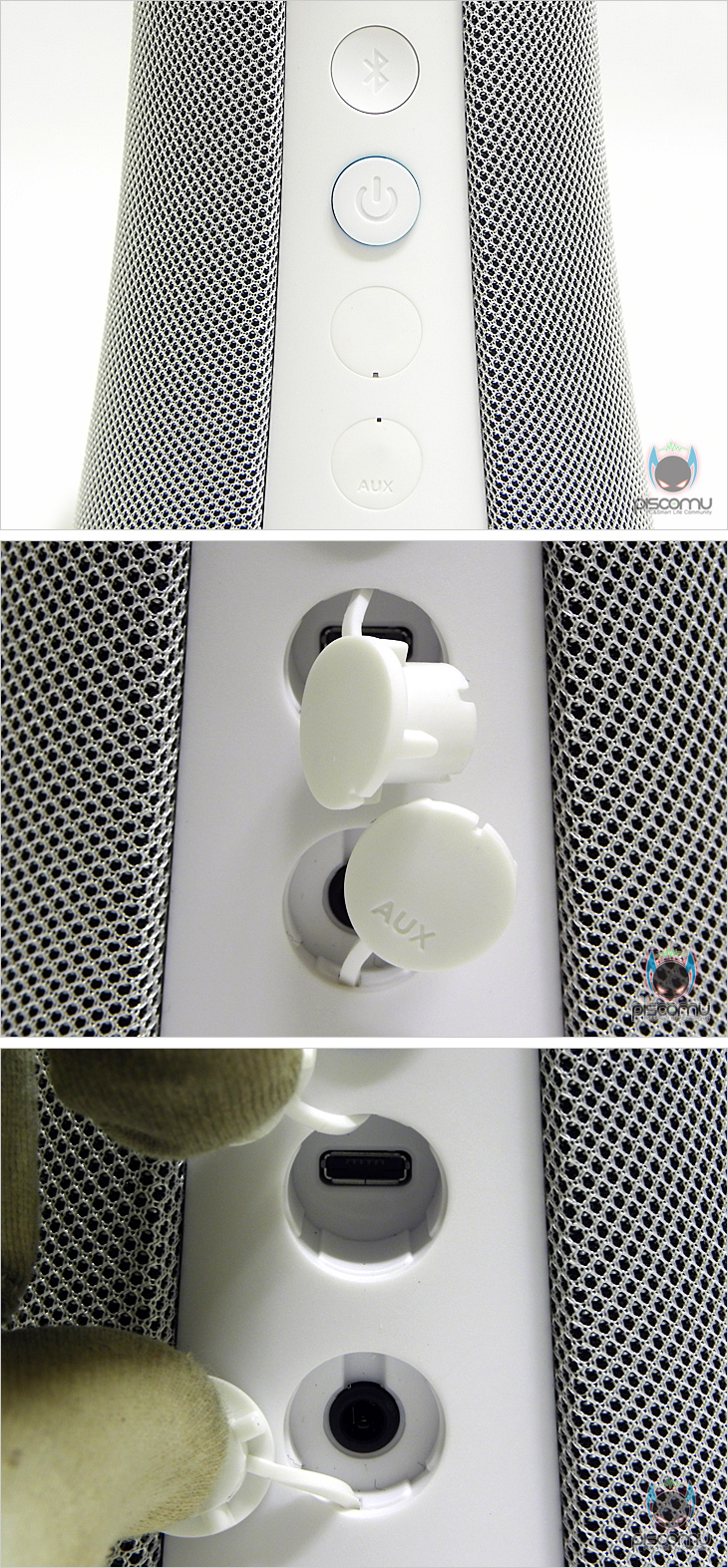 스피커끼리 연결은 전원 포트 후면에 보면 오디오 포트가 함께 있는 것을 확인할 수 있는데, 바로 이곳에 한쪽 스피커의 오디오 케이블을 연결해주면 되겠습니다. 또한, 전원 포트는 전원 케이블쪽 포트와 그대로 연결하면 되겠습니다. 마치 연결 구조방식이 애플사 제품을 연상케 합니다. 그리고, 후면에 배치된 버튼 및 포트를 살펴보면, 상위부터 블루투스 연결 버튼, 전원 버튼, micro-USB 포트, AUX 잭 포트순으로 배치되어 있는데, 특히 포트부분은 커버를 적용해 사용하지 않을 시에는 포트 금속부분의 부식 방지 및 먼지 유입을 방지할 수 있겠습니다. 끝으로, 스피커 상위와 밑면을 살펴보는데, 먼저 상위 경우 좀 더 확실히 패브릭 재질이 기둥을 감싸는 형태를 확인할 수 있으며, 한쪽 스피커에는 터치 방식으로 볼륨을 조절할 수 있게 적용이 되어 있습니다. 일반적인 버튼이나 스위치 방식보다 빨리 조절을 할 수 있겠습니다. 그리고, 스피커 밑면에는 사운드가 출력되는 우퍼 처리와 함께 진동과 미끄럼 방지를 위해 받침부분에 고무패드가 기본 부착 되어 있겠습니다.