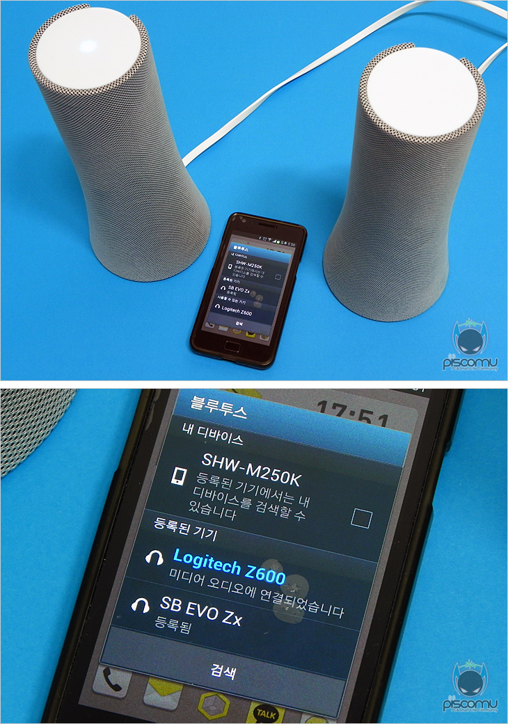 직접, Z600을 사용해보는데, 블루투스 연결에 앞서, 전원 어댑터에 각 나라별로 제공되는 플러그를 연결하는 법을 간단히 살펴보면, 사용자 환경에 맞는 플러그를 선택해서, 어댑터에 연결 표기법처럼 맨 위에서부터 끼워 넣는 것이 아닌 홈에 맞춰 끼운 후, 아래로 내리면 쉽게 어댑터와 연결이 되겠습니다. 그리고, 전원 어댑터에는 전기용품안전인증(KC) 등을 통해 안전성을 받은 상황입니다. 일단, 전원을 연결한 후, 스피커를 켜면, 터치 볼륨 조절 중앙에 블루LED 로고가 점등되면서, 사운드를 들려줍니다. 일종의 시작 알람음이라 할 수 있습니다. 이 후, 터치 볼륨을 만지면, 만질 때마다 터치음이 발생됩니다. 외부 기기 연결에 대해서는 먼저, 제품 컨셉의 기본 지원인 블루투스 방식으로 블루투스 기능이 있는 스마트폰/타블렛PC에서 블루투스 기능을 활성화하고 Z600 스피커에 있는 블루투스 연결 버튼을 누르면, 자동 혹은 수동 검색으로 휴대기기에 Z600 기기를 찾아 목록 표시를 해줍니다. 이다음 해당 목록을 선택해 연결하면 됩니다. 다른 블루투스 기기들과 동일한 방법이라 특별히 어려운 점은 없습니다.