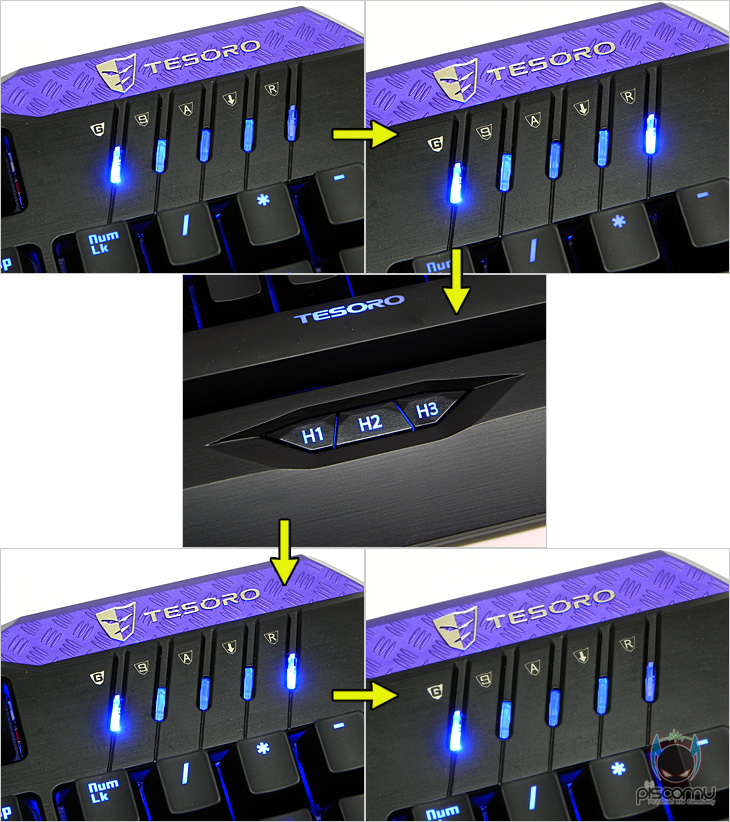 이제, 직접 콜라다(Colada)를 사용해보겠습니다. USB 인터페이스 연결방식이라 별도의 드라이버 설치과정 없이 바로 PC와 연결하면 사용할 수 있는데, 먼저 LED 백라이트에 대한 확인을 해보면, 블랙(이블) 모델은 앞서 언급했듯이 블루LED를 갖추고 있습니다. 그리고, LED백라이트 제어 키를 통해 총 6가지 모드를 확인할 수 있는데, Off부터 50%밝기, 100%밝기, 디밍(자동밝기= 펄스: 숨쉬기) 모드, 게임 존1, 게임 존2 순으로 전환할 수 있습니다. 특히, 디밍(Dimming) 모드는 키를 누르지 않을 때는 자동 밝기 상황이지만, 사용자가 키를 누르면 100% 밝기로 재빠르게 돌아옵니다. 앞선 모델인 듀란달과는 게임 존이라는 게임 상황에서 주로 사용되는 키들만 LED가 적용되는 모드가 새롭게 추가되어서 게임 매니아들에겐 유용할 것으로 생각됩니다. 그리고, 실버(세인트) 모델의 경우는 화이트LED로 역시 LED백라이트 키를 통해 총 6단계 모드로 전환을 할 수 있습니다. 또한, 앞서 언급했듯이 사이드 LED램프는 프로파일에 따라 사용자가 지정한 색상으로 색상 전환이 총 5가지로 가능합니다. LED 색상은 뒤에서 확인하겠지만, 전용 프로그램을 통해 변경 지정 가능하고, LED 작동 모드도 변경 가능합니다. 그리고, 바로 앞서 말했듯이, 두 모델에 따른 각기 다른 LED 색상을 적용하고 있어, 두 모델의 느낌 차이점이 있습니다. 일단, 블랙(이블) 모델은 기계식키보드의 백라이트 모델들에서 가장 흔히 볼 수 있는 블루LED라 밝은 곳이나 어두운 곳에서나 무난한 편입니다. 반면에, 실버(세인트) 모델은 화이트LED라 키 캡의 색상도 실버 색의 밝은 계열이라 사실상 밝은 곳의 LED효과보다는 어두운 곳에서의 LED효과가 확실히 극대화되는 느낌을 줍니다. 따라서, 사용자의 PC환경에 따라 모델의 선택과 동시에 LED선택도 중요하다 할 수 있겠습니다. 키보드 위주의 게임에서 콜라다(Colada)를 사용해 본 결과, 6키와 무한 동시 입력 키 둘 다 지원하기 때문에, 2개이상의 키 입력을 요구하는 게임에서도 인식이 잘 되는 것을 확인할 수 있으며, USB 연결방식이라 전송제어 속도도 1000Hz로 반응 역시 즉각적인 모습을 보여줍니다. 물론, 키보드와 마우스가 함께 사용되는 온라인게임에서도 반응 속도를 만족스럽습니다. 특히, 앞서 LED 백라이트의 게임 모드를 야간에 활용하면 좀 더 게임에 집중할 수 있겠습니다. 또한, 게임도중 윈도우 운영체제로 튕김방지를 위해서 윈도우 키 잠금/해제 기능의 G버튼을 활용하는 것도 게임 환경에 최적화를 주겠습니다. 그리고, 전용 프로그램에서 매크로 기능을 설정하는 것보다 빠른 매크로 기능을 기록/저장할 수 있도록 지원되는 R버튼은 먼저, Fn(펑션키)+프로파일을 선택한 다음 R버튼을 누르면 LED램프가 들어옵니다. 그 상태에서 엄지 키(H1~H3) 중에 기록을 저장할 키를 선택하고, 매크로 입력을 한 후, 다시 R버튼을 누르면 LED가 Off되면서 선택한 엄지 키에 입력한 매크로가 저장되겠습니다. 사용법이 간단하기 때문에, 초보자도 쉽게 사용할 수 있습니다.