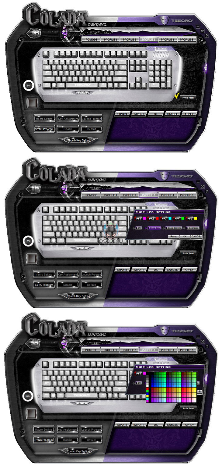 그리고, 콜라다(Colada) 역시 듀란달처럼 전용 소프트웨어가 지원되는데, 프로그램을 실행하면, 맨 위에는 5개의 프로파일과 기본 PC모드 메뉴가 있으며, PC모드에선 특정 프로그램 실행 지정을 할 수 있는 SYNC 프로그램만 활성화되어 있습니다. 즉, 모든 설정을 건드리기 위해서는 맨 위에 있는 각 프로파일 메뉴들로 변경 설정을 할 수 있습니다. 지정된 프로파일에선 각 키들의 기능부여를 할 수 있는데, 매크로 기능을 설정할 수 있는 Macro Setting, 기본 키에서 다른 단일 키로 변경할 수 있는 Key Assignment, 특정 프로그램 실행을 단일 키로 지정하는 Launch Program, 단일 키 비활성화(Disable), 기본 키로 돌릴 수 있는 Default, 엄지 키 설정의 Thum Key Setting을 지정할 수 있습니다. 그리고, 키 설정 메뉴 반대편인 오른쪽에는 프로파일을 저장하는 EXPORT, 불러오기의 IMPORT 등이 있으며, 키보드 이미지 바로 오른쪽에는 프로파일을 기본값으로 초기화 시켜주는 버튼도 있습니다. 그리고, 맨 오른쪽에는 각 프로파일에 지정되는 사이드 LED램프의 색상을 사용자가 원하는 색상으로 변경할 수 있습니다. 또한, 색상 지정 외에도 작동 모드 3가지를 지원하는데, 단일색 고정밝기 Single Color, 단일색 숨쉬기 모드 Single Dimming, 화이트/레드/그린/블루/옐로우/샤인안/핑크 순으로 자동 색상 전환의 Color Loop가 있습니다.