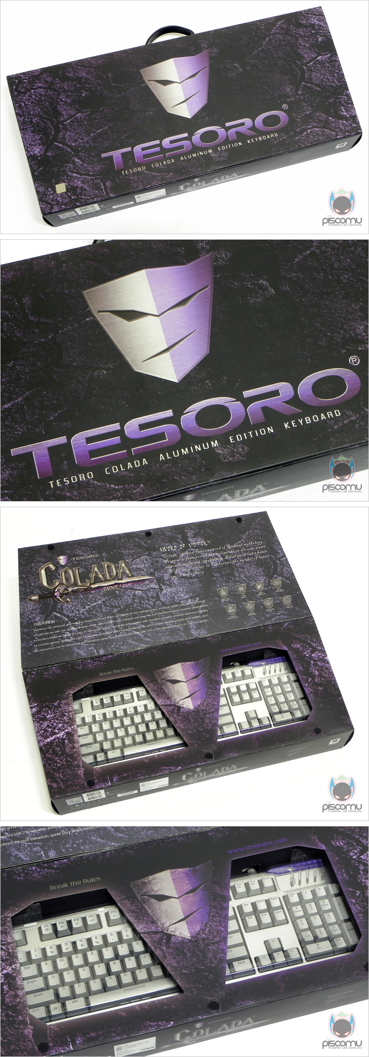 오늘 만나는 콜라다(Colada)는 샘플 버전이기 때문에 출시 예정과는 약간의 차이가 있을 수 있습니다. 일단, 제품 박스부터 살펴보면 크기는 이전 듀란달보다 좀 더 큰 사이즈로, 전면에는 테소로 로고와 함께 콜라다(Colada) 알루미늄 에디션이라는 문구를 확인할 수 있습니다. 그리고, 전면 커버는 오픈 방식으로 내부에 포장된 해당 모델의 일부를 노출시켜 확인할 수 있습니다. 모델 색상은 실버 외에 블랙 모델로 총 2가지 색상으로 출시가 되는데, 색상과 모델명에 대해서 뒤에서 다시 언급하겠습니다. 커버 안쪽에는 모델명인 콜라다(Colada)에 대한 소개와 제품 특징 소개가 있는데, 일단 콜라다(Colada)라는 어원은 커버에도 소개가 되어 있지만, 스페인 신화에 나오는 가장 유명한 검으로, 일명 태양의 검이라고 불리웁니다. 그만큼 이번 모델은 기존의 기계식 키보드와는 특별함을 가지고 있다라고 해석할 수 있습니다. 그리고, 제품 특징에는 키 스위치, 내장 메모리, 전송제어 속도, 무한 동시 키 지원, 프로파일/매크로 지원, 백라이트, 엄지 키, 전원 잭(Jack)에 대해 언급하고 있습니다. 이 외에도 박스를 좀 더 살펴보면, 측면에는 이동 편의를 위해 손잡이 처리가 되어 있으며, 앞에서 잠깐 언급한 색상부분에선 실버와 블랙 2가지로 나오는 각각 모델명은 실버-세인트, 블랙-이블로 명시하고 있습니다. 그리고, 스위치 방식에는 총 4가지 표기가 모두 되어있긴 한데, 현재로썬 흑축을 제외한 나머지 3가지 스위치로 출시될 예정입니다. 샘플에선 갈축과 흑축을 입수했습니다. 그리고, 샘플 버전이기 때문에, 레이아웃은 영문판이며, 국내 출시에선 한글판으로 출시됩니다. 이 외에 최신 운영체제 지원과 제품 구성 목록도 확인할 수 있습니다. 박스 후면에는 해당 모델의 이미지는 색상 모델에 맞춰 반반씩 삽입해서 제품 특징을 소개하고 있는데, 포트 지원, 멀티미디어 키, 측면 LED 컬러, 알루미늄 커버, 레코드 버튼, 고무 받침대, 프로파일 쉬프트 키, 엄지 키 언급을 확인할 수 있습니다. 그리고, 아래에는 각 나라별 언어로 제품 소개를 하고 있는데, 한국어도 기본 포함되어 있어, 좀 더 쉽게 제품 특징을 이해할 수 있겠습니다.