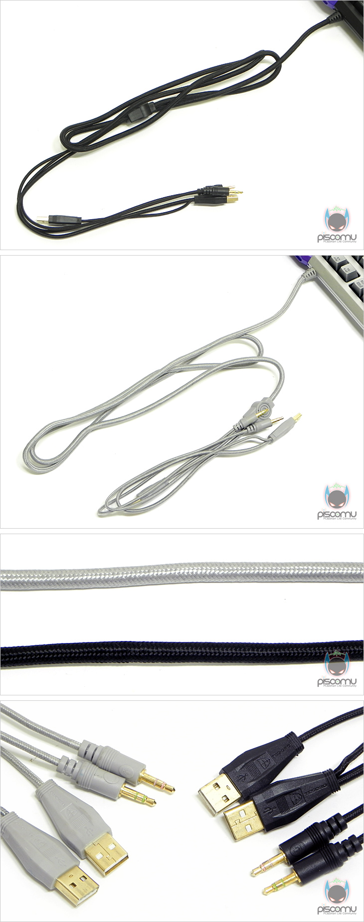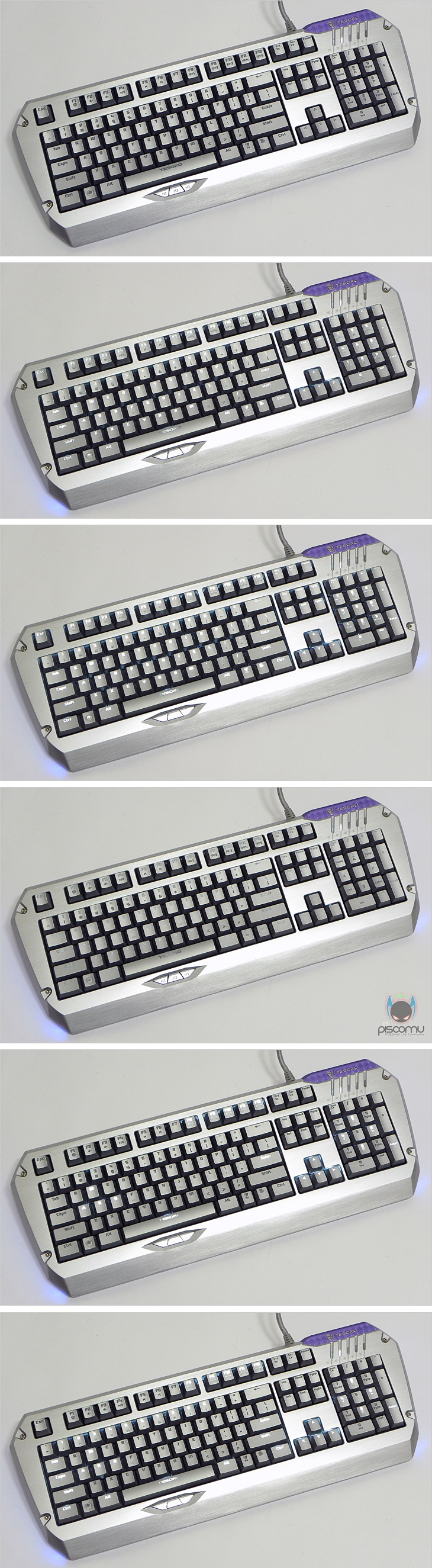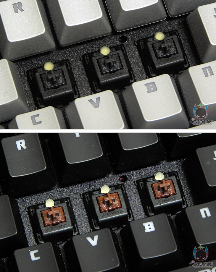 콜라다(Colada) 역시 기계식 키보드로 스위치는 현재 기계식키보드에서 가장 많이 사용되고 있는 독일 체리사의 MX 스위치이며, 샘플에선 흑축과 갈축을 각각 확인할 수 있는데, 앞에서 언급했듯 국내 출시는 흑축을 제외한 청축/적축/갈축으로 출시될 예정입니다. 스위치 바로 위에는 LED가 적용되어 백라이트 지원을 해주는데, 실버(세인트) 모델에선 화이트LED, 블랙(이블) 모델에선 블루LED가 적용되어 있습니다. 키보드 측면에서 키 배열을 보면 앞선 모델인 듀란달과 마찬가지로 각 배열의 키 높이가 계단식으로 되어 각기 다른 각도를 가져 편안한 타이핑을 가질 수 있도록 스텝 스컬쳐2 구조로 되어 있습니다. 이는 높낮이 받침대를 사용했을 때, 좀 더 확실히 효과를 볼 수 있겠습니다. 그리고, 측면에는 이번 콜라다(Colada)의 또하나의 특징, 바로 사이드 LED 램프가 적용되어 있는데, 각 프로파일에 각양각색을 지정해 프로파일에 따라 램프 색상을 전환할 수 있습니다. 키보드 전면에는 듀란달과 마찬가지로 숫자 키패드 전면에 포트 지원을 갖추고 있는데, USB 2.0 포트 2개와 EAR/MIC 포트를 갖추고 있으며, 이번에 새롭게 외부 전원을 꽂아 사용할 수 있게 DC-IN 잭(Jack)도 갖추고 있습니다. 콜라다(Colada) 키보드 밑면을 살펴보면, 두 제품 모두 하단 베젤은 금속 재질이 아니지만, 듀란달 처럼 헤어라인 효과를 넣어 메탈 느낌이 나도록 했습니다. 그리고, 상하 양쪽과 하단 가운데는 기본적으로 미끄럼방지를 위해 고무 패드를 부착했으며, 앞자리 양쪽에 배치된 높낮이 받침대는 2단계 높이 지원으로 사용자가 원하는 높이를 조절할 수 있으며, 가장 높은 2단 받침 끝부분에는 역시 미끄럼 방지를 위해 고무재질이 적용되어 있습니다. 케이블 길이는 약 1.8m로 유선으로 충분한 길이를 가지고 있으며, 케이블 전체는 깔끔하게 패브릭 재질로 슬리빙 처리가 되어 있습니다. 그리고, PC와 연결되는 각 포트와 잭(Jack)은 신호손실을 최소화하기 위해 금도금으로 처리가 되어 있습니다. 끝으로, 키보드를 간단히 분리해보면, 상판 알루미늄의 무게는 측정 결과 약 390g이며, 키보드 사이드에 적용된 LED램프는 효과 극대화를 위해 아크릴이 적용되었으며, 별도로 배치된 엄지 키의 LED모듈도 확인을 할 수 있습니다. 그리고, 숫자 키패드 위에 배치된 LED램프와 G버튼/R버튼의 LED 모듈도 확인할 수 있으며, 지원되는 USB 허브 칩셋에는 Genesys사의 GL850G 칩셋, 내장 메모리 512KB를 지원하는 마이크로컨트롤러 칩셋에는 freescale 반도체사의 MC9S08JM32 칩셋이 적용된 것을 확인할 수 있습니다.