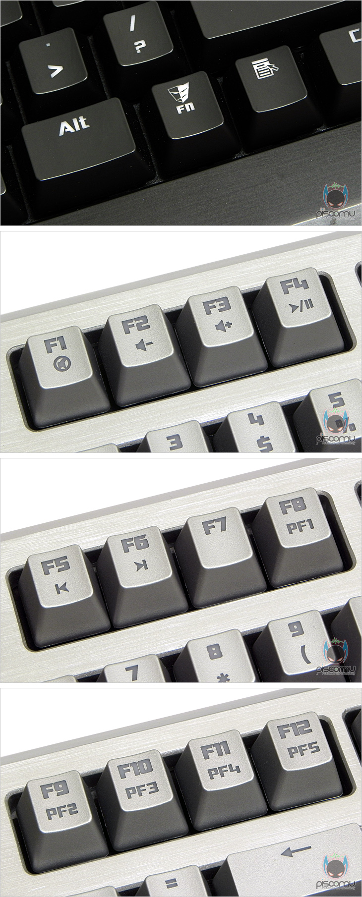 본격적으로 콜라다(Colada)를 살펴보겠습니다. 색상은 앞에서 언급한 것 처럼, 실버(세인트), 블랙(이블) 두 가지로 출시가 됩니다. 키보드 시장에서 블랙 색상은 기본 색상이라 할 수 있어, 블랙 모델은 기본 모델이라 할 수 있으며, 흔하지 않은 실버 색상은 신선함을 주겠습니다. 또한, 색상에 맞춰 키보드 베젤, 키 캡, 케이블 색상까지 모두 통일감 있게 처리를 했습니다. 그리고, 콜라다(Colada)의 가장 핵심은 바로, 키보드 베젤로 상판 프레임 전체가 알루미늄으로 적용되어 있다라는 점인데, 표면에는 금속 특성의 헤어라인 효과도 약간 들어가 있어, 제품의 묵직함과 고급스러움을 동시에 느끼게 해줍니다. 상판 알루미늄 양쪽에는 각각 2개씩 육각 볼트가 고정되어 있는데, 얼핏 봐서는 상판을 고정하고 있는 것 같지만, 상판을 고정하고 있지는 않습니다. 좀 더 메탈 느낌을 살리기 위한 착시 디자인이라 할 수 있습니다. 키 배열은 기본 배열에는 총 104키가 배열되어 있으며, 스페이스-바 아래, 팜-레스트 영역에 3개의 엄지 키(H1~H3)가 배치되어 있어, 총 107키를 갖추고 있습니다. 엄지 키는 매크로 키 기능으로 사용됩니다. 그리고, 각 키 캡에 새겨진 폰트는 고딕체 계열로 좀 굵직한 형태인데, 아마도 백라이트의 효과를 높이기 위함으로 해석됩니다. 키 부분을 좀 더 살펴보면, 스페이스-바 왼쪽에는 Fn(펑션) 키 배치로, 기본 기능의 키들과의 조합으로 부가 기능을 지원하는데, F1~F3키는 음소거/볼륨 조절, F4~F6키는 재생 조절, F8~F12키는 프로파일 키 기능으로 총 5개의 프로파일을 지원해줍니다.
