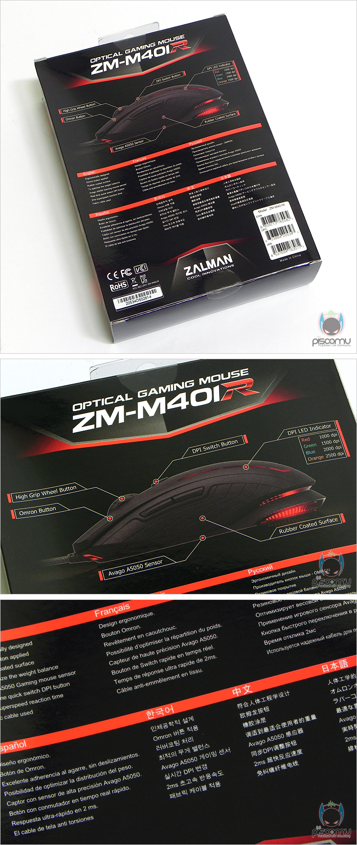 작년부터 본격적인 마우스 시장에 진출한 국내 종합 하드웨어 전문업체 ㈜잘만테크(www.zalman.co.kr)는 현재까지 8개의 모델을 선보였습니다. 주로 가격부담을 줄인 실속형 저가형을 선보이면서 최근에는 가성비로 밀어부친 ZM-GM3 이클립스(http://www.piscomu.com/PC/182869)까지 출시를 했는데. 이번에 출시된 모델 역시 실속형의 저가형 모델이지만, 이전 모델들보다는 좀 더 화려함을 갖추고, 역시 가성비로 승부하는 모델이라 할 수 있습니다. 바로, ‘ZM-M401 레볼루션(Revolution)’ 입니다. 그럼, 잘만테크의 9번째 실속형 가성비 마우스 컨셉으로 출시된 ZM-M401 레볼루션을 만나보겠습니다.