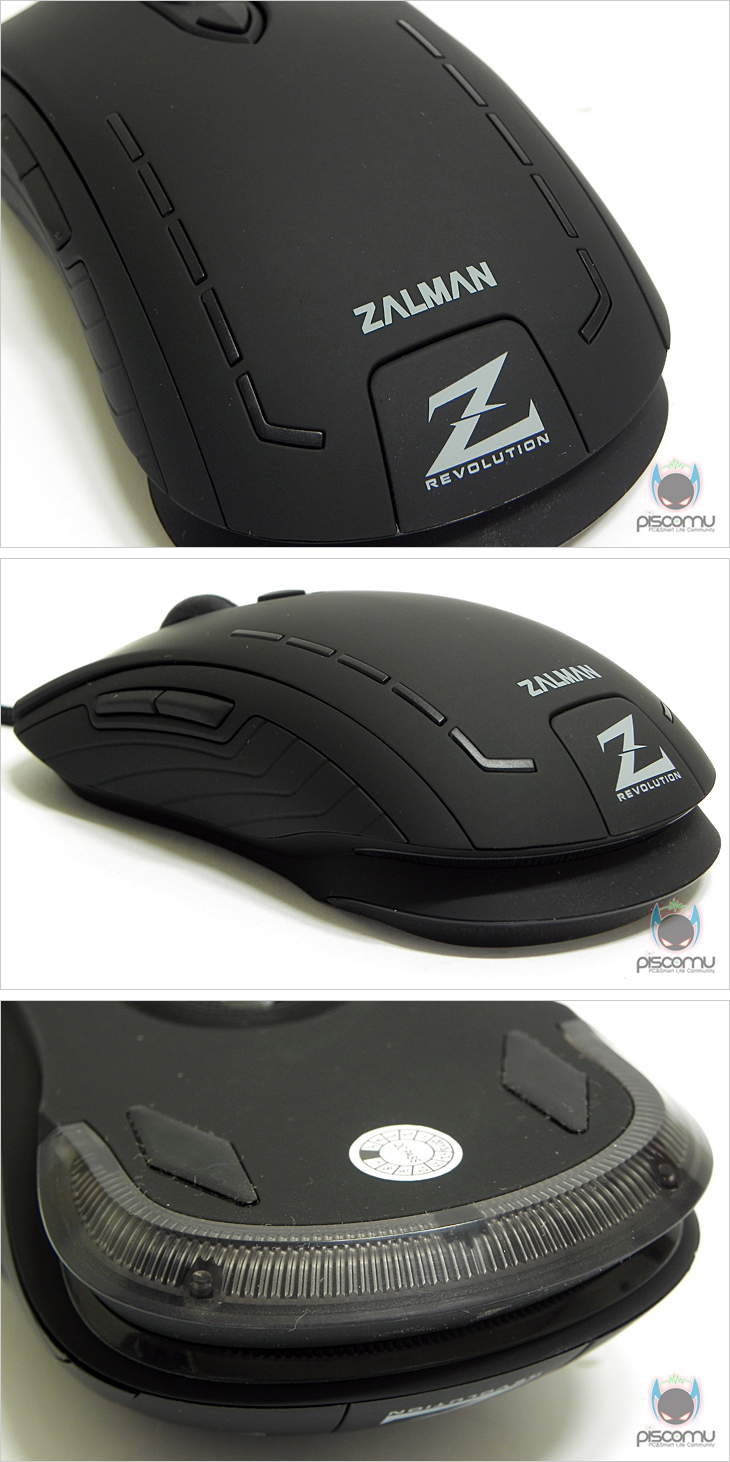 ZM-M401 레볼루션을 살펴보면, 전체적인 색상은 블랙을 가졌으며, 상판 커버는 모두 러버(고무) 코팅으로 처리가 되어 있습니다. 앞부분의 기본 좌우 버튼을 비롯해 가운데 휠-버튼 역시 러버 재질을 사용해 접지력을 높여 스크롤 정확성을 높였습니다. 휠-버튼 뒤에는 DPI 변경 버튼이 배치되어 있는데, 1000/1500/2000//2500순으로 500단위로 변경되겠습니다. 그리고, 마우스 전면에는 LED효과를 볼 수 있게 처리가 되어 있습니다. 손바닥 부분의 팜-레스트에는 끝부분에 제조사와 브랜드 로고가 새겨져 있으며, 양쪽에는 라인 형태로 디자인 처리가 되어 있는데, 작동 시 역시 LED효과를 볼 수 있는 곳으로 DPI값에 따른 각기 다른 색상의 LED를 표기해줍니다. 또한, 후면은 2단 형태의 디자인으로 되어 있는데, 역시 LED효과를 볼 수 있도록 처리가 되어 있습니다. 마우스 측면을 보면 높이가 낮은 편으로 슬림한 형태임을 알 수 있어 게이밍과 일반 사용 모두 적절하게 사용할 수 있도록 했습니다. 또한 측면 디자인은 패턴 라인형태로 처리가 되어 있으며, 좌측에는 추가 버튼 지원으로 2개의 버튼이 배치되어 있는데, 웹-페이지 앞/뒤 기능이 되겠습니다. 마우스 밑면에는 부드러운 움직임을 위해 앞뒤 자리에 각각 테프론 피트를 기본 부착했습니다. 그리고, 케이블 지원에서 케이블은 깔끔하게 패브릭 재질로 전체 슬리빙 처리를 했으며, 길이는 약 1.7m로 유선으로 충분한 길이를 가졌습니다. 연결 인터페이스는 USB 방식으로 전송제어 속도는 스펙에서 언급했듯 500Hz를 가지고 있습니다. 또한, 신호손실 최소화를 위해 노이즈 필터와 포트부분에 금도금 처리를 했습니다. 끝으로 ZM-M401 레볼루션의 내부를 잠깐 살펴보면, 손바닥 팜레스트 부분의 내부에는 무게추가 적용된 것을 확인할 수 있는데, 무게는 약 19g 입니다. 기본 버튼의 스위치는 옴론(OMRON)사 스위치이며, 센서는 박스에 표기했듯, PixArt ADNS-5050 센서를 적용했으며, 컨트롤러 칩에는 HOLTEK사의 칩(HT82A525R)이 적용된 것을 확인할 수 있겠습니다.