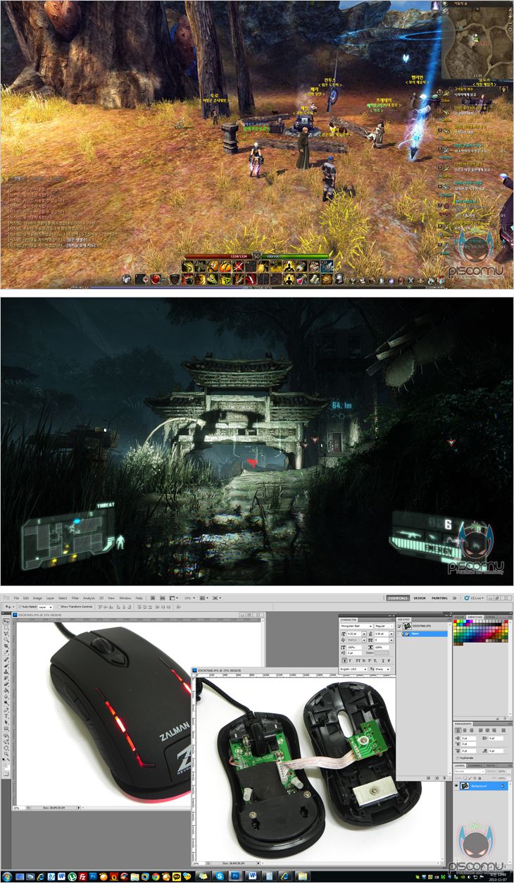 직접, ZM-M401 레볼루션을 사용해 보았습니다. 별도의 드라이버 설치과정 없이 USB 인터페이스로 바로 연결하면 사용이 가능하며, 앞서 언급했듯이 DPI 변경 값에 따라 팜-레스트 부분의 LED 램프가 바뀌는 것을 확인할 수 있습니다. 1000DPI는 레드, 1500DPI는 그린, 2000DPI는 블루, 2500DPI는 오렌지로 작동되며, 작동 형태는 펄스식으로 작동됩니다. 단, 전면과 후면 하단의 LED는 RED LED로만 작동되겠습니다. 마우스 위주의 게임에서 사용해 본 결과, 클릭 압력은 가벼운 편이라 반복 클릭이 많은 게임에서는 장시간 사용에도 손가락 피로감이 적겠으며, 이동 포인트가 많은 FPS 같은 장르에선 마우스 무게감이 적당해 이동감이 수월하지만, DPI값이 1000~2500DPI이기 때문에, 이보다 낮거나 높은 요구를 포인트하는 곳에선 매니아입장에서 아쉬울 수 있을 것으로 생각됩니다. 전반적으로 그립감도 편안하기 때문에, 게임 외에도 일반 작업 사용에서도 적합하다 할 수 있겠습니다. 기본 사용 시 적합한 포인트는 1500~2000DPI가 적절하겠습니다. 반응 인식감은 USB 최대인 1000Hz의 절반이 500Hz이지만, 일반인이 사용하기에는 즉각적으로 보이는 편이기 때문에 무난하겠습니다.