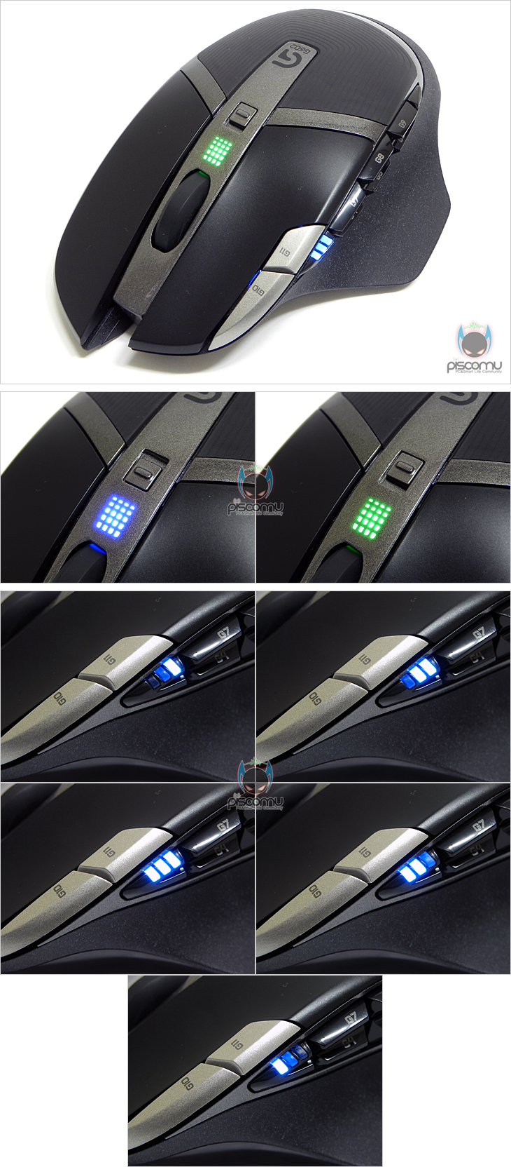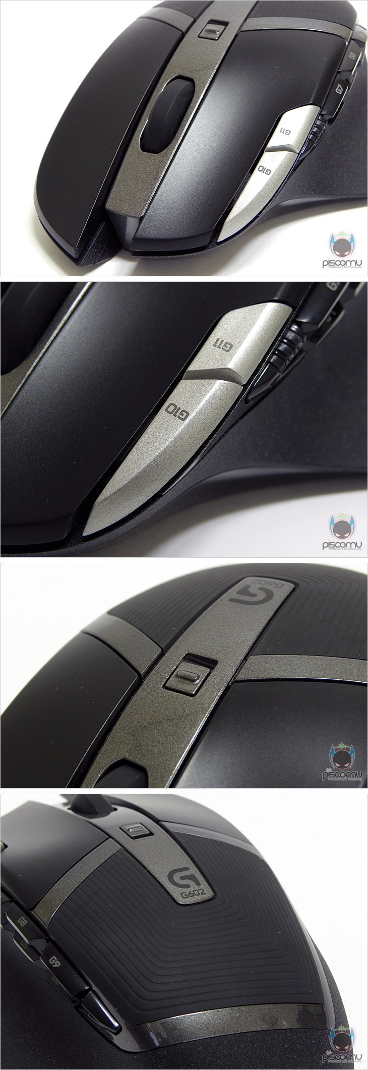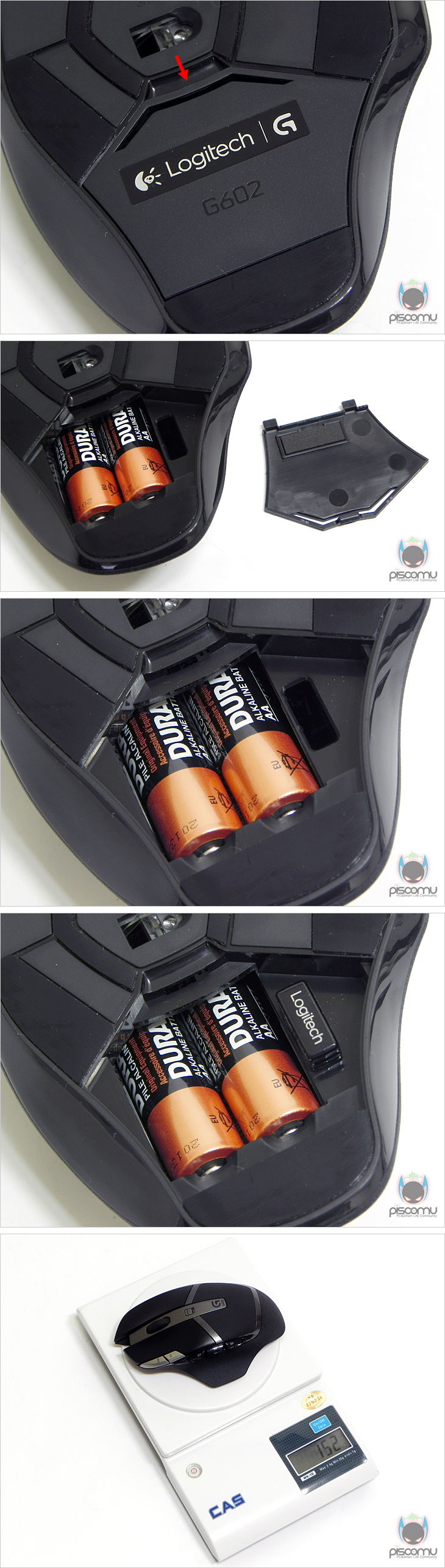 G602를 살펴보면, 전체적인 색상 계열을 블랙이며, 부분마다 포인트로 크롬 색상의 디자인과 일부 광택처리를 적용해 고급스러운 느낌을 살렸습니다. 또한, 마우스 전체 디자인을 봤을 때, 좌우 비대칭으로 오른손 전용 마우스임을 알 수 있으며, 오른손에 최적화된 인체 공학적 디자인을 지녔습니다. 기본 좌우 버튼을 보면, 오른쪽 버튼이 왼쪽 버튼보다 좀 더 긴 것을 확인할 수 있는데, 이 역시 검지보다 중지가 길기 때문에 적용된 디자인이라 할 수 있습니다. 그리고, 가운데 휠-버튼은 고무 재질을 적용했으며, 왼쪽 버튼 맨 왼쪽에는 2개의 버튼이 배치되어 있는데, DPI값을 변경하는 스위치 역할로 G10은 Up, G11은 Down이 되겠습니다. 그리고, 휠-버튼의 뒤에 배치된 스위치는 퍼포먼스와 지속 모드 전환 스위치로 휠-버튼과 스위치 사이에 작동 시 모드 전환을 표기해주는 LED 램프를 확인할 수 있겠습니다. 손바닥 부분의 팜-레스트 부분은 고무 재질을 적용해 착용감을 높였습니다. 마우스 측면을 보면, 좌측에는 추가 버튼들이 배치되어 있는데, 총 6개의 버튼으로 G4/5는 기본 기능으로 앞/뒤 기능, G6는 배터리 수명 확인, G7/8/9는 기본 설정으로 숫자키 1,2,3으로 지정되어 있겠습니다. 또한, 맨 앞부분에는 앞서 확인한 DPI전환 버튼에 따른 DPI값 단계를 보여주는 LED 램프를 확인할 수 있습니다. 마우스 밑면에는 초기 상태 시 배터리 소모 방지 탭이 붙여 있으며, 제거를 하면, 가운데 센서 바로 위에 수신 On/Off 스위치가 배치된 것을 확인할 수 있습니다. 그리고, 앞뒤좌우 위치로 테프론 피트가 기본 부착된 것도 확인할 수 있겠습니다. 센서는 제조사의 델타제로 센서라 불려지는 센서로 센서 바탕은 광(Optical)센서가 되겠습니다. 그리고, 센서 아래에는 내부 배터리를 넣은 공간으로 커버를 쉽게 분리할 수 있으며, 내부에 AA규격의 건전지 2개가 기본 제공되어 장착된 것을 확인할 수 있습니다. 그리고, 이동 시 USB 수신기를 수납할 수 있는 공간을 오른쪽에 적용한 점도 확인할 수 있습니다. 배터리 수명은 앞서 표기된 것처럼 퍼포먼스 모드에선 최대 250시간, 지속 모드에선 최대 1440시간을 가지고 있습니다. 끝으로, 배터리가 장착된 상태에서 마우스 무게는 약 152g이 되겠습니다.