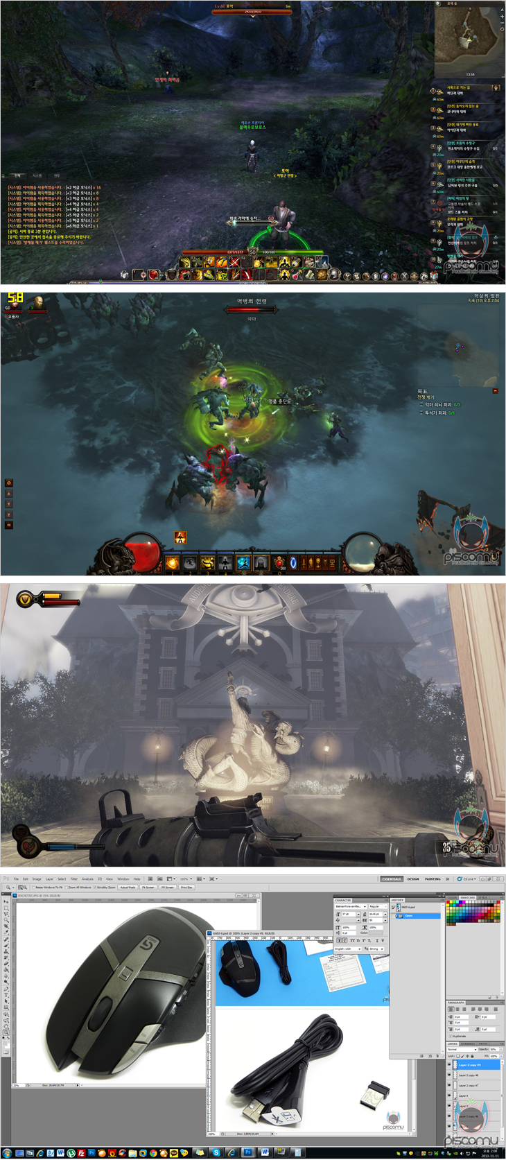 직접, G602를 사용해 보았습니다. 별도의 드라이버 설치과정 없이, USB 수신기를 PC에 꽂고 마우스 수신기를 On하면 자동으로 연결이 됩니다. 그리고, 앞에서 언급했듯이, 휠-버튼 뒤에 있는 모드 변경을 통해 LED 램프를 확인할 수 있는데, 퍼포먼스(게이밍) 모드에선 블루, 지속(일반) 모드에선 그린색으로 표기해주며, 측면 버튼에 G6 버튼을 누르면 배터리 수명 표기로도 보여주겠습니다. 그리고, 측면 LED 램프를 통해서는 DPI값 적용 상태를 확인할 수 있는데, 블루 LED로 총 5단계를 표기해줍니다. DPI 범위는 250~2500DPI까지 지원됩니다. 그립감은 오른손 전용에 맞춘 인체공학적 디자인이라 전반적으로 편안한 느낌을 줍니다. 기존 사용하던 마우스에서 넘어와도 어색함 느낌이 적겠습니다. 또한, 엄지 손가락을 받치는 좌측 받침 역할도 적절하며, 좌우버튼의 손가락 배치도 적절하게 맞겠습니다. 다만, 마우스 크기가 다소 큰 편이기 때문에 일부 손이 작은 사용자는 마우스가 크다라는 느낌을 받을 수 있겠습니다. 게임과 일반 작업 사용에서 사용해 본 결과, 버튼 클릭의 압력은 가벼운 편이라 손가락에 부담감이 적겠으며, USB 방식의 수신기라 전송제어 속도 500Hz로 충분히 반응 속도도 즉각적으로 보여주는 편입니다. 다만, 크기와 무게감이 있기 때문에, 바닥에 붙여 이동하는 경우에는 마우스 움직이 부드러운 반면, 마우스를 자주 들었다 놨다 하는 게임 장르나 작업 경우에는 무게감을 느낄 수 있어 아쉬울 수 있겠습니다. 그리고, 사용하는 동안 수신에 대한 끊김 발생은 하지 않아서, 전반적으로 게임과 일반 작업 모두에서 무선으로 사용하기에 만족스러운 편입니다.