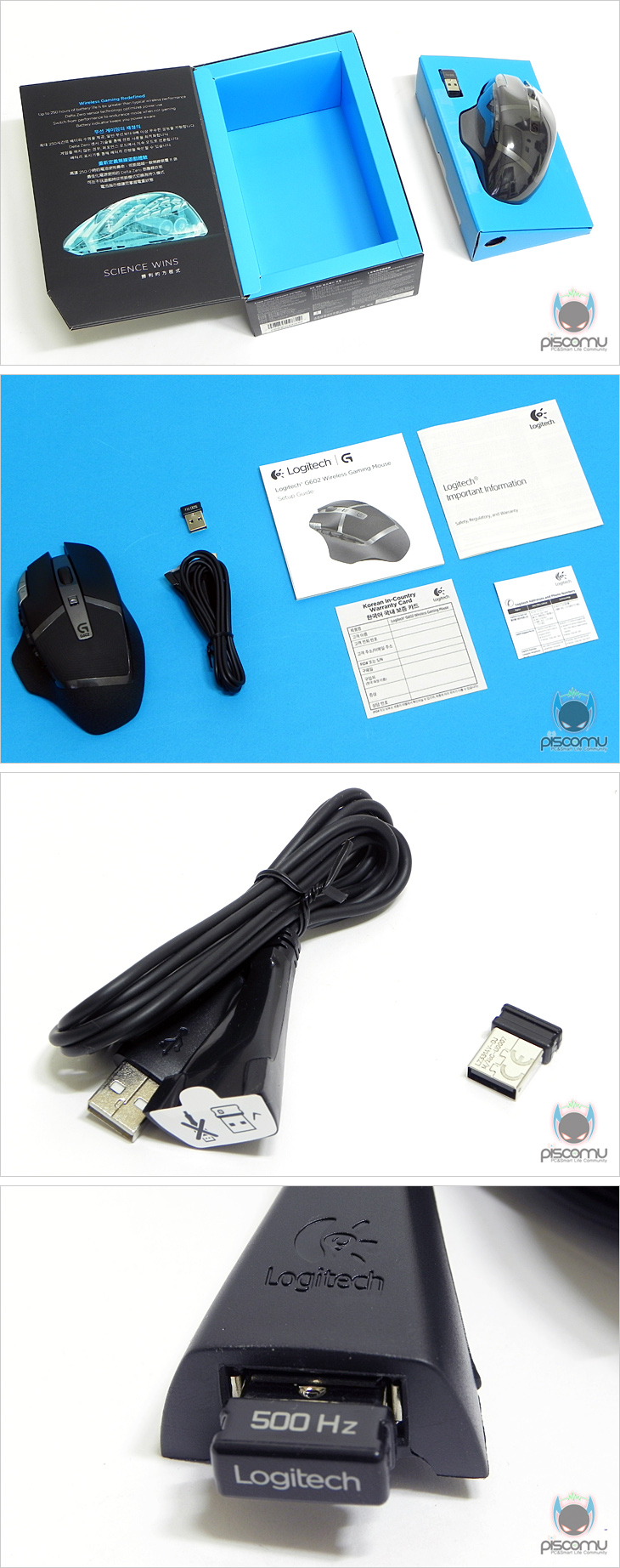 G602 제품 박스 전면에는 해당 모델의 이미지가 삽입되어 있는데, 외/내부 반반씩 보여주는 디자인입니다. 그리고, 해당 모델은 게이밍 라인업이기 때문에, 제조사 로고와 함께 게이밍 로고가 표기되어 있으며, 모델명을 확인할 수 있습니다. 다른 게이밍 마우스들과 마찬가지로 G602 역시 전면 커버가 오픈 되어 내부에 포장된 제품을 간접적으로 확인할 수 있습니다. 그리고, 커버 안쪽에는 제품의 특징을 소개하고 있는데, 배터리 수명과 제조사의 센서 기술, 모드 지원을 언급하고 있습니다. 박스 측면에는 각각 기본 스펙과 구성품 목록, 운영체제 지원을 확인할 수 있는데, 스펙에선 해상도, 가속, 속도, 배터리 수명, 수신 범위 등을 확인할 수 있는데, 250시간의 배터리 수명이 단연 눈에 가장 띄겠습니다. 그리고, QR코드를 삽입해 스마트폰/타블렛PC로 제조사 홈페이지에 등록된 제품에 추가 정보를 얻을 수도 있겠습니다. 박스 후면에는 제품 이미지를 통해 부위별로 추가 특징을 소개하고 있는데, 추가 버튼 지원, 배터리 수명, 센서를 언급하고 있으며, 해상도, 버튼 수명도 언급을 하고 있습니다. 그리고, 제품 보증 기간은 3년이 되겠습니다. 제품 포장은 속박스를 적용한 형태로 제품이 포장된 박스는 따로 분리가 되며, 본 제품인 마우스를 비롯한 제품 구성에는 USB 수신기, USB 연장 케이블, 제품 설명서, 보증서로 이루어져 있습니다. USB수신기 연장 케이블의 길이는 약 1.6m이며, 장소에 따라 사용 여부를 사용자가 결정하면 되겠습니다.