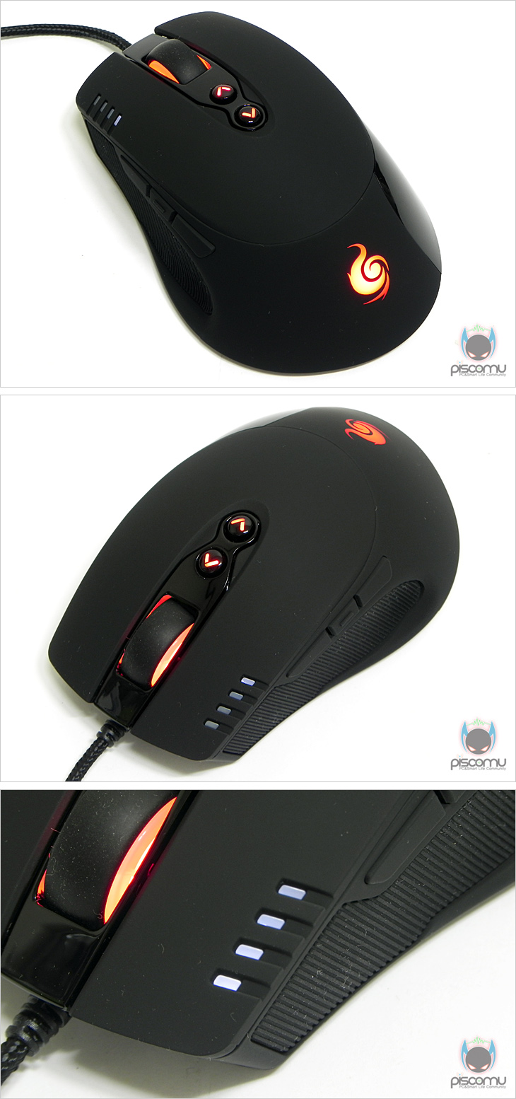 HAVOC을 살펴보면, 색상은 전반적으로 블랙계열이며, 버튼과 손바닥 그립 부분의 마우스 상위 부분은 러버 코팅으로 처리가 되어 있으며, 좌우 비대칭 형태로 오른손 전용을 위한 인체공학적 디자인을 갖추고 있음을 확인할 수 있습니다. 기본 좌우 버튼은 앞서 제품 박스에서 소개했듯이, 일본 옴론(OMRON)사 스위치가 적용되어 최대 5백만 번의 클릭 수명을 가지고 있으며, 왼쪽 버튼 가장자리에는 DPI값을 표시해주는 LED 램프가 처리되어 있습니다. DPI 변경 버튼은 휠-버튼 뒤에 배치되어 총 4단계로 변경할 수 있습니다. 휠-버튼은 손가락이 닿는 부분은 고무 재질을 사용했으며, 측면은 역시 LED효과를 볼 수 있도록 처리했습니다. 그리고, 손바닥 부분의 팜-레스트 부분에는 CM STORM 로고가 새겨져 역시 LED 효과를 볼 수 있게 지원하고 있습니다. 마우스 측면을 살펴보면, 우측은 광택 처리가 되어 있는데 광택 처리가 그대로 이어지는 부분은 전면과 휠-버튼 주변까지 되겠습니다. 좌측은 고무 재질 적용과 일정 간격의 패턴 문양이 처리되어 엄지 손가락에 의한 미끄럼 방지를 통한 그립감을 높이도록 했습니다. 그리고, 좌측에는 추가 버튼이 3개 배치되어 있는데, 앞에 2개는 기본 기능으로 웹-페이지 앞/뒤 기능이며, 나머지 1개는 프로파일 변경 기능을 기본으로 설정되어 있겠습니다. 마우스 밑면에는 좌우뒤자리에 큼지막한 테프론 피트를 기본 부착에 움직임에 유연성을 가지도록 했으며, 가운데 레이저 센서부분은 제품 박스에서 소개했듯이, PixArt의 ADNS-9800 센서가 적용되어 최대 해상도 8200DPI까지 지원해줍니다. 끝으로, 케이블 길이는 최대 1.8m로 유선으로 충분한 길이를 가졌으며, 깔끔하게 전체 패브릭 슬리빙 처리를 했으며, 연결 인터페이스 방식은 USB로 신호손실을 적게하도록 금도금 처리를 적용했습니다. 전송제어 속도는 1000Hz 최대치까지 지원합니다.