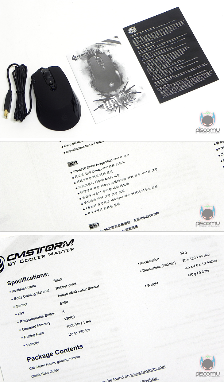 제품 박스는 기존의 자사 CM STORM 라인업 마우스들과 유사합니다. 해당 제품의 이미지 삽입과 모델명을 전면에서 확인할 수 있는데, 모델명에 해상도 범위도 표기가 되어 있어 이번 제품의 주요 특징임을 짐작할 수 있습니다. 이번 제품 역시 기존 자사 제품들처럼 전면 커버가 열리는 오픈 방식에 내부 포장된 해당 제품 마우스를 간접적으로 확인할 수 있습니다. 그리고, 커버쪽 내부에는 마우스 이미지와 함께 부위별로 제품 특징을 언급하는데, 컬러 LED, DPI, 내장 메모리, 버튼 스위치, 버튼 지원 수, 측면 그립 코팅 처리에 대해 언급하고 있습니다. 박스 측면에는 해당 제품의 추가 정보를 위해 자사 웹-사이트 주소를 알려주고 있으며, 운영체제 지원도 확인할 수 있습니다. 그리고, 박스 후면에는 제품 특징을 소개하는데, 센서와 스위치 제조사 언급까지 상세히 설명을 하고 있으며, 케이블 길이, 마우스 크기 표기도 눈에 들어오겠습니다. 제품 구성은 마우스를 비롯해, 설명서, 보증서로 간단히 이루어져 있으며, 설명서에는 한글 표기의 제품 특징과 제품의 기본 스펙 정보를 확인할 수 있습니다.