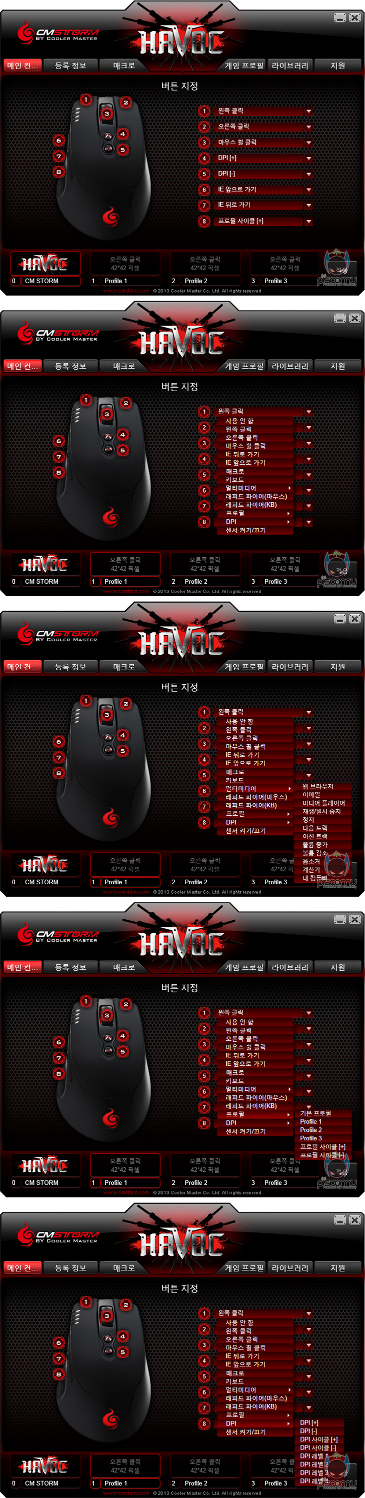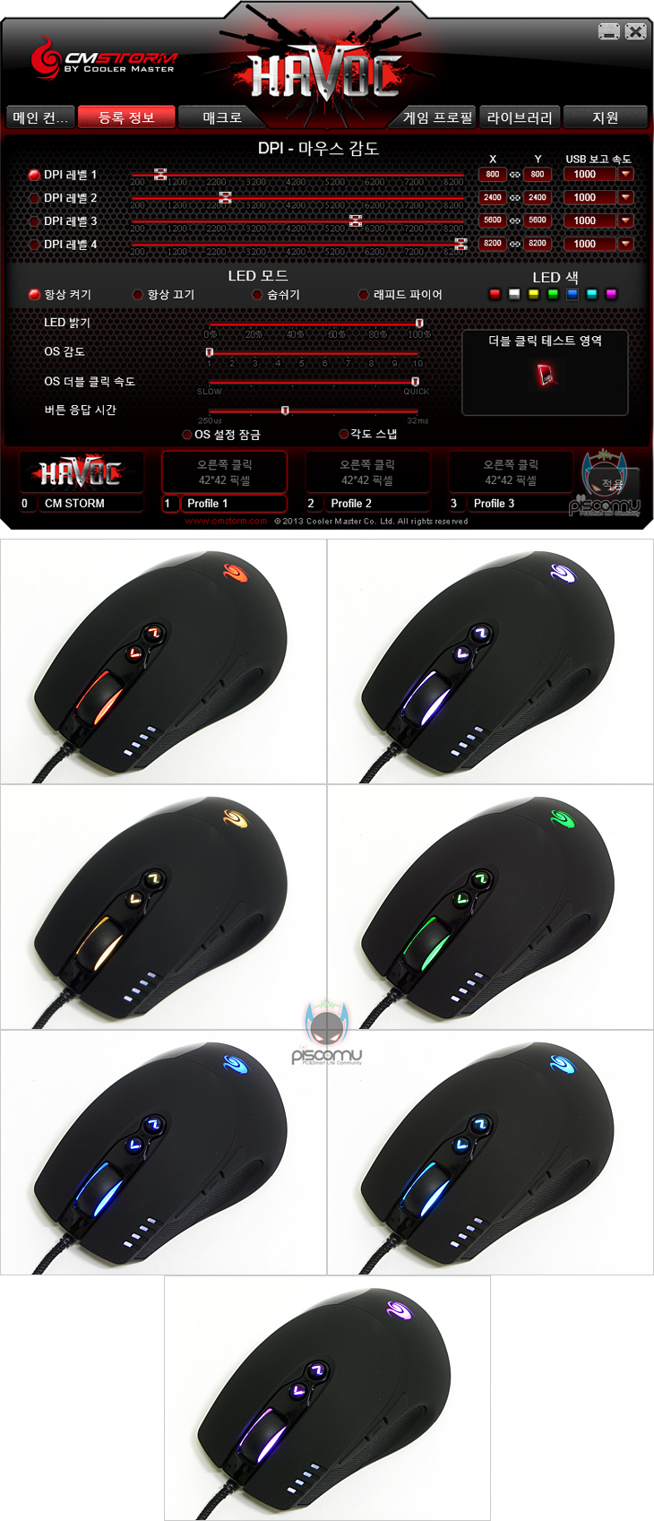 CM STORM은 그 동안 출시되는 마우스 제품마다 전용 소프트웨어를 제공했는데, 이번 HAVOC 역시 전용 소프트웨어를 제공하고 있습니다. 프로그램은 홈페이지를 통해 다운로드(http://www.cmstorm.com/en/support/downloads/167/) 받을 수 있습니다. 프로그램을 설치한 수 실행하면 메인화면에서 버튼 지정과 프로파일 지원을 확인할 수 있는데, 기본 프로파일에서 설정 변경이 불가능하며, 프로파일 1부터 각 버튼이나 기능들을 설정할 수 있습니다. 버튼 지정에서는 각 버튼의 기능들을 사용자가 변경할 수 있고, 추가적으로 멀티미디어, DPI, 프로파일 세부설정까지 지정할 수 있습니다. 등록정보 메뉴를 통해서는 DPI 해상도 변경을 설정할 수 있는데, 100부터 8200까지 100단위로 조절이 가능하며, 총 4개 값으로 지정할 수 있습니다. 또한, LED효과도 모드 변경을 할 수 있고, 색상 변경도 가능한데, 색상은 총 7가지를 지원하고 있습니다. 모드는 On/Off 외에 펄스(숨쉬기)와 래피드 파이어 2가지를 추가 지원해주고 있으며, 밝기 조절도 가능하겠습니다. 이 외에 더블 클릭 속도, 반응 속도, 감도 설정도 할 수 있습니다. 이 외에도 프로그램을 통해서는 게임 매니아를 위한 매크로 설정 지원과 128KB 내장 메모리 지원으로 인한 많은 프로파일 생성/저장, 라이브러리, 지원을 지원 갖추고 있어, 사용자가 원하는 최적의 환경 설정 지정할 수 있겠습니다.