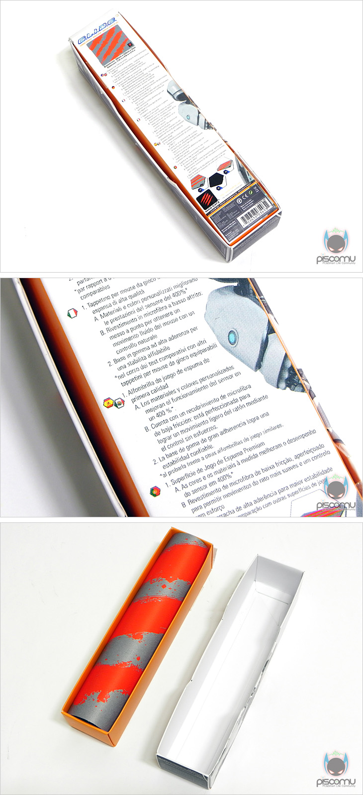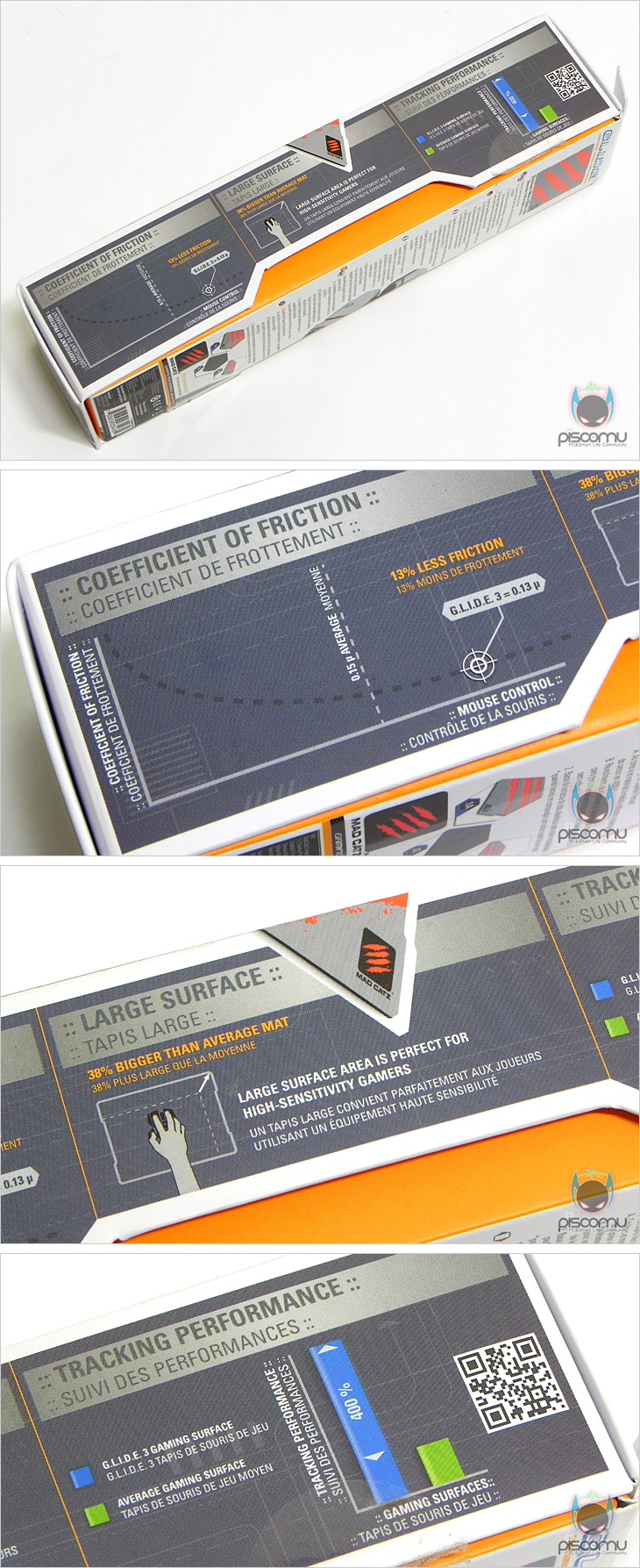 가격이 싼 일반 마우스 패드들은 대부분 단순히 비닐 포장식으로 되어 있지만, 게이밍 브랜드에서 출시되는 마우스 패드들은 박스가 원통형으로 포장이 되는 경우가 많습니다. G.L.I.D.E 3 역시 박스형태로 포장되어 게이밍 브랜드 차별화를 주었습니다. 그리고, 박스 일부는 내부에 포장된 실제 제품의 패드 촉감을 느낄 수 있도록 노출을 해놨으며, 제품 특징과 모델명, 크기 표기를 확인할 수 있습니다. 측면에는 제품의 특징을 소개하고 있는데, 13% 줄어든 마찰력, 38%의 넓은 슬라이딩 효과, 400% 향상의 트래킹 성능을 언급하고 있습니다. 게임 매니아라면 구입 전 좋은 정보가 되겠습니다. 후면에는 각 나라별로 제품 특징을 소개하는데, 한국어는 포함되어 있지 않습니다. 포장은 간단하게 박스 크기에 맞춰 말아서 포장되어 있습니다.