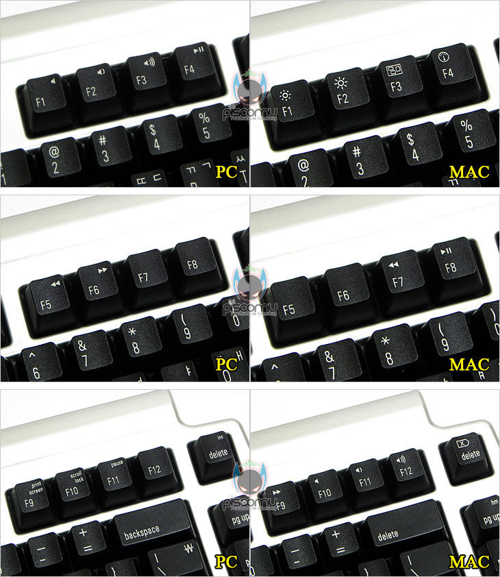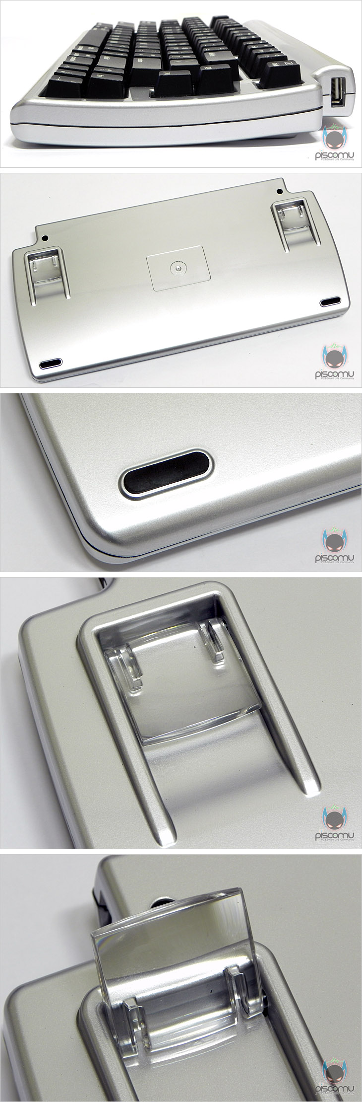 이 외에도 Fn키 조합의 부가 기능에서도 차이를 두고 있는데, 앞서 확인했듯 일반 PC(윈도우) 경우 미디어 관련 키가 F1~F6키에 적용된 반면, 맥 버전은 F7~F12키에 적용되어 있으며, 추가적으로 맥 버전의 F1~F4키에는 밝기 조절과 검색 기능이 적용되어 있습니다. 이왕 반대로 앞서 말했듯, 일반 PC 버전에는 F9~F11키에 특수 키 기능이 함께 적용되어 있겠습니다. 키보드 측면을 통해 키 상하 배열을 보면, 기본 높이에서부터 스텝스 컬쳐 방식으로 되어 있어 타이핑에 편안함을 주겠습니다. 물론, 앞부분에 받침 조절대가 지원되기 때문에 사용했을 시에 좀 더 편안하겠습니다. 키보드 밑면에는 미끄럼 방지를 위해 고무 패드를 기본 부착했으며, 방금 말했듯, 앞부분에는 높낮이 조절의 받침 조절대가 지원되는데, 제품 디자인과 애플사의 디자인과 어울리게 투명 처리를 했습니다.