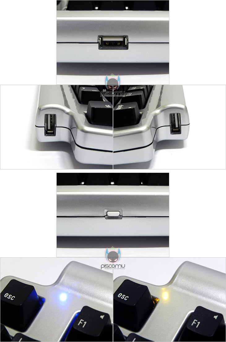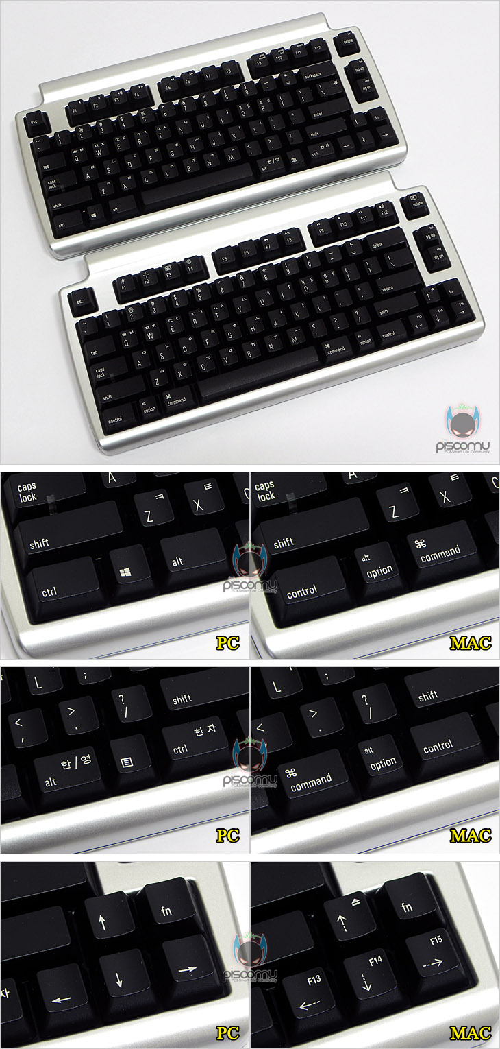 랩탑 프로(Laptop Pro)를 살펴보면, 가장 먼저 눈에 들어오는 부분은 전체적인 사이즈로 일반 키보드 작은 컴팩트 사이즈를 가지고 있습니다. 쉽게 말해, 오른쪽 숫자 키패드가 빠진 텐키리스와 비슷한 형태입니다. 전체 키 개수는 81키입니다. 베젤 형태는 실버색상의 하우징 형태로 처리가 되었으며, 전면이 두툼한 이유는 내부 배터리가 내장된 위치이기 때문입니다. 배터리 용량은 1500mAh입니다. 또한, 전면에는 USB 포트 3개를 지원하고 있는데, 전면 오른쪽과 전면 좌/우측에 각각 배치되어 있습니다. 그리고, 전면 가운데는 블루투스 사용을 위한 연결(페어링) 버튼으로 연결 작동 유무는 왼쪽 상위에 LED 램프 상태로 오렌지/블루 색으로 확인할 수 있습니다. 기본 자판 키 캡에는 한국 시장에 맞게 한글 레이아웃으로 적용되어 있으며, 레이저 각인으로 오랜 타이핑에도 지워지지 않겠습니다. 그리고, 왼쪽 Caps Lock키에는 LED가 적용했으며, 맨 오른쪽에는 특수 키와 Fn(펑션) 키가 배치되어 있는데, Fn키 조합으로 상위에 배열된 F1~F6키까지 음소커, 볼륨 조절, 재생 제어 기능을 지원하고 있으며, F9~F11키에는 특수 키 기능을 함께 지원하고 있는데, 역시 Fn키 조합으로 사용을 해야하겠습니다. 그리고, 랩탑 프로(Laptop Pro)에 적용된 스위치는 제조사에서 자체 개발한 스위치지만, 기본 바탕은 그 동안 제조사에서 자사의 모델들에 선보였던 알프스사의 스위치입니다. 현재, 대부분의 기계식 키보드에는 독일 체리(Cherry)사의 스위치가 적용되고 있지만, 제조사인 마티아스(Matias)는 예전부터 알프스사의 스위치를 고집했습니다. 그리고, 스위치가 단종된 이후에도 자체적으로 알프스 스위치를 연구 개발해 자사 모델에 계속 유지하고 있으며, 이번 랩탑 프로(Laptop Pro)에 적용된 스위치 역시 유사 알프스 스위치이면서 소음을 줄인 저소음 사일런스 버전이 되겠습니다. 실제, 제조사에선 해당 제품의 스위치 관련 비교 소음을 제공하고 있습니다. 그리고, 국내 출시되는 랩탑 프로(Laptop Pro) 버전은 기본 맥(Mac) 버전과 일반PC버전으로 출시되는데 두 제품의 차이는 먼저, 운영체제가 다르기 때문에 운영체제에 따른 기본 키가 일부 다른데, Ctrl, 윈도우 키, Alt 키가 윈도우 운영체제에 맞게 적용되어 있으며, 맥 버전으로는 방향키에 추가 기능이 함께 있습니다.