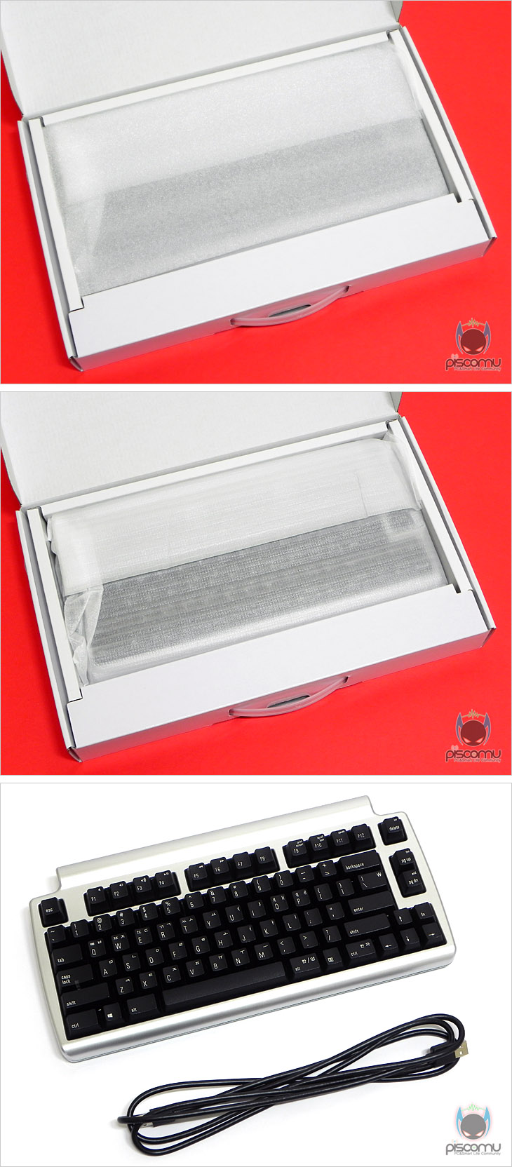 일단, 제품 박스에 해당 제품의 이미지가 삽입되어 있어, 간접적으로 디자인 확인과 크기를 짐작할 수 있습니다. 컴팩트한 사이즈를 가졌기 때문에 박스 자체는 크기 않으며, 모델명과 함께 ‘세계에서 가장 조용한 무선 기계식 키보드’라는 컨셉 문구를 확인할 수 있습니다. 또한, 이동 시 편의를 위해 손잡이 처리가 되어 있으며, 박스 후면에는 제품 이미지와 함께 제품 특징을 소개하고 있는데, 블루투스 무선 지원과 적용된 스위치의 저소음에 대해 언급을 하고 있습니다. 앞서 소개에서 국내에선 기본 맥(Mac) 버전과 일반 PC버전 2가지로 출시된다고 했는데, 박스를 단순히 겉으로 봤을 때는 구분을 찾을 수 없지만, 박스 측면에 모델명표기에 구분을 해놓고 있습니다. 제품 포장은 깔끔하게 완충제와 키보드 포장까지 잘 되어 있으며, 제품 구성은 간단하게 키보드와 배터리 충전 시 사용될 USB 전원 케이블(길이 2m) 제공으로 이루어져 있습니다.
