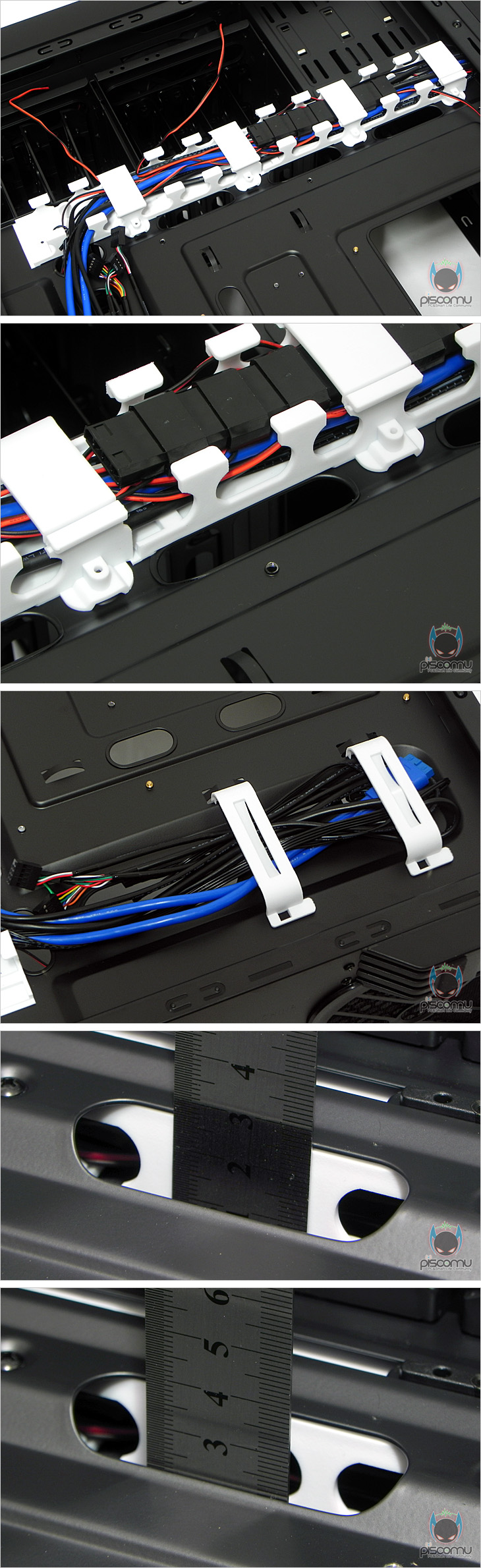 이제, L5000의 내부를 살펴보는데, 내부 도색 역시 외부와 같은 블랙으로 통일을 했으며, 메인보드가 장착되는 트레이에는 기본적으로 CPU 컷 아웃과 선정리 홀이 적용되어 있는데, 특히 선정리 홀 경우엔 M-ATX 플랫폼 메인보드를 장착했을 때를 고려한 홀 처리도 함께 되어 있습니다. 그리고, 기본 선정리 홀에는 T100 발키리에서 케이블 정리에 아주 유용하게 사용되었던 케이블 레일이 이번 L5000에서도 적용된 것을 확인할 수 있습니다. 케이블 레일과 선정리 홀 모두 사용할 수 있게 배치되어 있어, 이번에도 유용한 사용한 되겠습니다. 또한, 아랫부분에는 남는 케이블을 정리할 수 있는 역시 T100 발키리에서 선보였던 케이블 정리 공간을 적용했습니다. 선정리 공간은 약 22~27mm를 가지고 있어, 케이블 레일과 함께 활용해 모든 케이블을 충분히 정리할 수 있는 공간을 가졌습니다. 내부 상단에는 앞서 외부에서 언급했듯이, 상단 쿨링시스템으로 기본 120mm 팬을 배기 역할로 장착된 것을 확인할 수 있습니다. 이를 통해 상단 베젤 후면에 처리된 에어홀 경로로 열이 배출되겠습니다. 팬 장착은 외부에서 했기 때문에, 교체 시에는 상단 베젤을 분리해야 합니다. 그리고, 분리된 상단 베젤을 통해서는 내부에 역시 방음 효과를 위해 방음 패드가 기본 부착된 것을 확인할 수 있으며, USB 3.0 포트 연결 방식은 온-보드 방식임을 확인할 수 있습니다. 내부 후면을 통해서는 역시 외부에서 간접적으로 확인한 배기 역할의 120mm 팬을 확인할 수 있으며, PCI슬롯 가이드는 모두 타공망(메쉬) 처리와 함께 재사용이 가능한 착탈식으로 지원을 했습니다. 그리고, 파워서플라이가 장착되는 하단 받침 부분에는 진동소음 최소화를 위해 고무 패드가 기본 부착되었으며, 앞자리에는 하단 쿨링 역할의 120mm 팬이 기본 장착된 것을 확인할 수 있습니다.