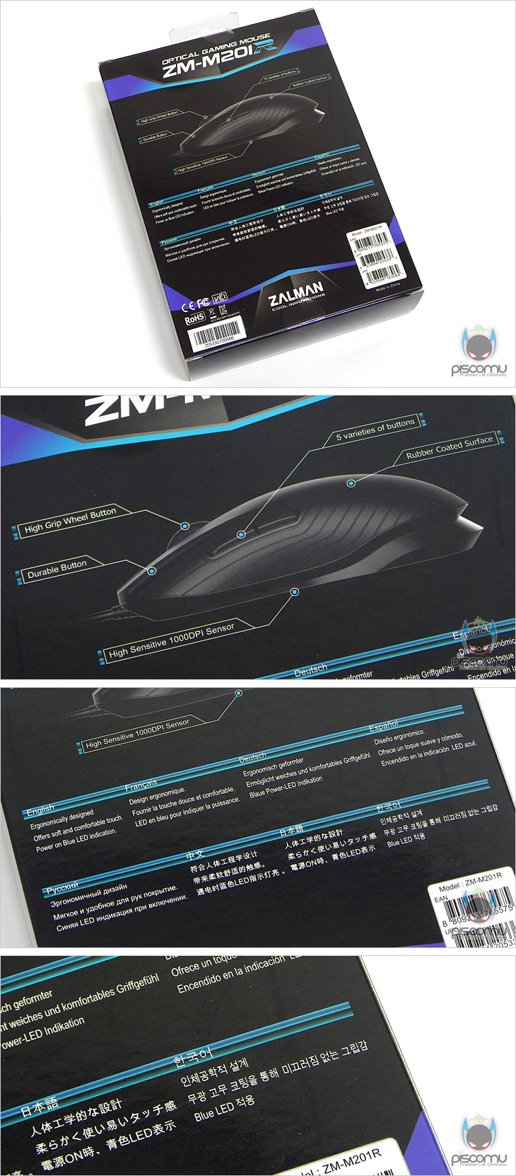 제품 박스는 앞서 출시된 상위 모델인 ZM-M401 레볼루션과 큰 차이는 없으며, 색상은 블루계열로 디자인 되었습니다. ZM-M401 레볼루션이 레드 컨셉, ZM-M201 레볼루션이 블루 컨셉이라는 느낌을 충분히 받을 수 있으며, 팩키지 형태 역시 내부 포장된 마우스를 외부로 노출한 형태입니다. 전면에는 모델명을 확인할 수 있고, 측면에는 각각 제품 컨셉과 기본 스펙 정보를 확인할 수 있습니다. 특징에는 해상도, 게이밍 컨셉, 노이즈 필터 적용을 언급하고 있습니다. 박스 후면에는 제품 이미지와 함께 제품 특징을 소개하고 있는데, 휠-버튼, 기본 버튼, 측면 버튼, 광 센서, 그립 러버 코팅을 언급하고 있습니다. 그리고, 각 나라별 언어 소개에서 한국어도 기본 포함된 것을 확인할 수 있습니다. 제품 포장은 일반 캡(CAP) 형태로 되어 있으며, 제품 구성은 마우스로만 이루어져 있습니다.