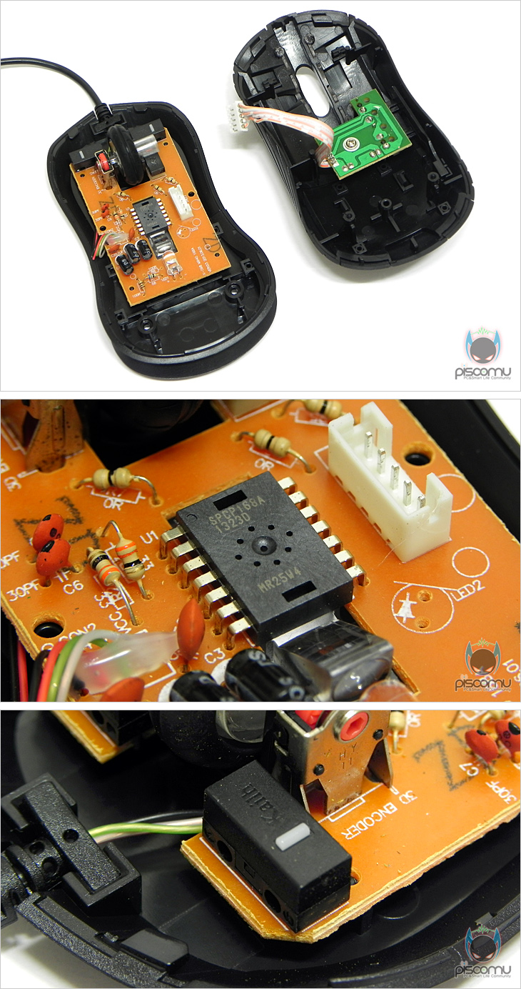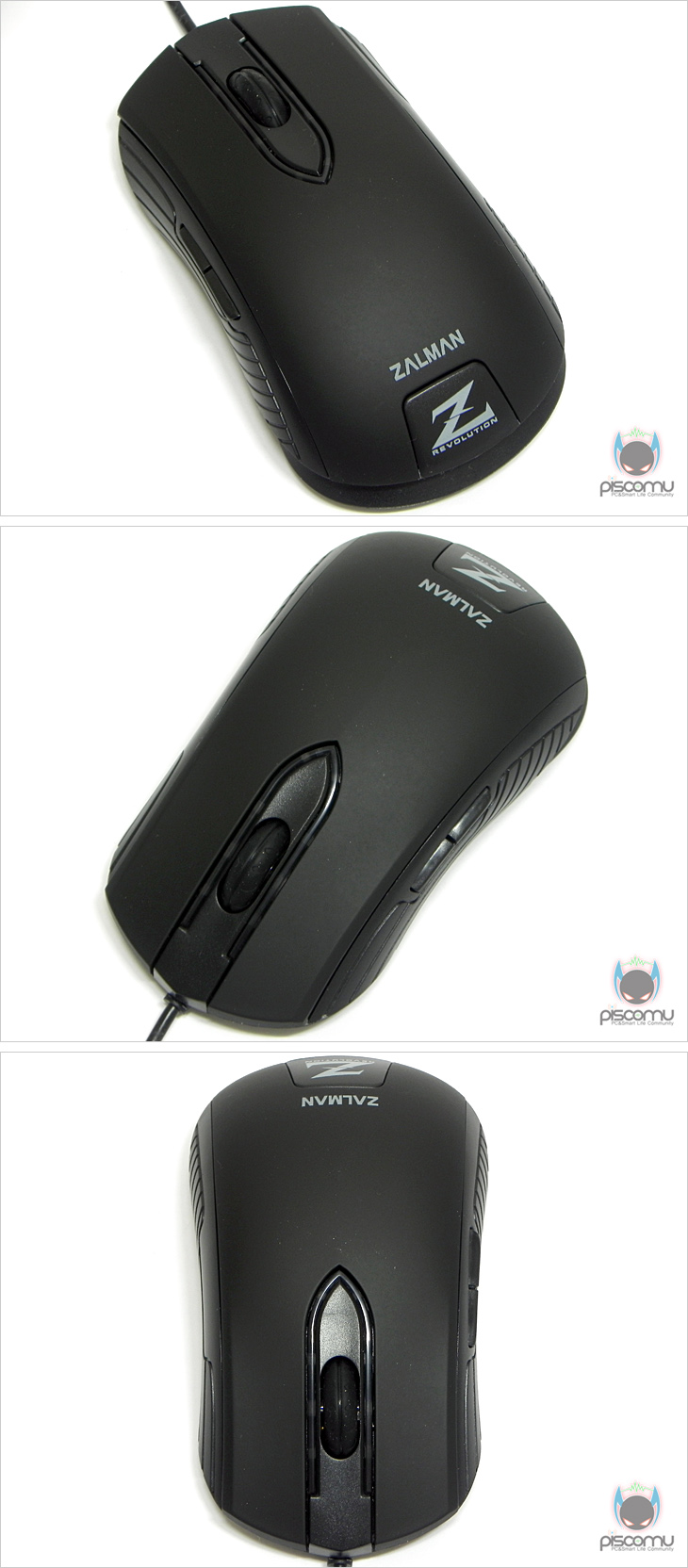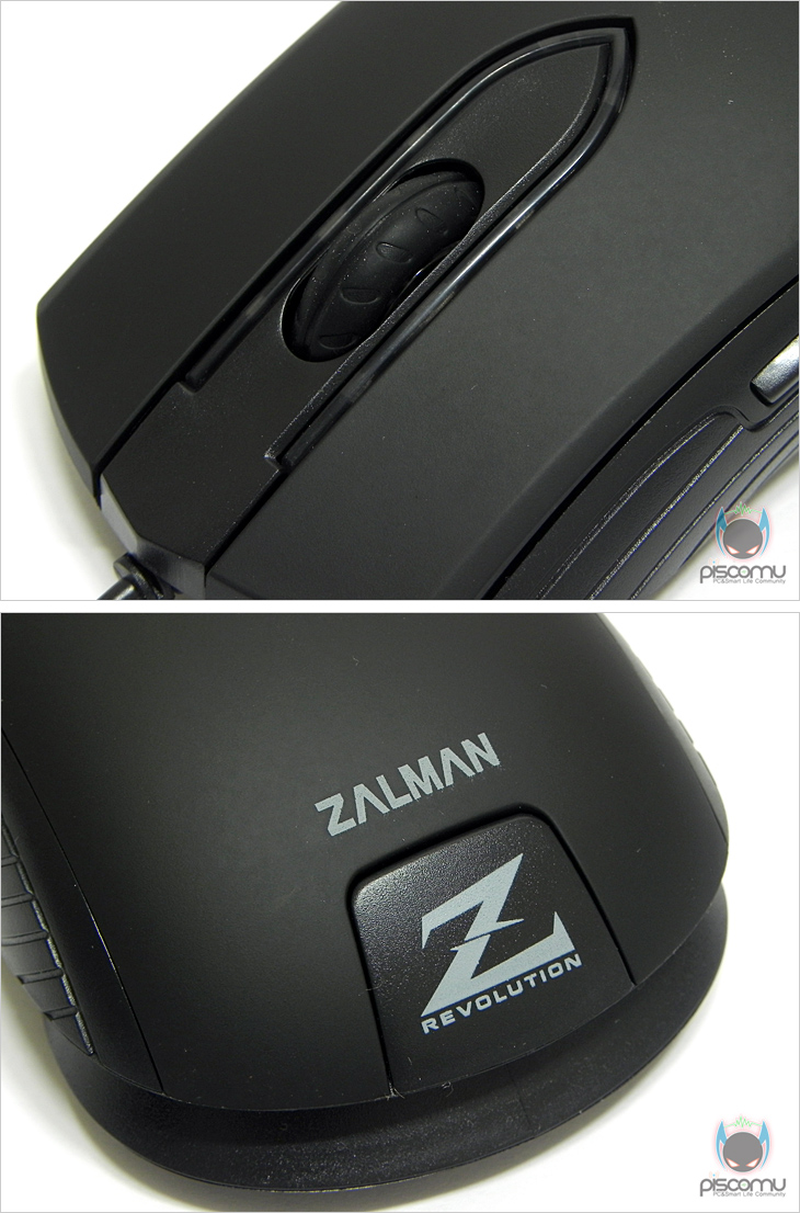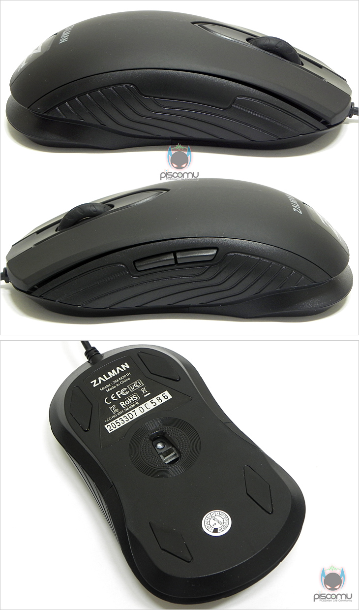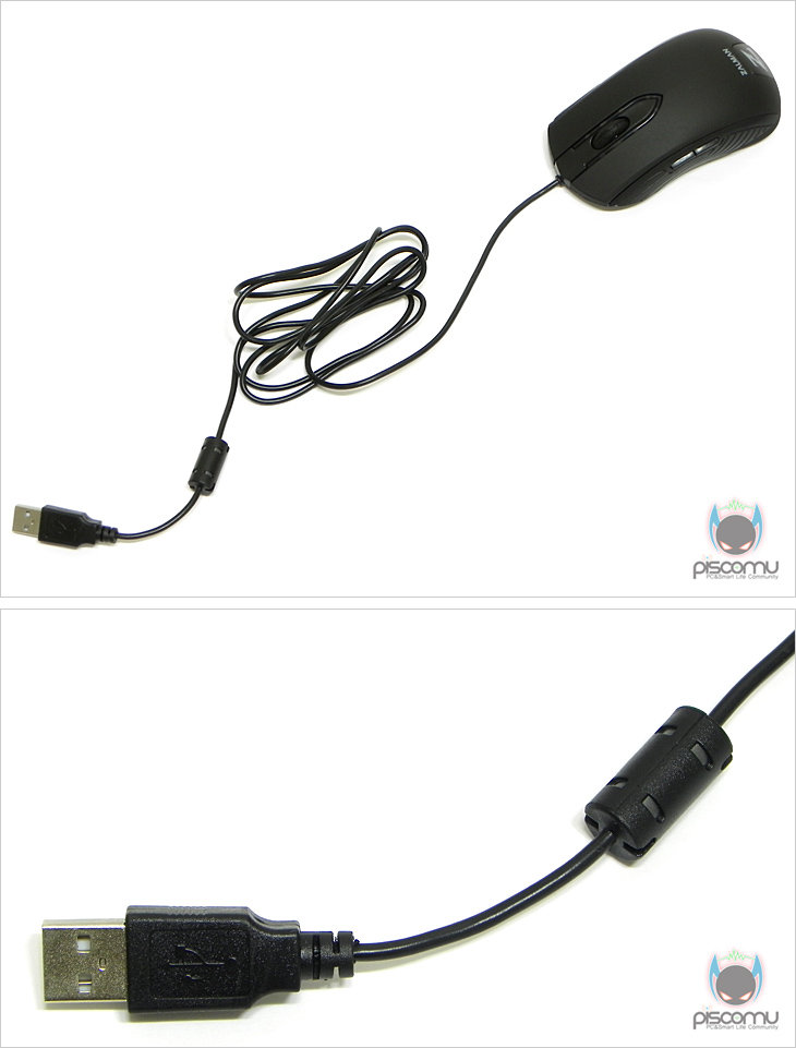 ZM-M201 레볼루션을 살펴보면, 전체적인 색상은 블랙이며, 마우스의 라인 형태는 상위 모델인 ZM-M401 레볼루션과 유사합니다. 또한, 마우스 상위 커버는 러버 재질로 코팅 처리가 되어 있습니다. 마우스는 좌우 대칭으로 왼손/오른손 모두 사용이 가능합니다. 기본 좌우 버튼을 비롯해, 가운데 휠-버튼은 정확한 스크롤을 위해 접지력이 높은 러버 재질로 처리가 되어 있으며, 손바닥 팜-레스트 부분에는 제조사 로고와 레볼루션 로고가 새겨져 있습니다. 측면에는 각각 라인 형태의 엠보싱 디자인을 적용했으며, 왼쪽에는 추가 버튼 2개를 갖추고 있습니다. 기본 기능으로 웹 페이즈 앞/뒤 기능을 가졌습니다. 그리고, 마우스 밑부분에는 부드러운 움직임을 위해 앞뒤 자리에 기본 테프론 피트를 부착해놨습니다. 마우스 내부를 잠깐 살펴보면, 기본 좌우 버튼 스위치는 Kailh사 스위치를 사용했으며, 1000DPI 해상도를 지원하는 광-센서는 Sunplus사 센서를 사용했습니다. 끝으로, 케이블 길이는 약 1.7m를 가져 유선으로 충분한 길이를 가졌으며, 연결 인터페이스 방식은 USB 방식으로 전송제어 속도는 125Hz를 지원합니다. 그리고, 신호 손실 최소화를 위해 케이블 부분에는 노이즈 필터를 적용했습니다.