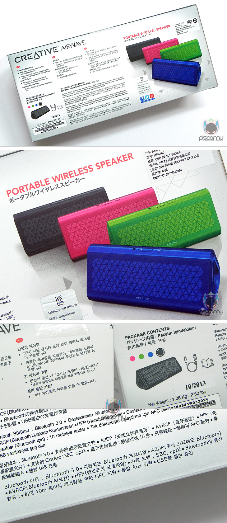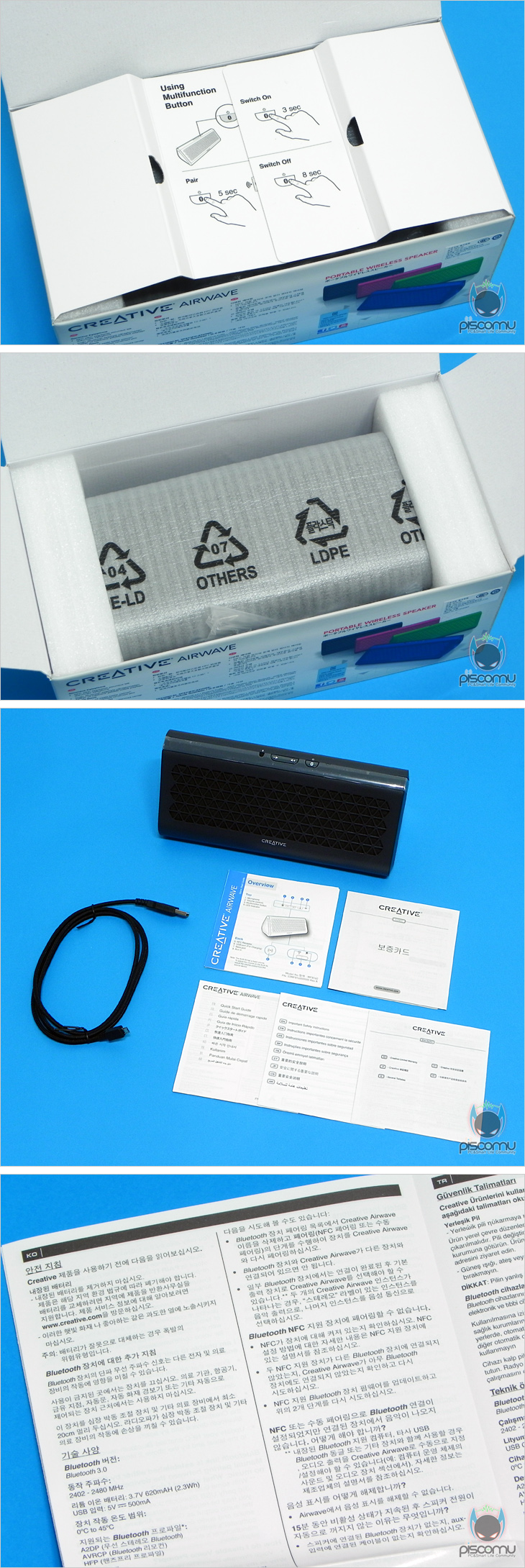 Airwave 역시 무선 스피커 제품으로 포터블 스피커로 분류되기 때문에 휴대성을 가지고 있다라는 점에 제품 박스는 비교적 작습니다. 전면에 제품 디지인을 쉽게 확인할 수 있어, 구입에 도움이 되겠으며, 무선 스피커 문구를 비롯해 블루투스, NFC, aptX 코덱, USB 충전 방식, 12시간 배터리, 마이크 지원을 확인할 수 있습니다. 그리고, 제품 호환은 기본PC를 비롯해 타블렛PC, 스마트폰까지 지원하고 있음을 알 수 있습니다. 박스 한 측면에도 전면과 동일한 내용을 담고 있으며, 반대편은 무선 기능과 배터리 사용 시간, 마이크 기능에 대해 언급하고 있습니다. 또한, 제품 판매에 대한 신뢰감으로 동봉 스피커가 적용된 것을 확인할 수 있습니다. 박스 뒷면에선 제품 색상에 대해 확인할 수 있는데, 이번 모델은 그레이, 핑크, 그린, 블루 4가지를 갖추고 있습니다. 그리고, 각 나라별 언어로 제품 소개를 간단히 하는데 한국어도 포함이 되어 있는 것을 확인할 수 있습니다. 제품 포장은 깔끔하게 잘 되어 있는데, 개봉 시 무선 연결 방식 표기를 간단히 해놨으며, 스피커는 보호 비닐 포장에 흔들리지 않게 양쪽 우레탄-폼을 끼워 포장해놨습니다. 스피커를 비롯한 제품 구성은 USB 충전 케이블, 제품 설명서 및 보증서로 이루어져 있습니다. 사용 설명서에는 한국어가 포함되어 있습니다.