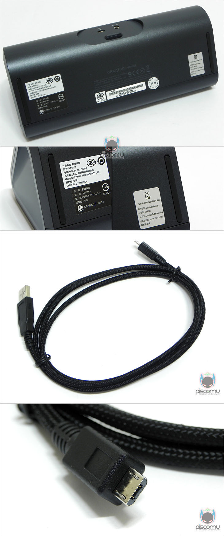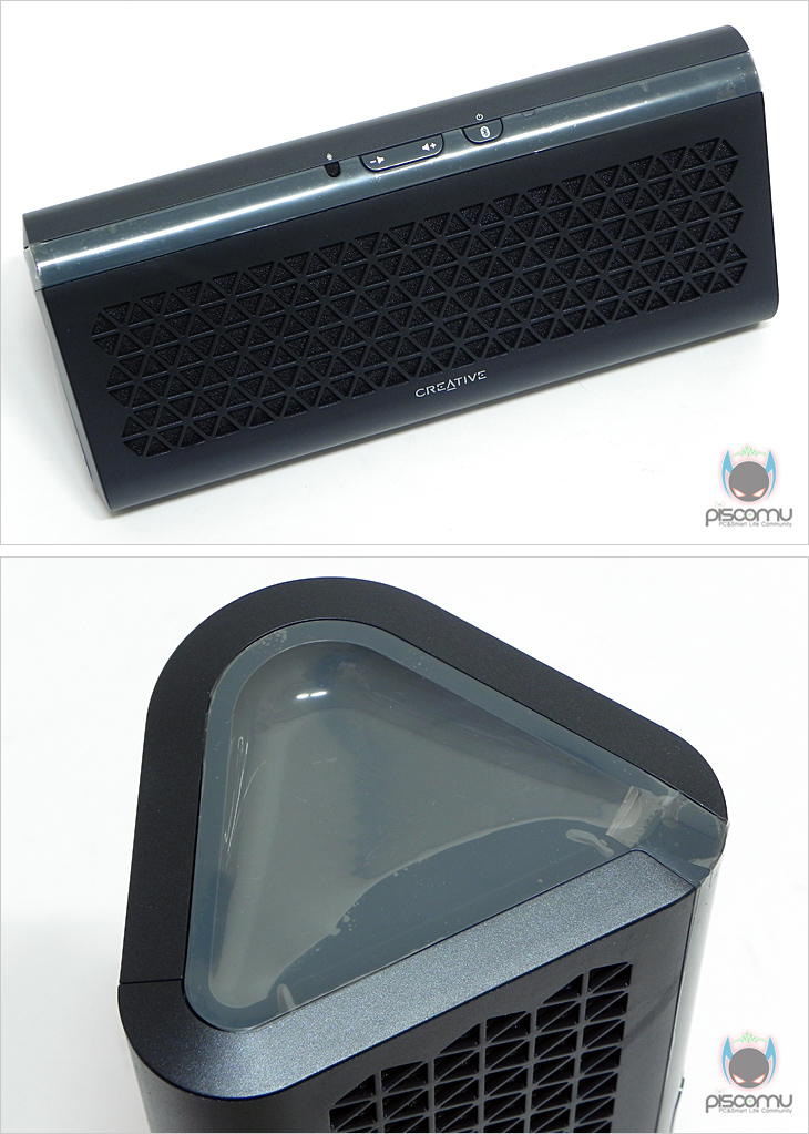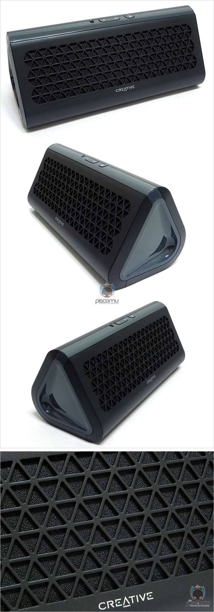 Airwave를 살펴보면, 제품 개봉 시, 상위 버튼 라인과 측면 삼각 디자인 부분은 광택처리가 되어 있어 보호 비닐이 부착되어 있습니다. 쉽게 말하면, 밝은 그레이 색상 영역은 광택 처리가 되어 있습니다. 디자인 형태는 삼각통 모양으로 정삼각형 모양을 가져 높이와 깊이 길이는 110mm로 동일하며 옆으로의 길이는 260mm가 되겠습니다. 무게는 890g입니다. 그리고, 전면 사운드 출력부 디자인 역시 전체 디자인과 통일된 느낌으로 베젤 부분을 삼각 에어홀 형태로 처리했습니다. 상단 부분 가운데 위치에는 사용이 편하도록 버튼이 배치되어 있는데, 볼륨 조절과 전원/페어링 버튼이 있으며, 내장 마이크도 배치되어 있습니다. 후면에는 NFC(근거리 무선) 표기와 함께 하단에 USB 충전 케이블과 연결되는 USB 미니 5핀 포트와 외부 기기와 연결할 수 있는 AUX IN 포트(3.5mm)가 있습니다. 배터리는 내장 리튬 배터리로 충전 시간은 2~3시간, 사용 지속은 12시간 가능하겠습니다. 스피커 밑부분에는 미끄럼 방지를 위해 양쪽 모서리 부근에 고무 패드를 기본 부착해놨습니다. USB 충전 케이블은 총 1.5m 길이에 깔끔하게 슬리빙 처리가 되어 있으며, 스마트폰 충전 포트와 동일한 미니 5핀 규격이라 스피커 외에 동일 포트 규격에 다른 휴대기기에서도 충전 케이블로 사용할 수 있겠습니다.