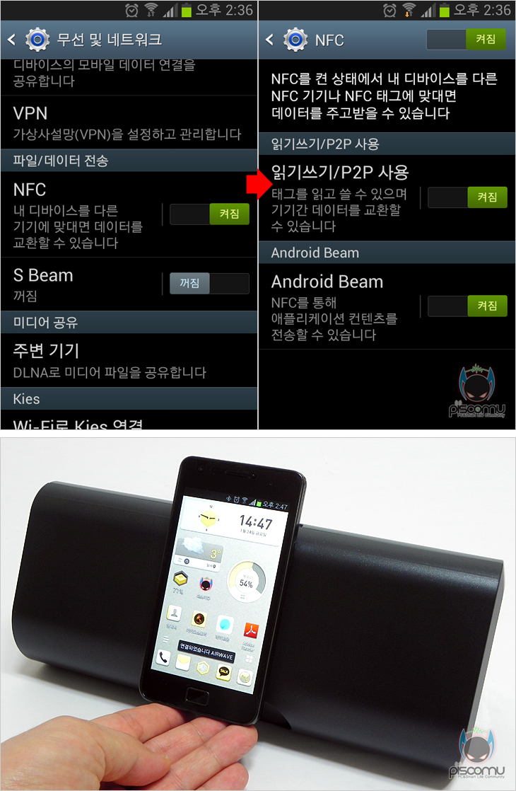직접, Airwave를 사용해보았습니다. 먼저, 연결(페어링) 방법에 대해 이야기하면, NFC 경우엔, 스피커 전원을 한 번 누른 후, NFC를 지원하는 휴대기기 및 모바일 기기에서 NFC 활성화와 활성화 내부에 P2P 활성화까지 한 후, 기기를 스피커 후면 가운데 표시된 NFC부분에 가까이 붙이면 자동으로 페어링 연결이 되겠습니다. 블루투스 경우, 블루투스가 지원되는 기기에 기능을 활성화 한 후, 스피커 전원 버튼을 3~5초간간 누르고 있으면 LED 램프 점등과 함께 음성 지원이 나오면서 연결 모드 상태가 되면서, 블루투스 기기에 검색 목록에 스피커 목록이 뜨면, 연결을 하면 되겠습니다. 스피커 전원을 Off 할 때는 반대로 3~5초간 누르면 LED램프가 레드, 그리고 음성 지원으로도 Off를 알려줍니다. 이 외에 모바일 경우 사용 중 통화가 오면 전원 버튼으로 응답/종료를 할 수 있으며, 오디오 케이블을 사용해 무선 기능이 지원되지 않는 기기도 연결해서 사운드를 즐길 수 있겠습니다. 사운드를 직접 들어보았습니다. 주관적 견해로 사용자마다 차이가 있으니 참고만 하시기 바랍니다. 일단, 볼륨 조절은 총 15단계로, 연결된 기기와는 별도이기 때문에, 스피커 볼륨이 작다고 생각될 때는 기기의 볼륨을 따로 높이면 되겠습니다. 주파수 대역은 55Hz~20kHz로 사람이 들을 수 있는 가청 주파수 즉, 풀-레인지를 지원하는데, 저음 영역은 많이 낮지 않아, 중저음 느낌이 좀 더 강하며, 음질은 선명한 느낌을 줍니다. 이는 앞서 특징에서 확인한 코덱 지원에 CSR사의 aptX 코덱을 지원하기 때문에 스테레오 느낌을 잘 전달해준다 할 수 있습니다. aptX 코덱은 기존 코덱들의 무선에서 대역폭 제한을 해결한 코덱으로 현재 인지도가 있는 중고가 브랜드 무선 음향기기에서 많이 사용되고 있습니다. 음질의 선명도는 볼륨 중간쯤이 가장 좋으며, 볼륨이 높을수록 중저음 베이스 느낌이 약간 있습니다. 하지만, 고음 처리는 매끄럽고, 무선 영역도 좋아 방 한구석에 스피커를 놓고 연결 기기를 어디에 두어도 사운드를 끊김 없이 들을 수 있겠습니다.