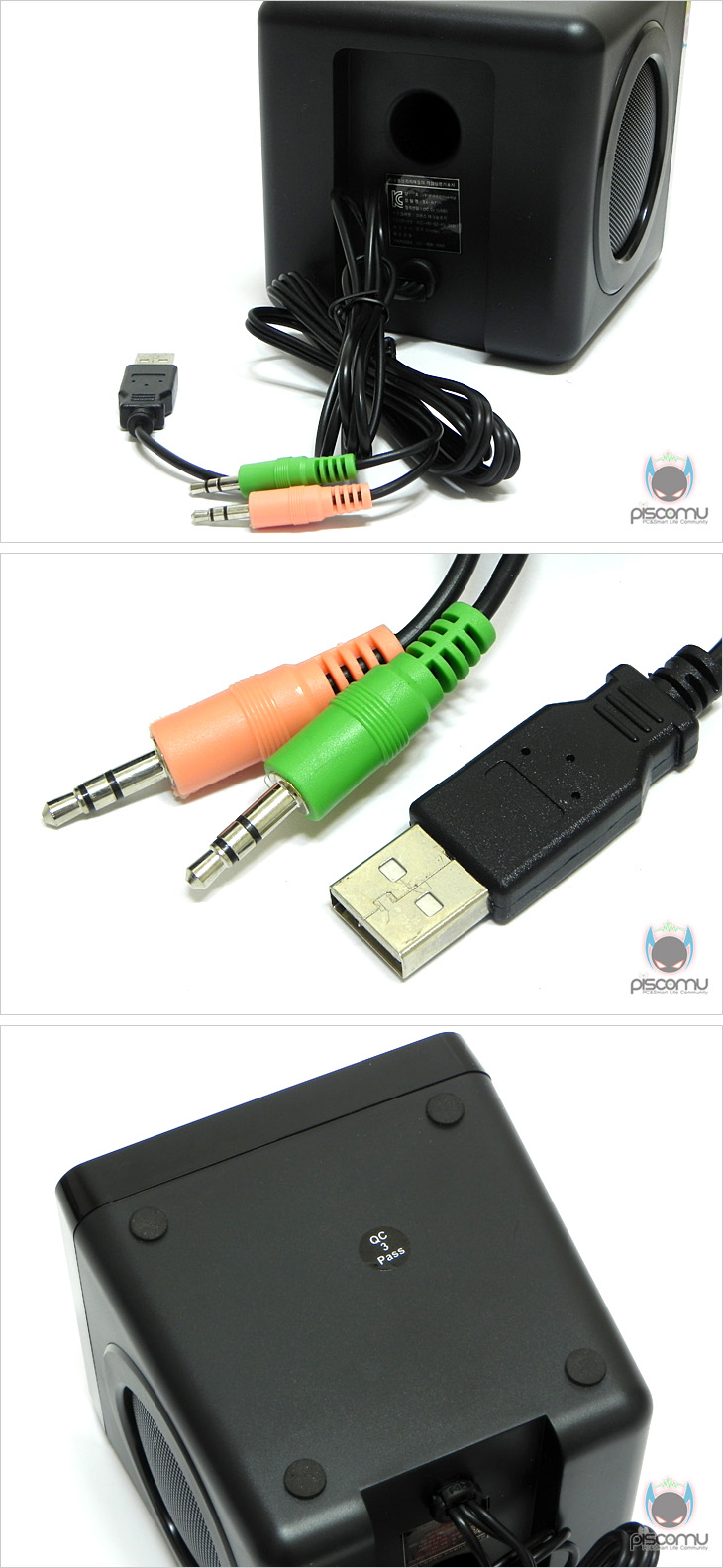 오른쪽 측면에는 포트 배치로 위에서부터 헤드폰, 마이크, 외부 기기(AUX) 입력 단자 순으로 배치되어 있습니다. 그리고, 오른쪽과 왼쪽에 각각 사운드 출력을 위한 메쉬(타공망) 처리가 되어 있는데, 내부에는 좌우 각각 63mm의 드라이버 유닛이 적용되어 있겠습니다. 스피커는 하나 내부에 유닛 2개를 적용해 일체형 2채널 스피커 형태를 갖춘 것입니다. 스피커 후면에는 에어덕트 처리와 전원 케이블, 오디오/마이크 케이블이 적용되어 있는데, 전원 케이블은 USB 방식이며, 오디오/마이크 형태는 잭(Jack) 형태로 규격은 표준인 3.5mm가 되겠습니다. 그리고, 스피커 밑부분에는 미끄럼 방지를 위해 각 모서리 부근에 고무패드를 기본 부착 해놨습니다.